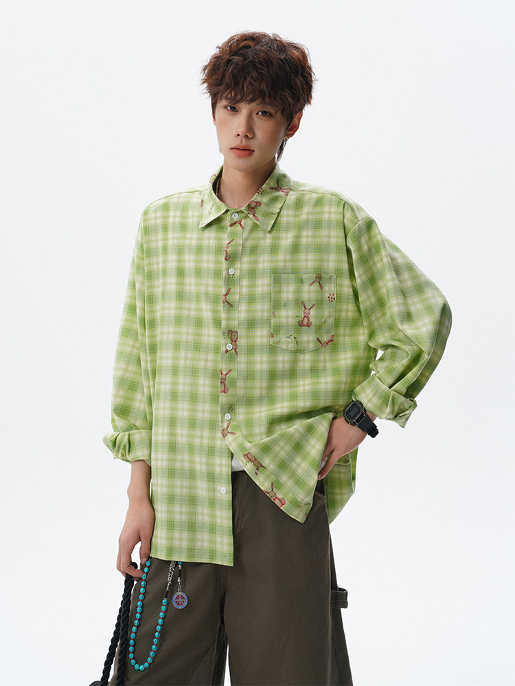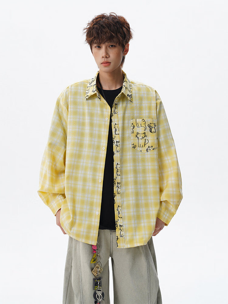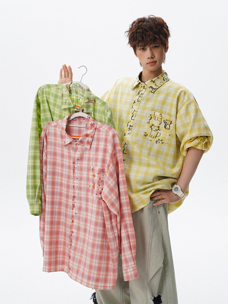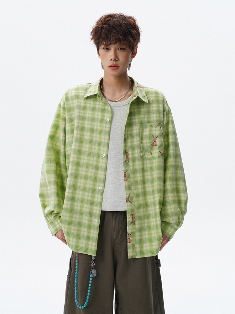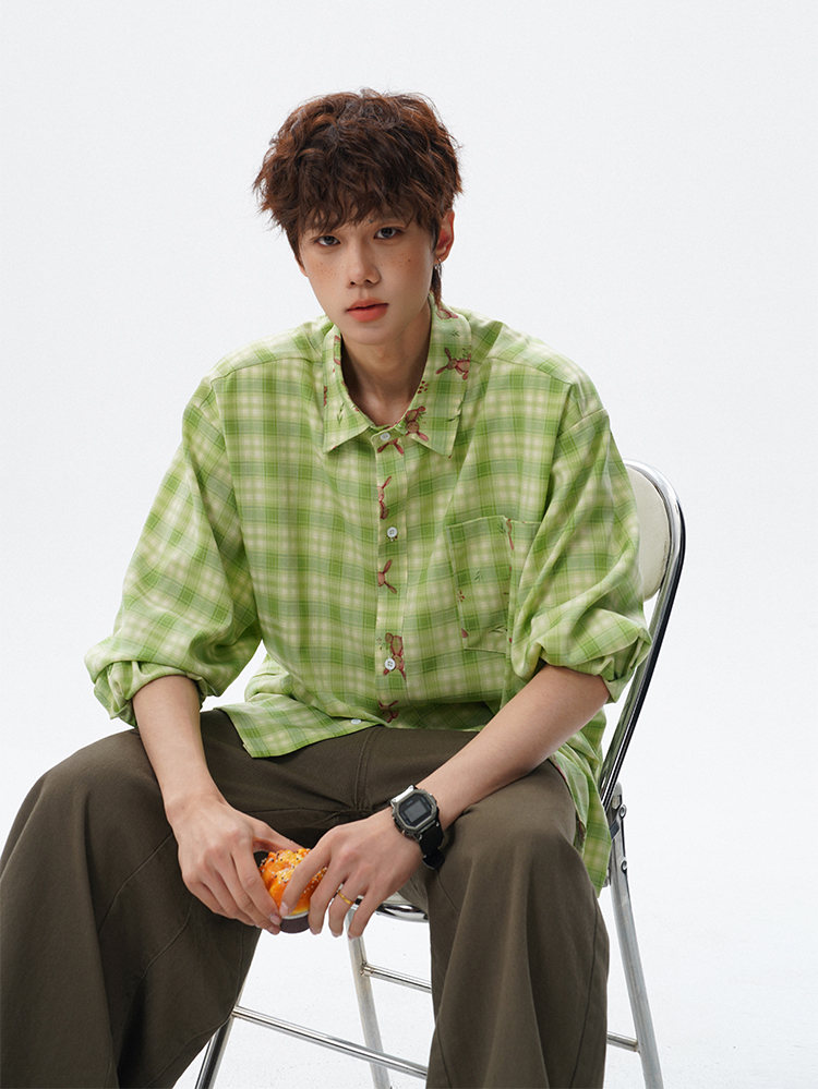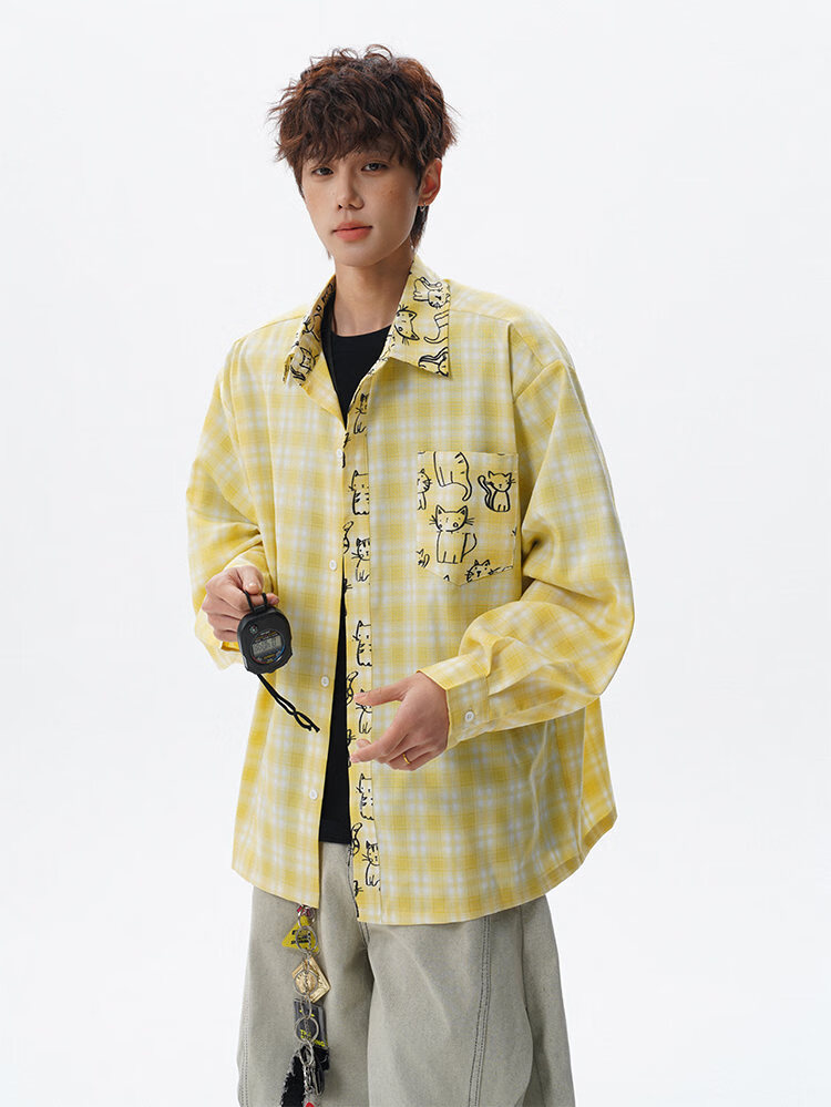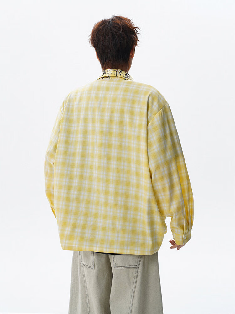NEW OR MODE美式格子印花长袖衬衫男春季新款潮牌宽松拼接高级感冰丝衬衣外套 粉色【高品质】 M 【建议90-110斤】