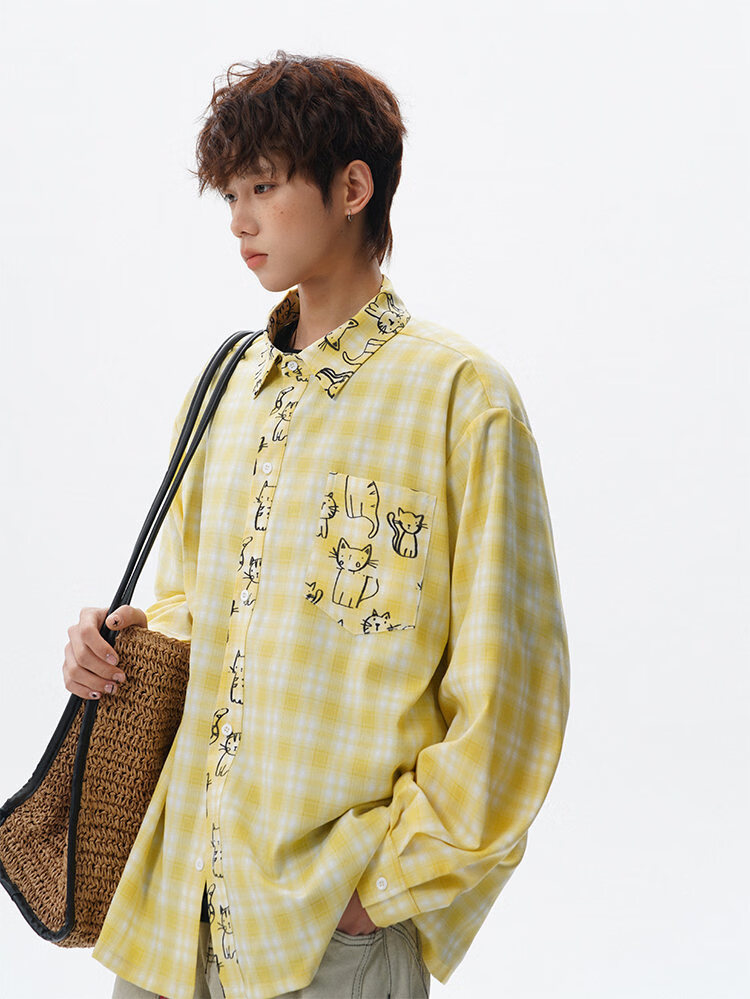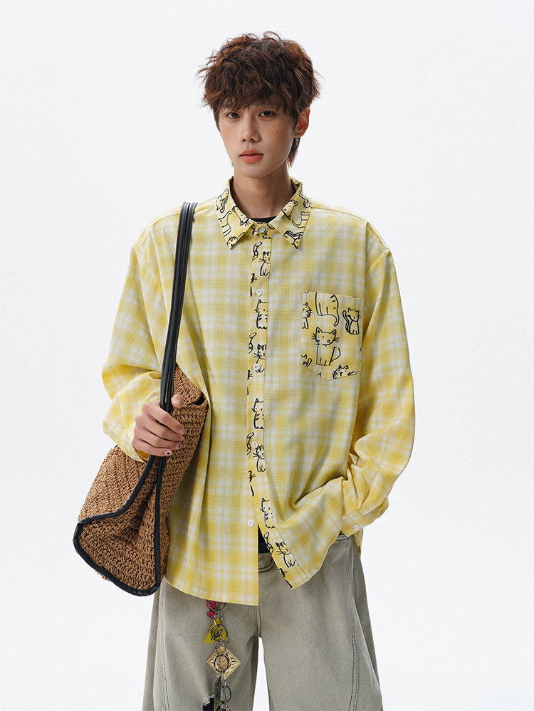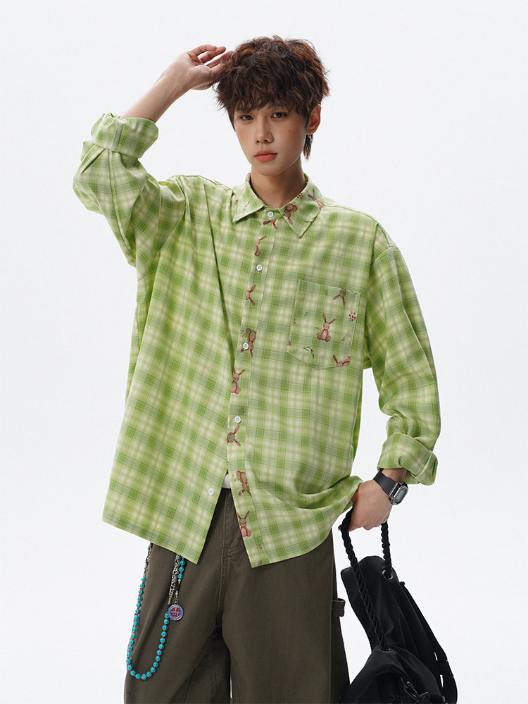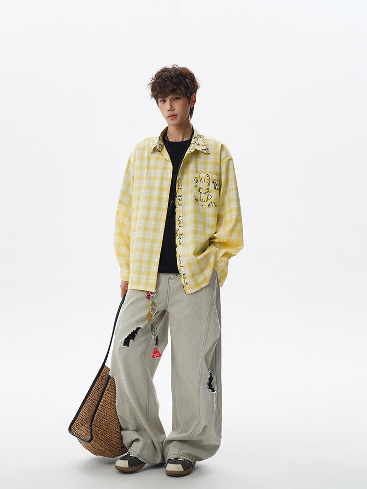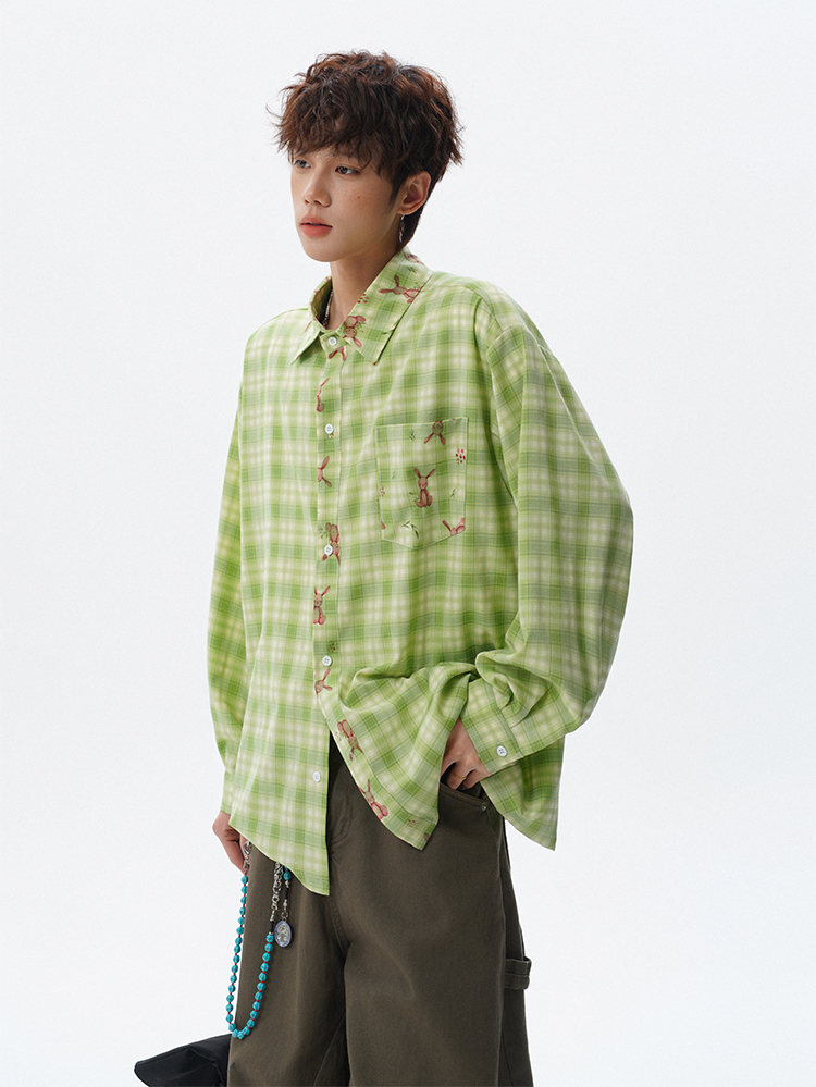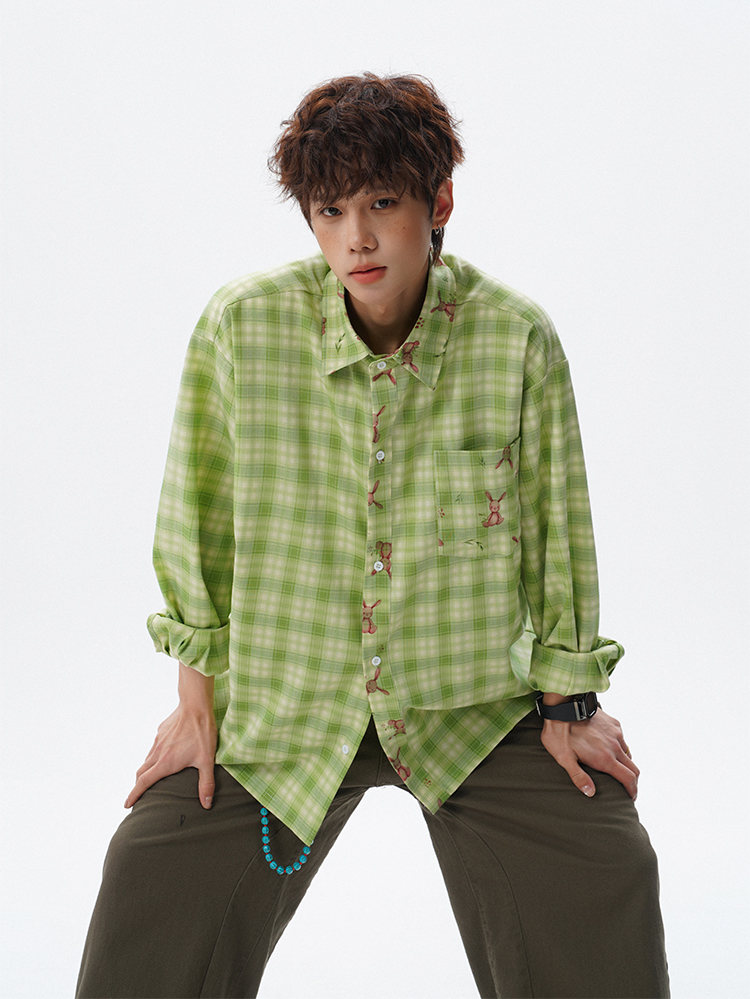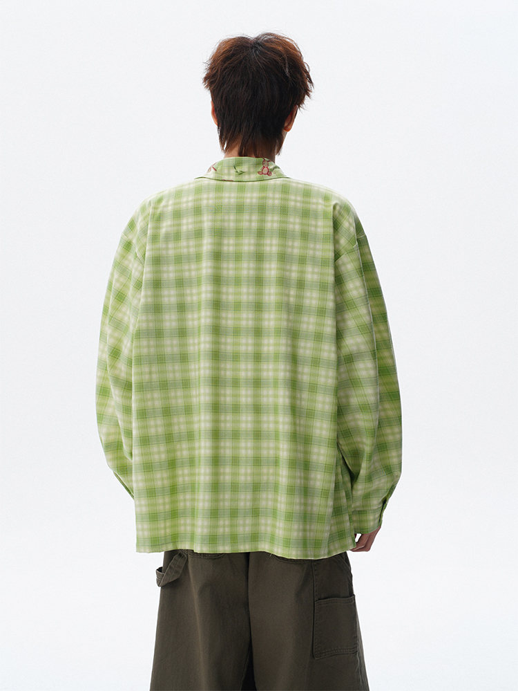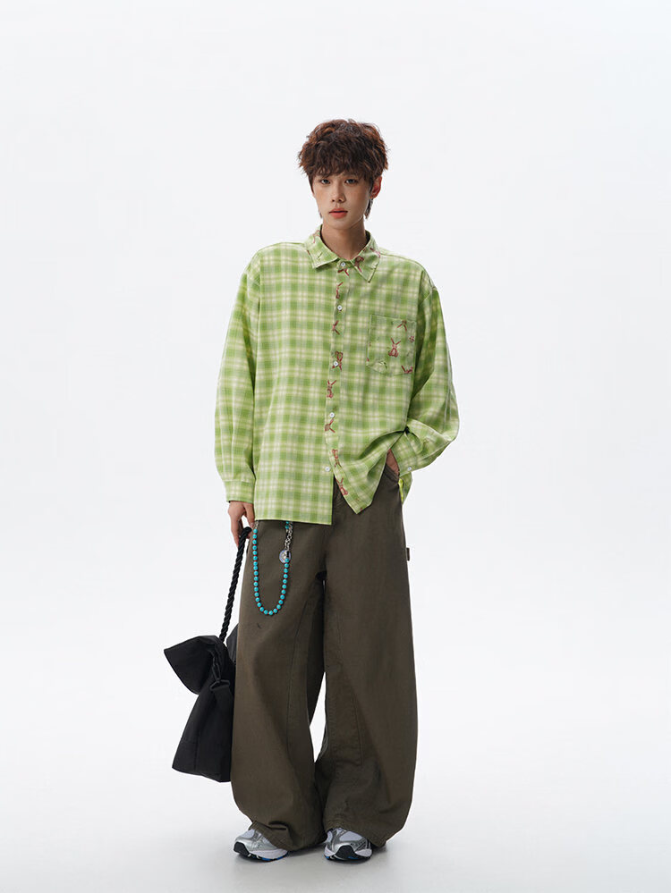 NEW OR MODE美式格子印花长袖衬衫男春季新款潮牌宽松拼接高级感冰丝衬衣外套 粉色【高品质】 M 【建议90-110斤】