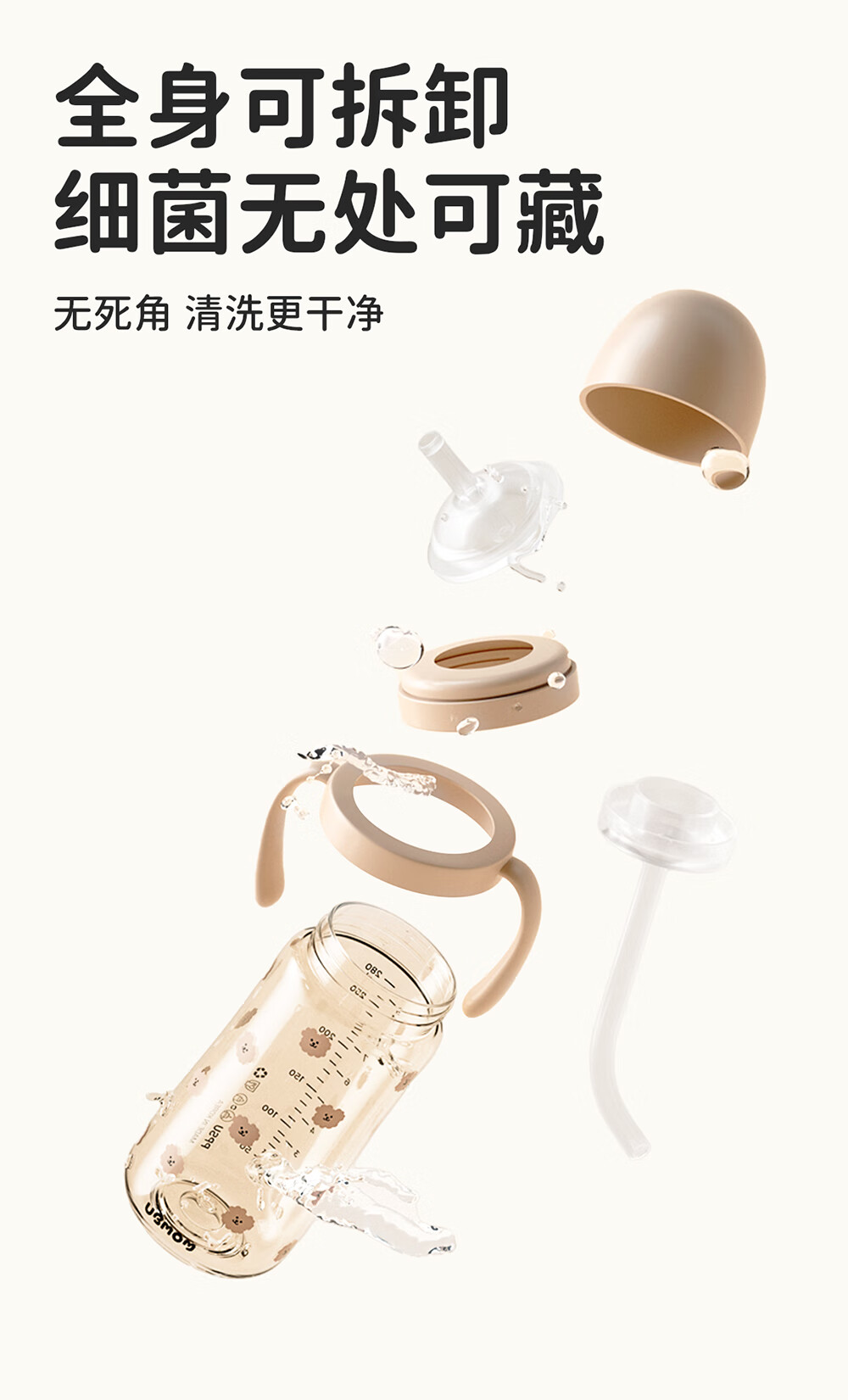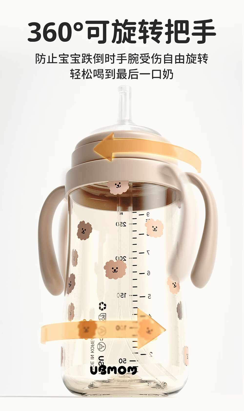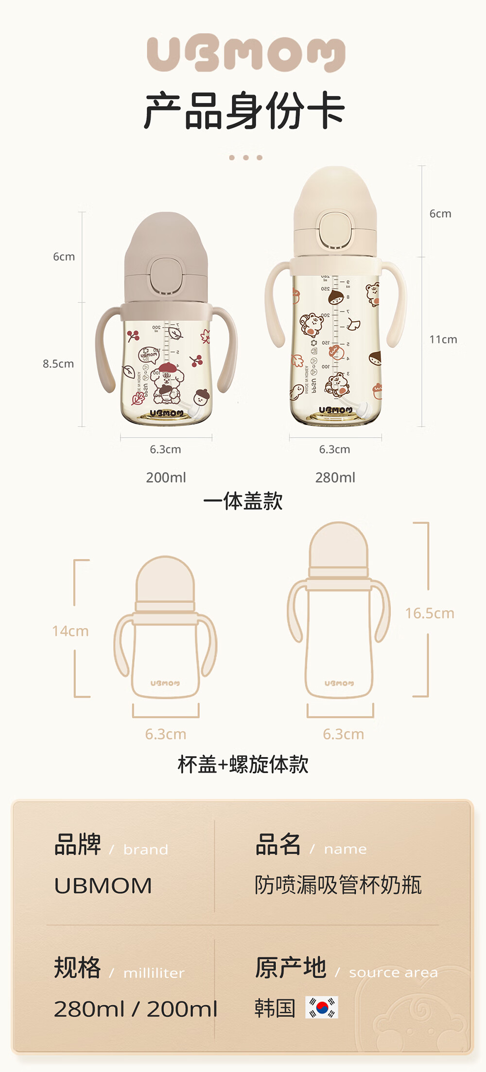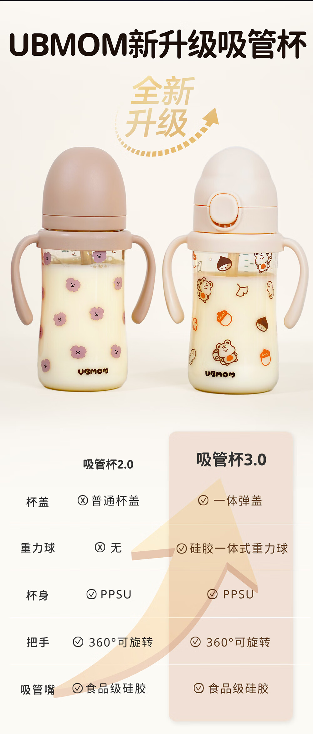UBMOM吸管杯婴儿宝宝学饮杯儿童喝水杯直饮杯牛奶杯ppsu吸管奶瓶1-3岁 弹盖式米色小松鼠-专利防喷 280ml