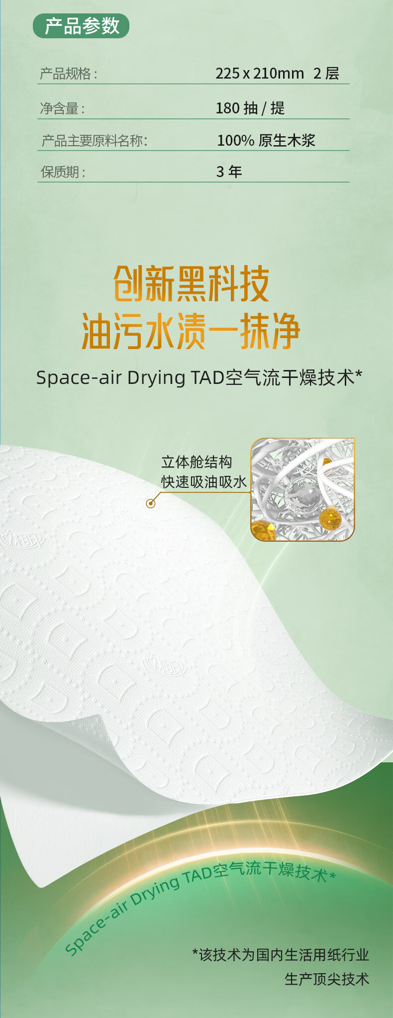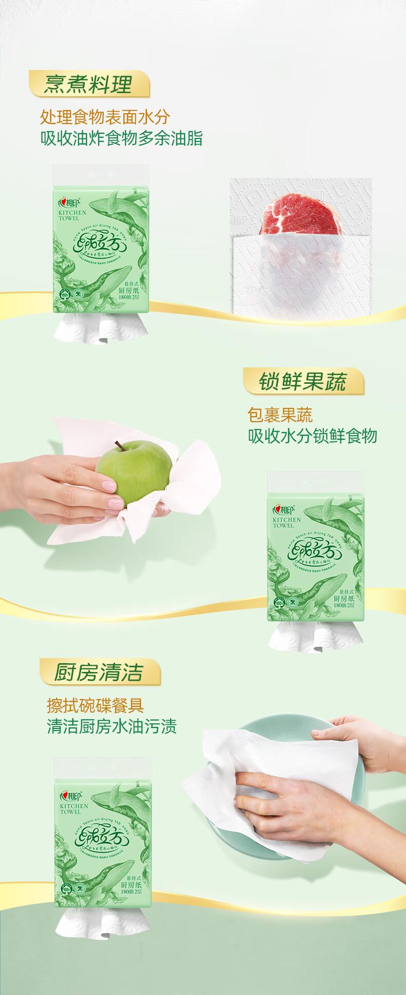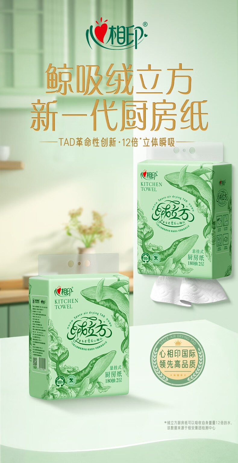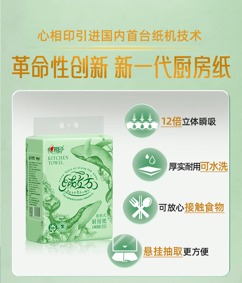 心相印【田栩宁同款】绒立方厨房用纸悬挂式抽纸180抽*3提 可接触食物级