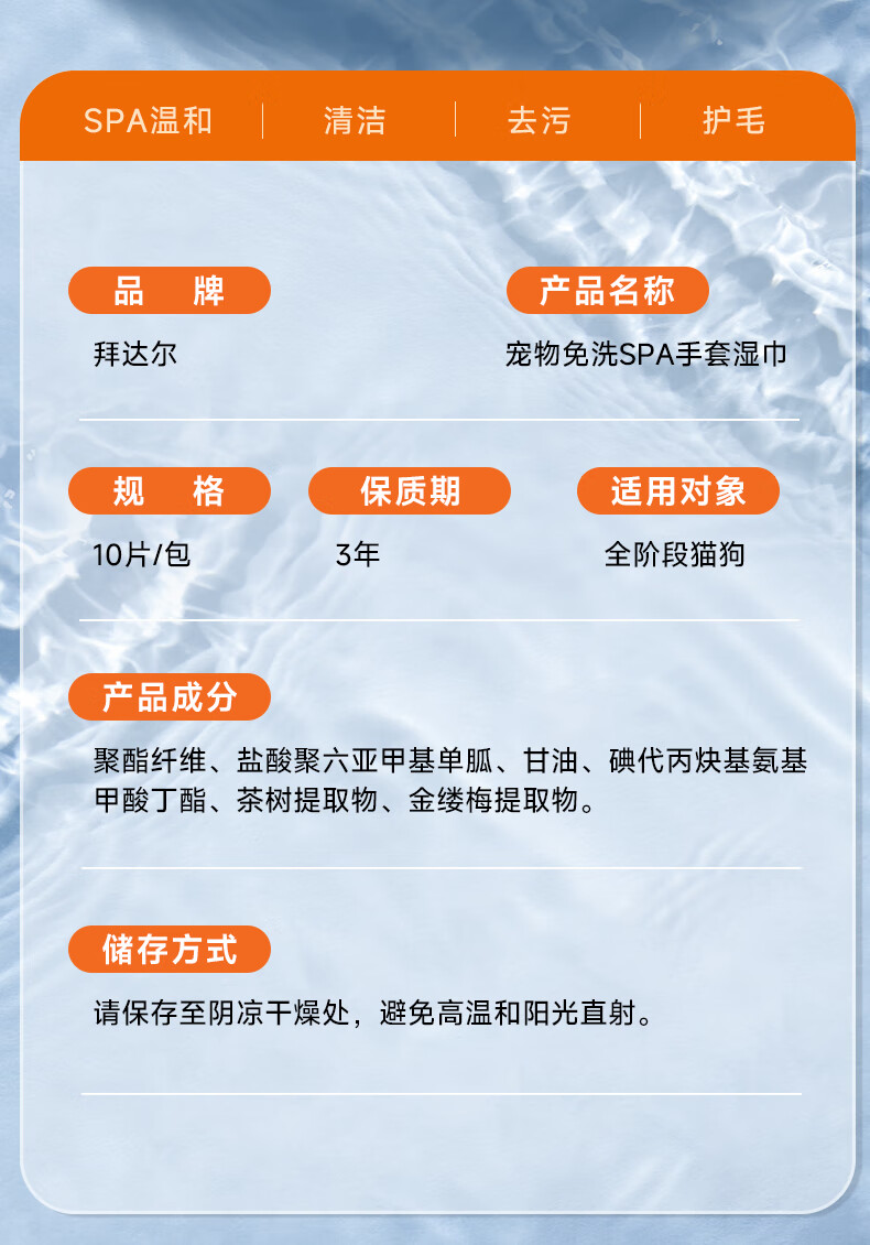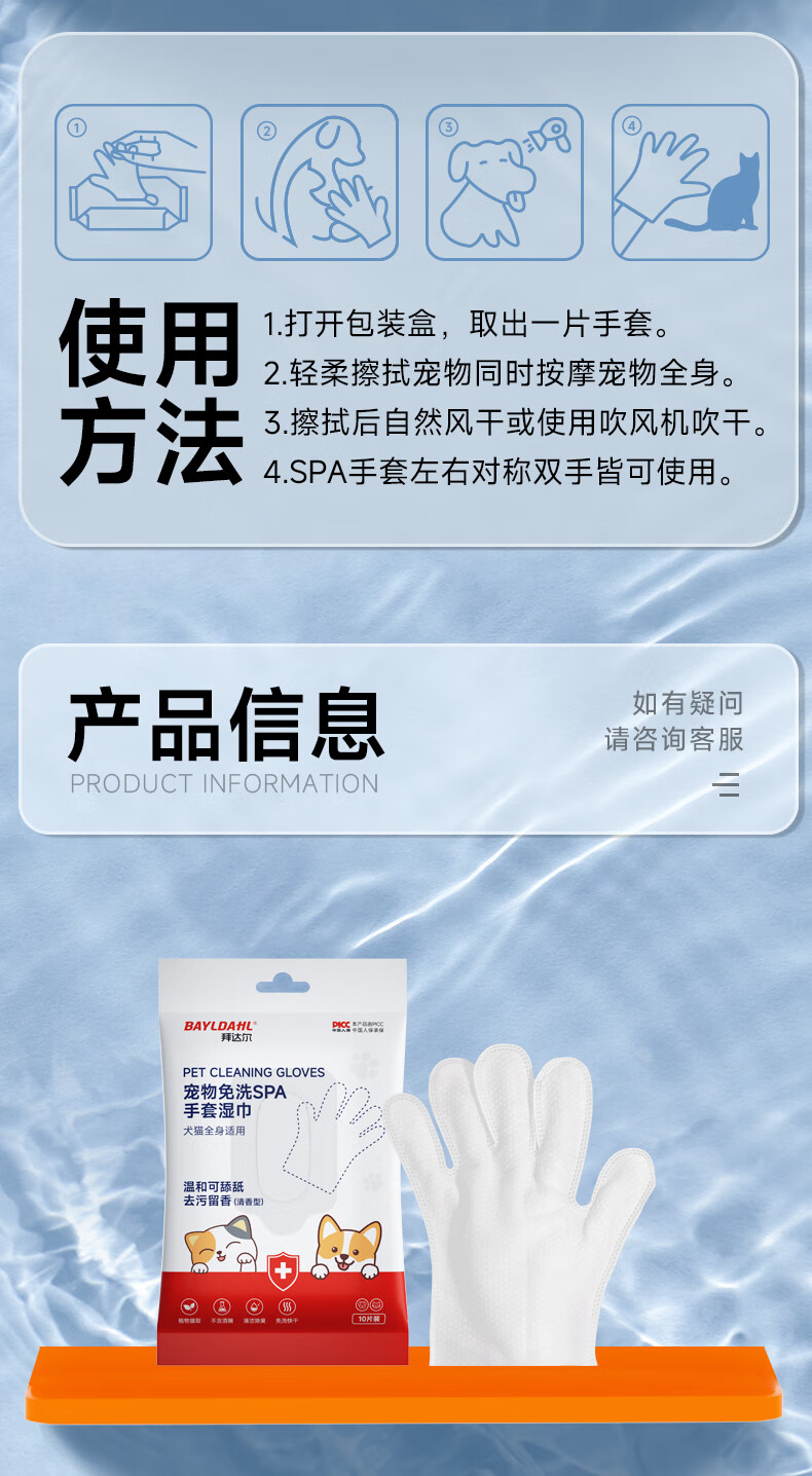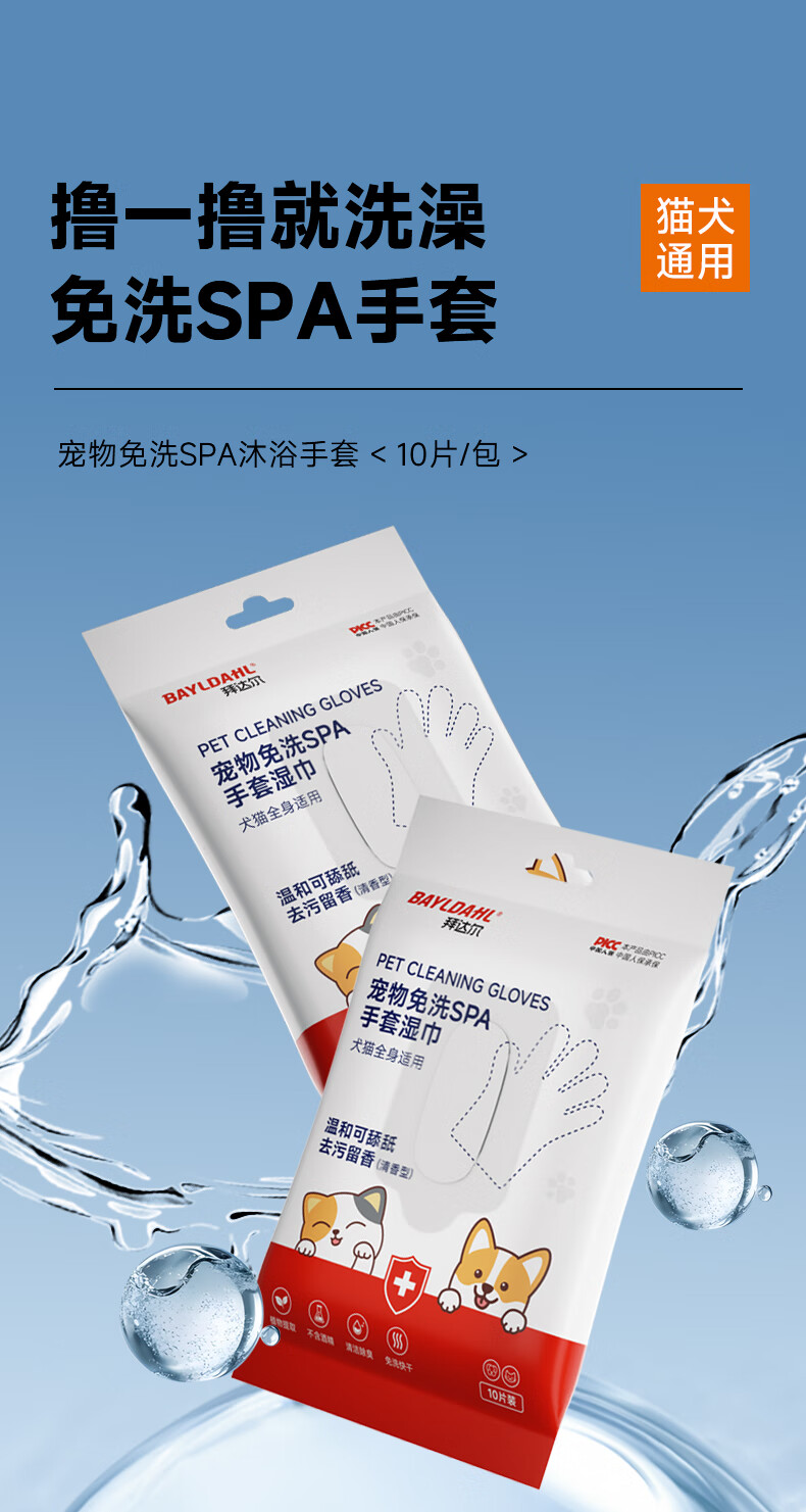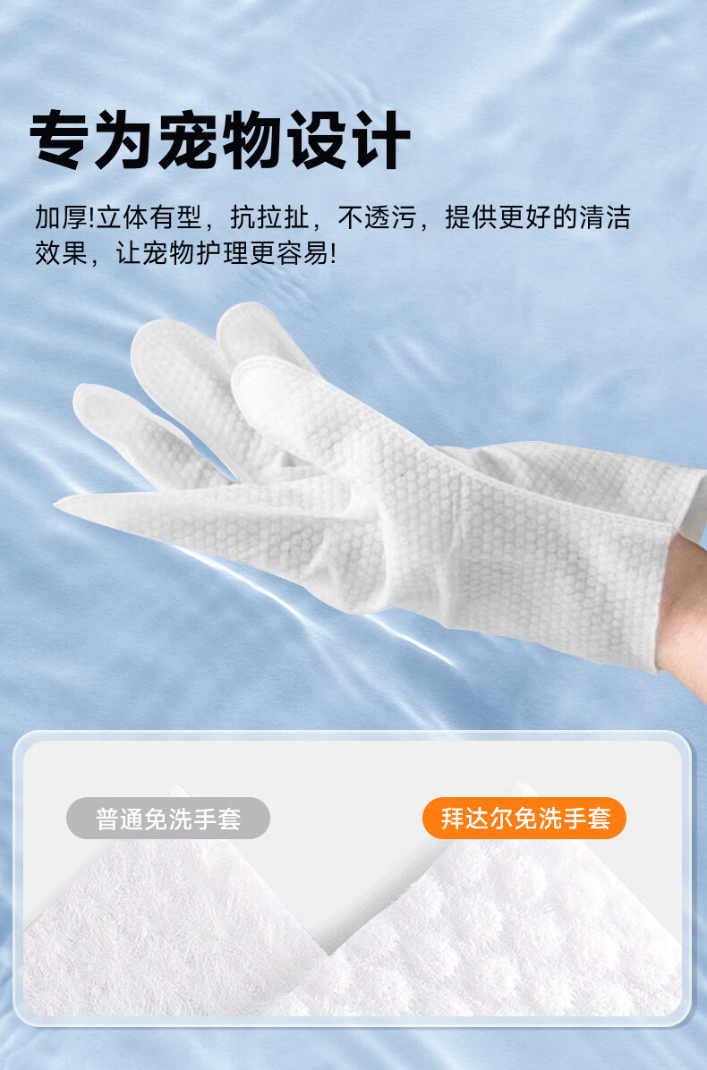拜达尔宠物免洗手套猫咪狗狗专用湿巾去味洗澡幼犬兔子干洗清洁除臭10片