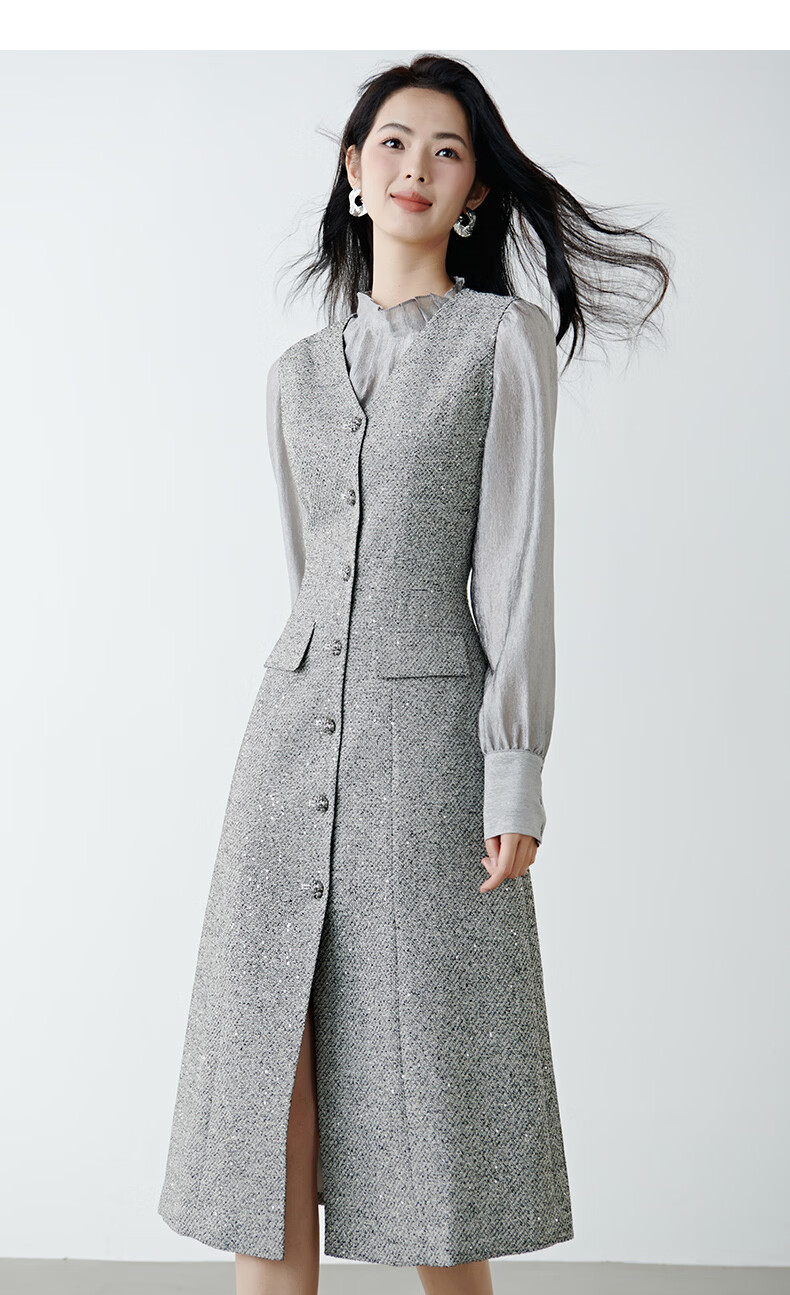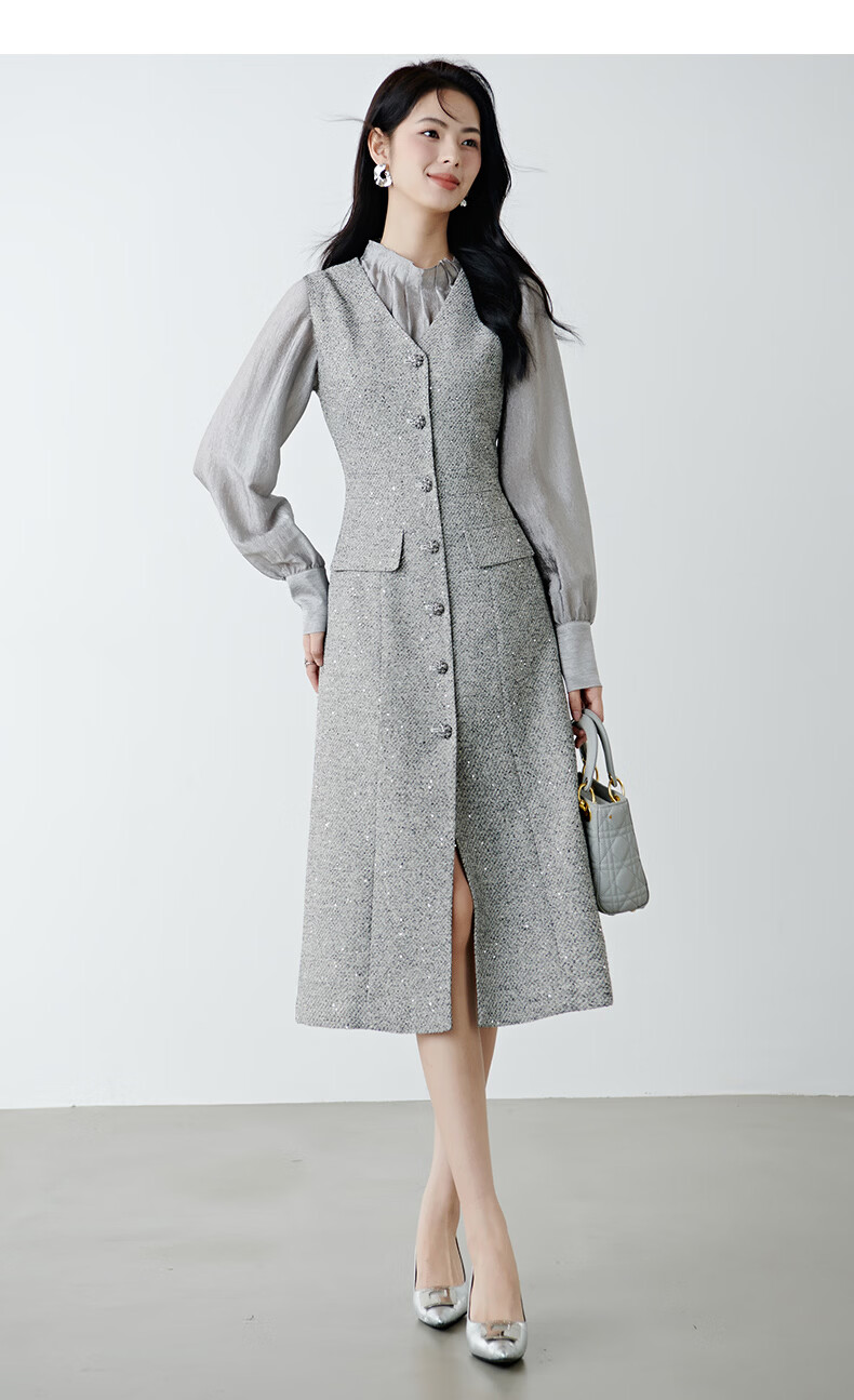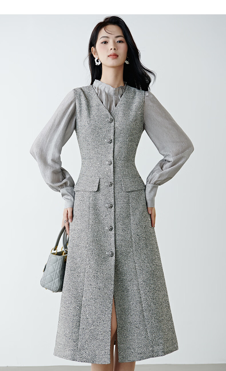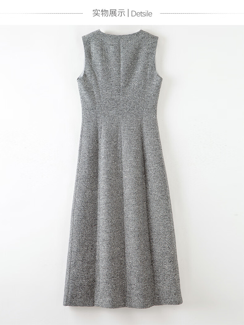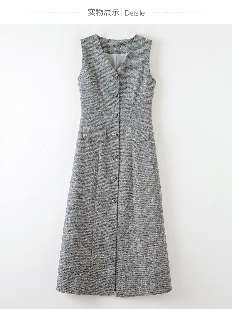晚白【新品】2026春款时尚V领挺括修身气质百搭格雷灰无袖连衣裙 浅灰色 L