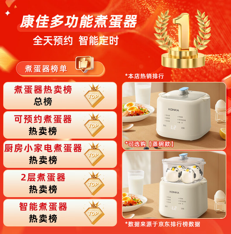 康佳(KONKA)煮蛋器 蒸蛋器迷你小型蒸锅智能定时煮鸡蛋神器多功能早餐一体机自动断电 单层 【特价款】智能预约 | 可蒸4个蛋