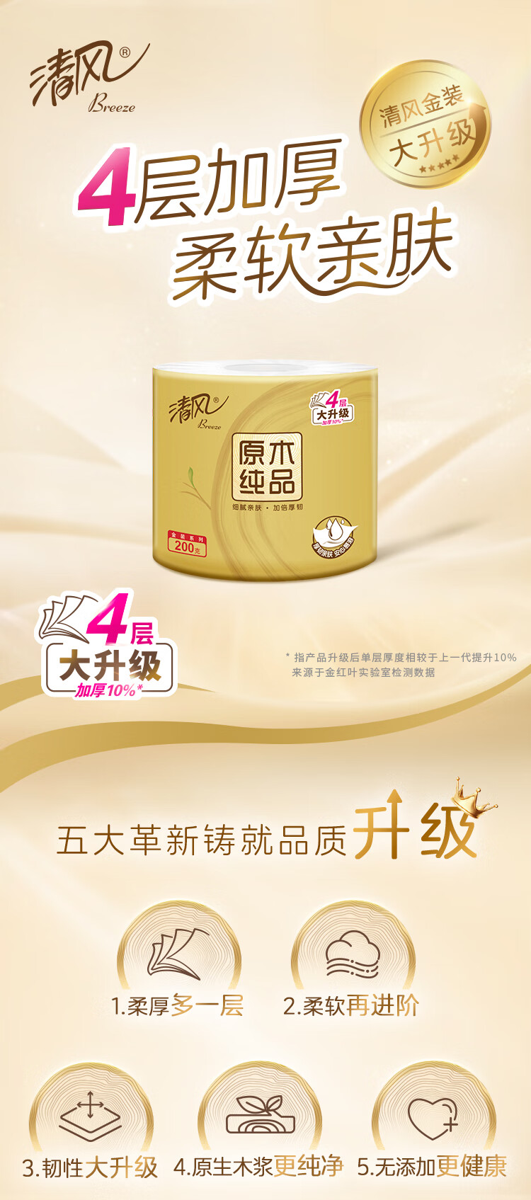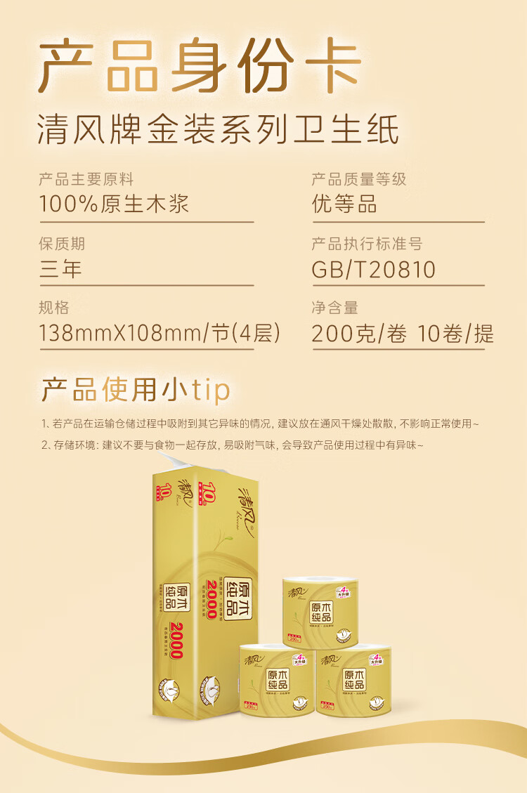 清风有芯卷纸 原木金装4层 200克*10卷 卫生纸纸巾 厕纸 卷筒纸 单提