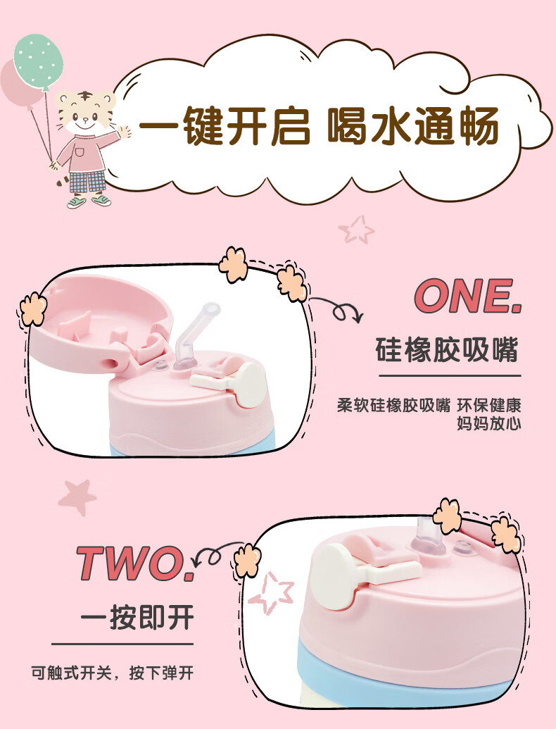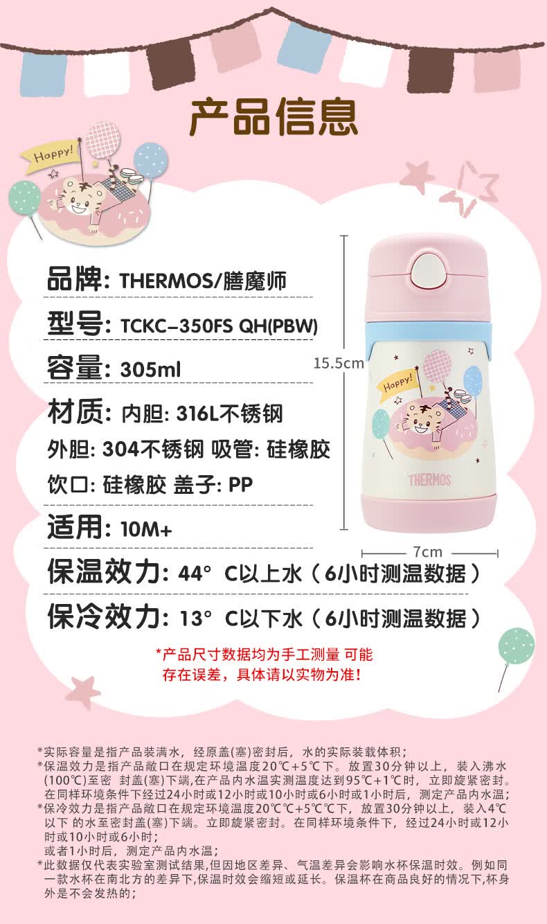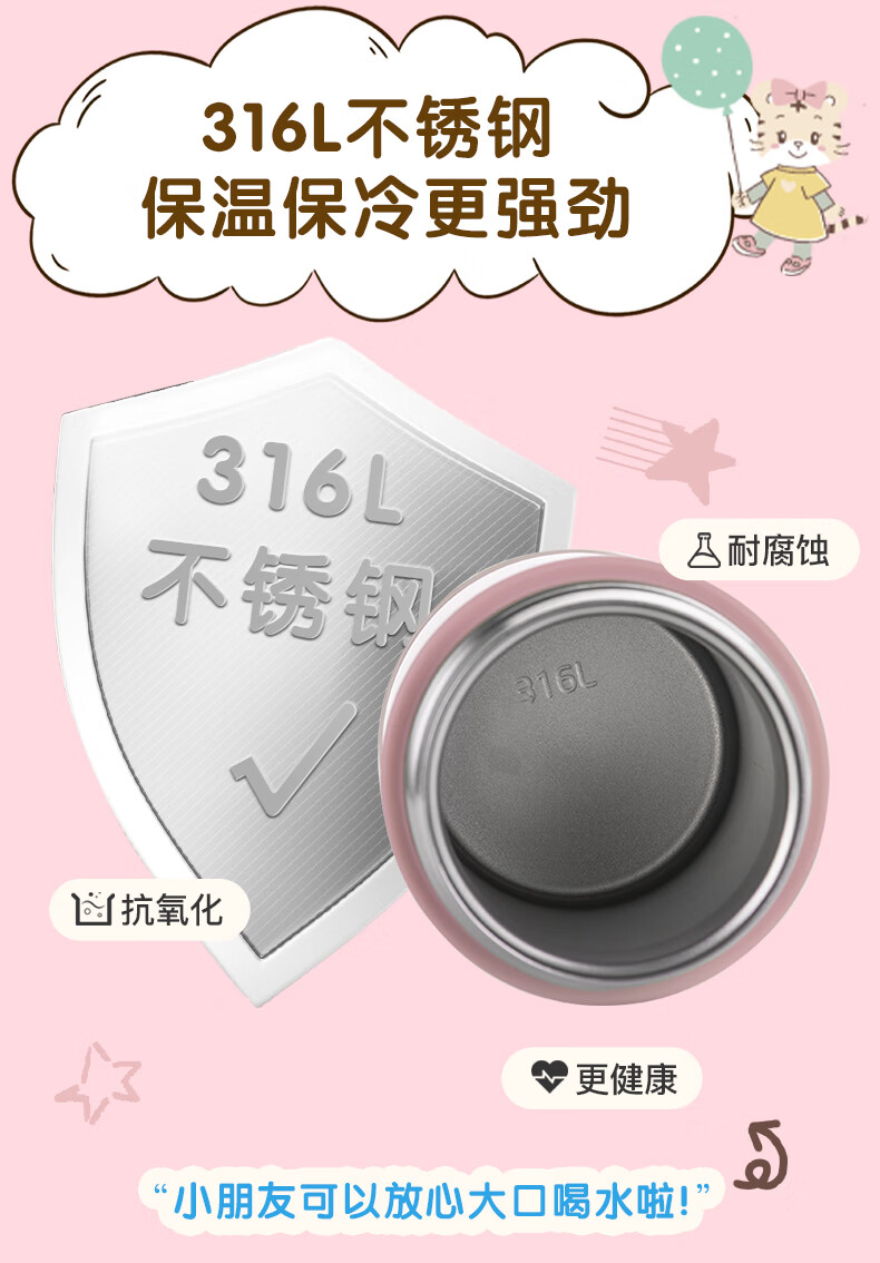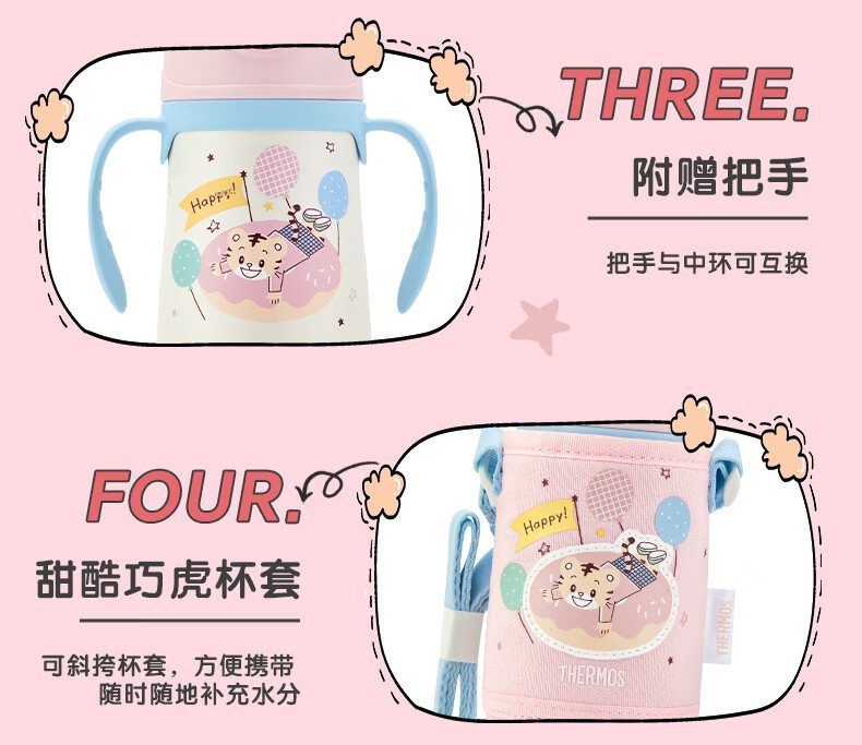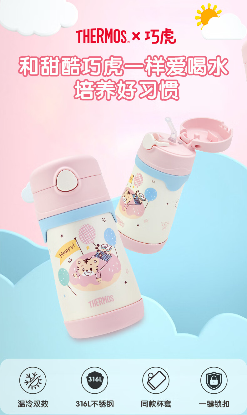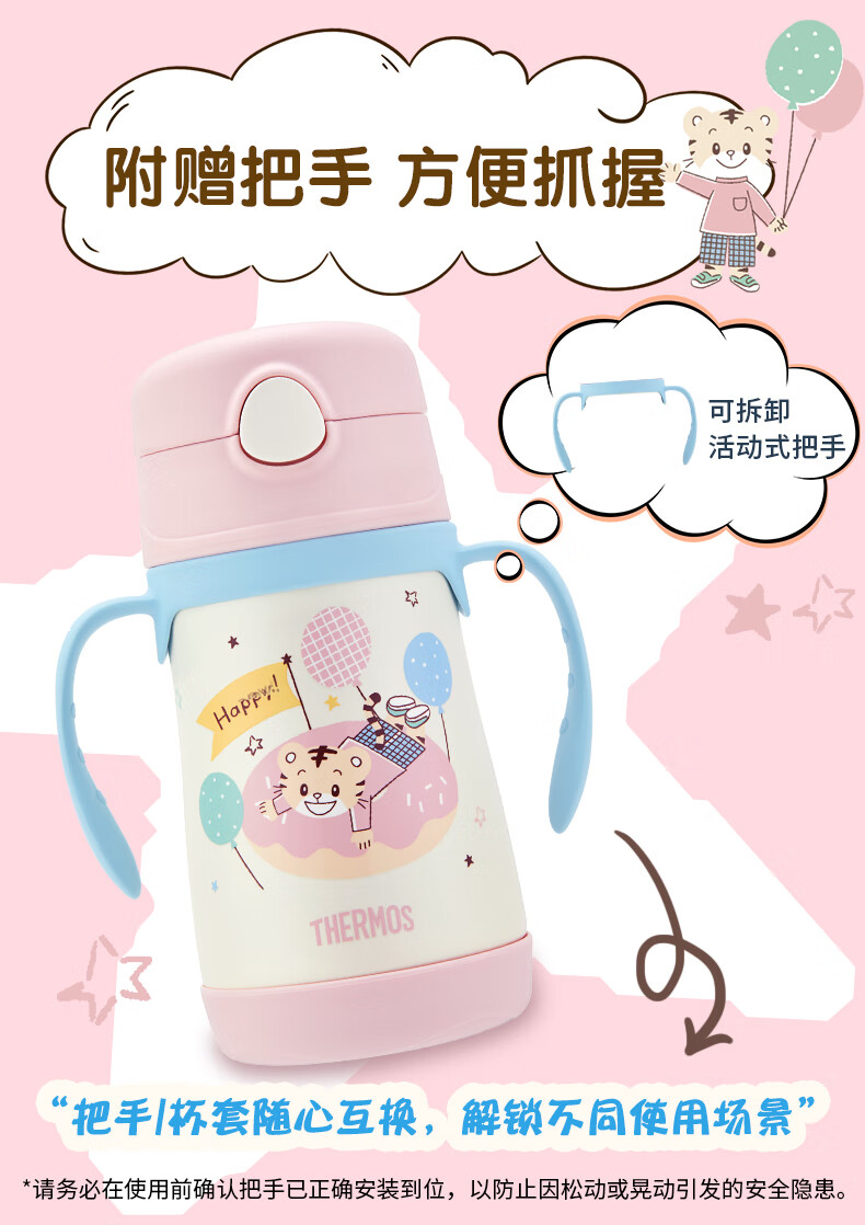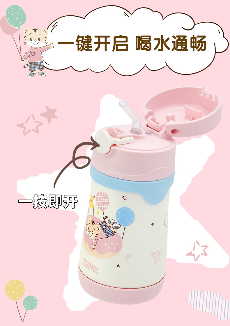 膳魔师(THERMOS)儿童吸管保温杯巧虎带杯套把手316L不锈钢学生杯幼儿上学TCKC