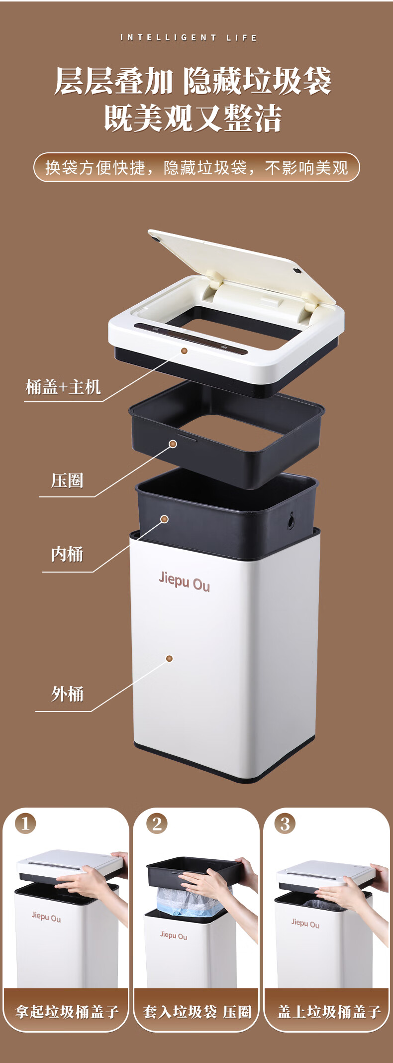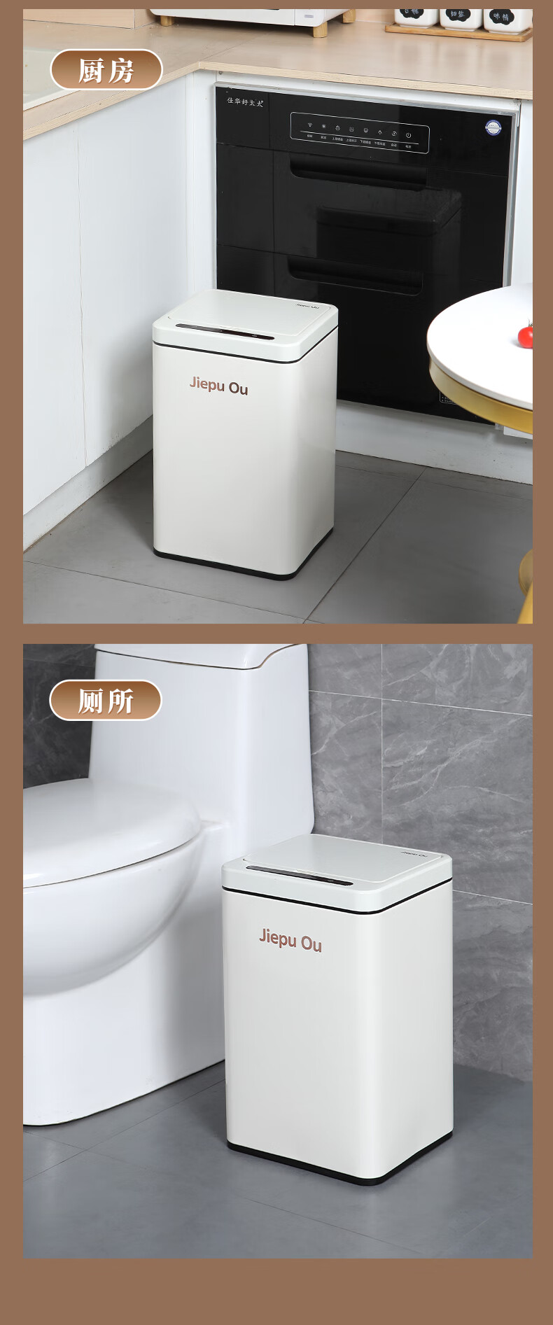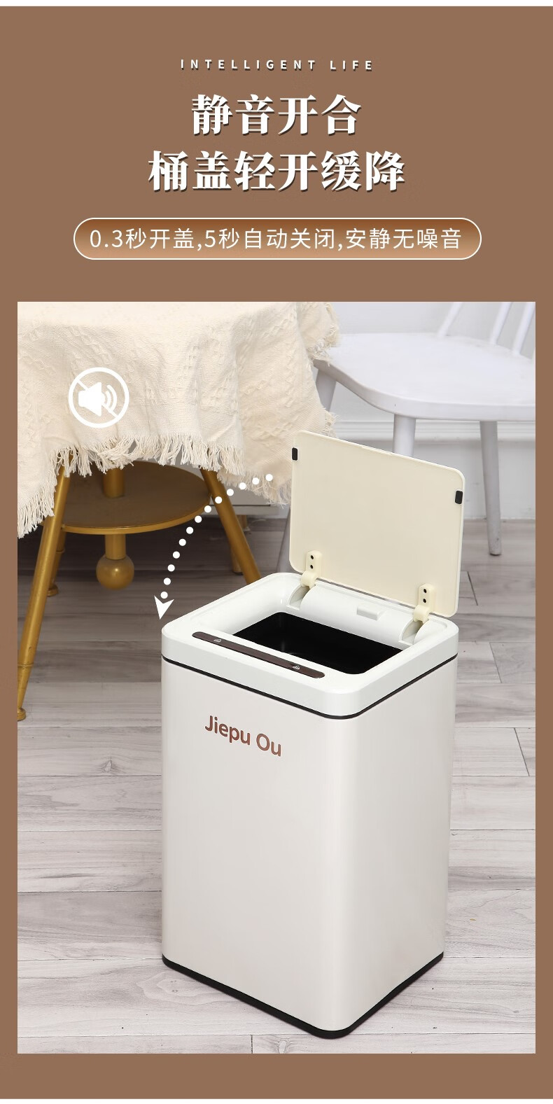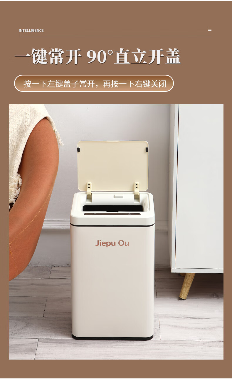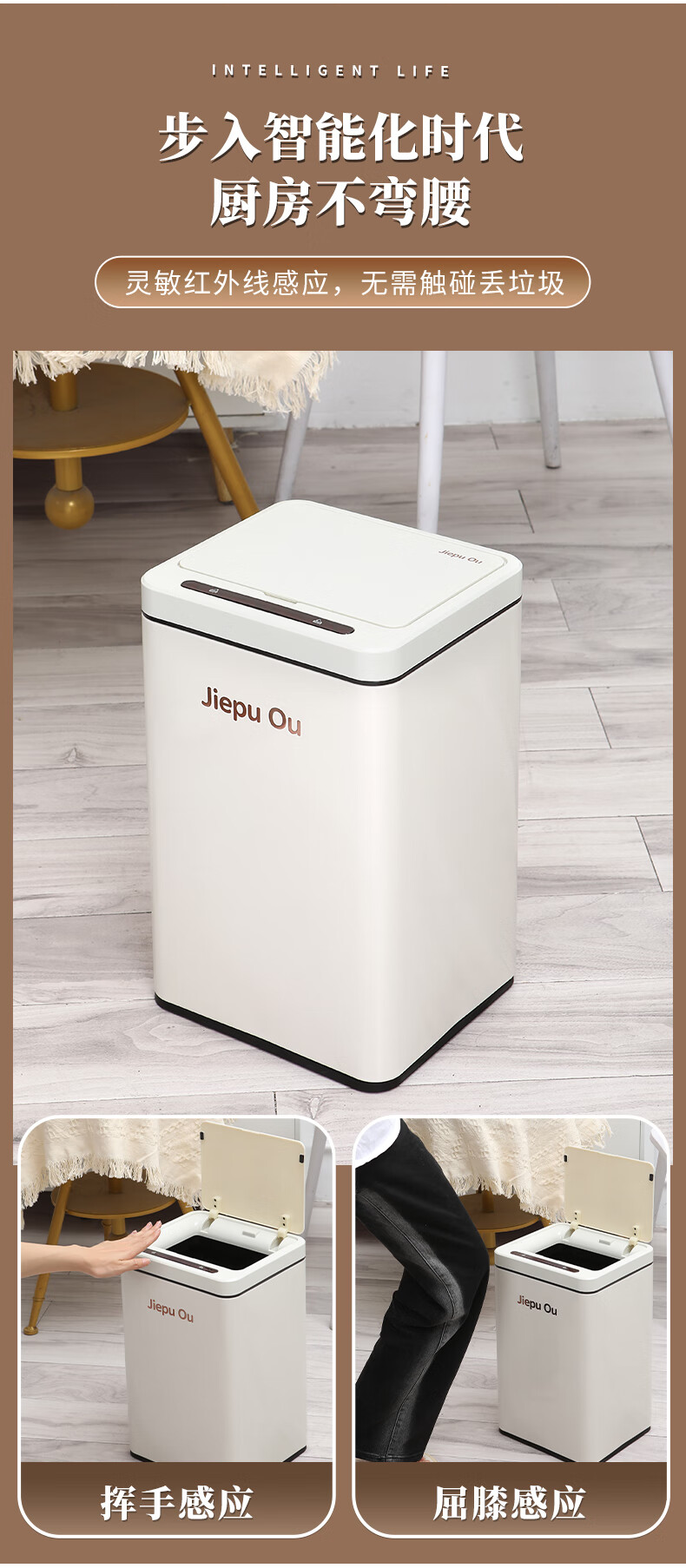 洁普欧不锈钢智能感应垃圾桶带盖大容量客厅厨房卫生间带垃圾娄 经典黑(内桶15L)