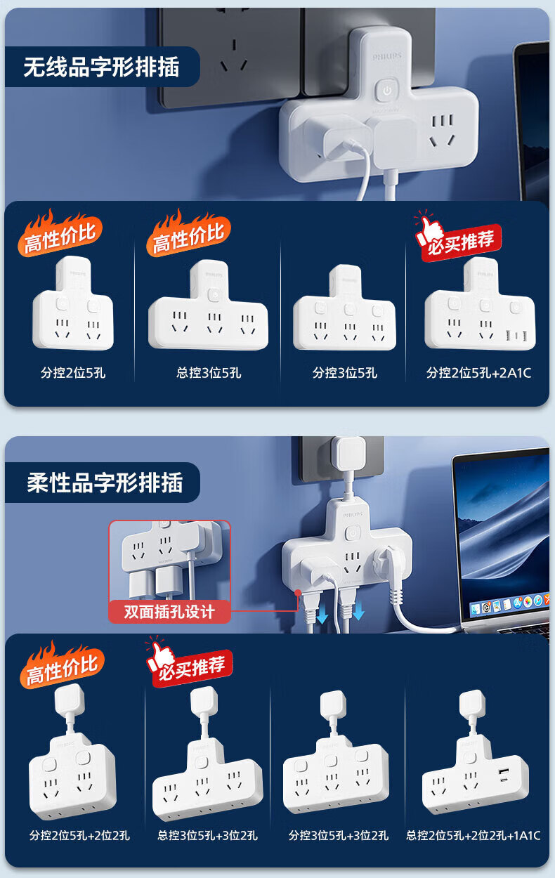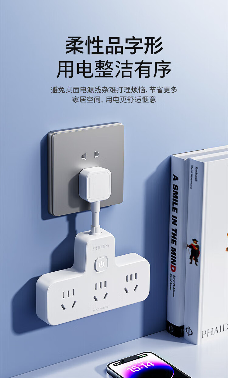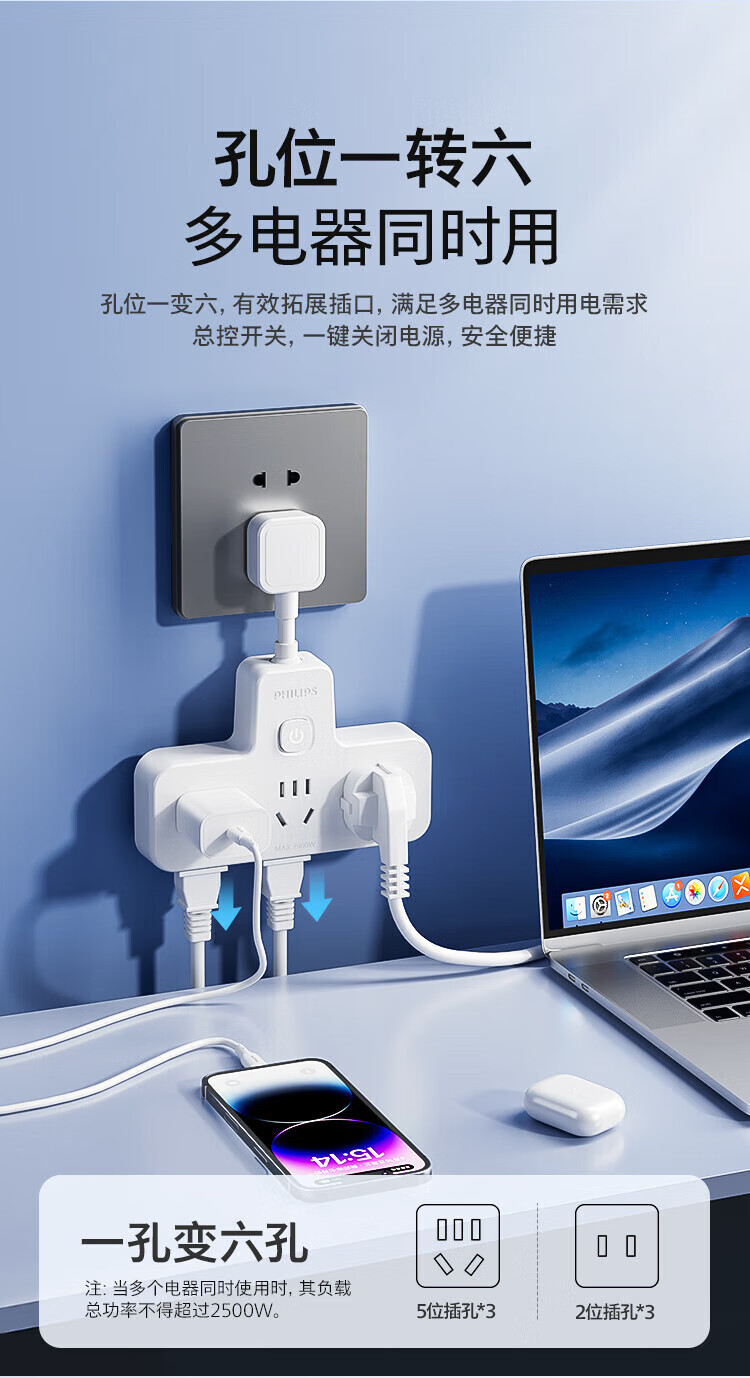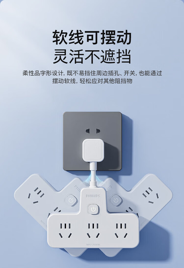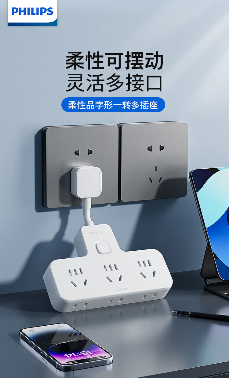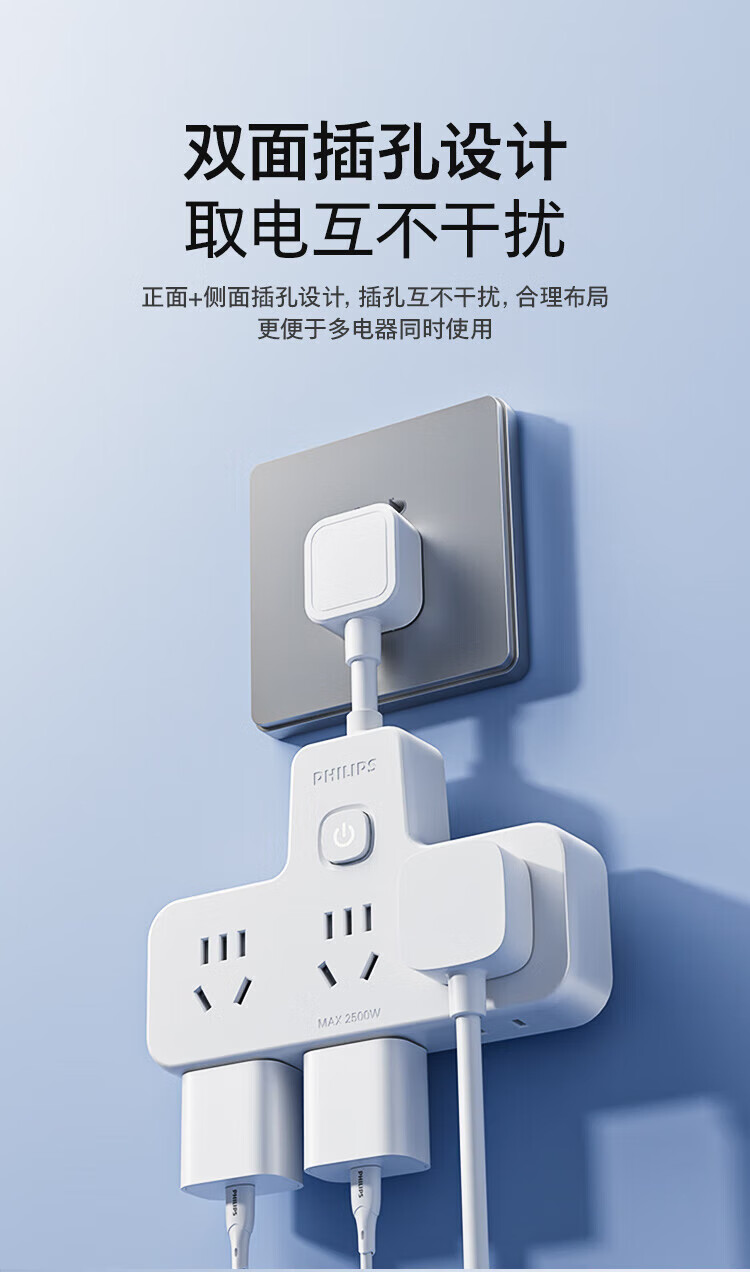飞利浦飞利浦插座转换器一转多扩展插头分控多功能家用电源转换头一转二插座一转三排插插线板多用一拖二 分控一转3插位