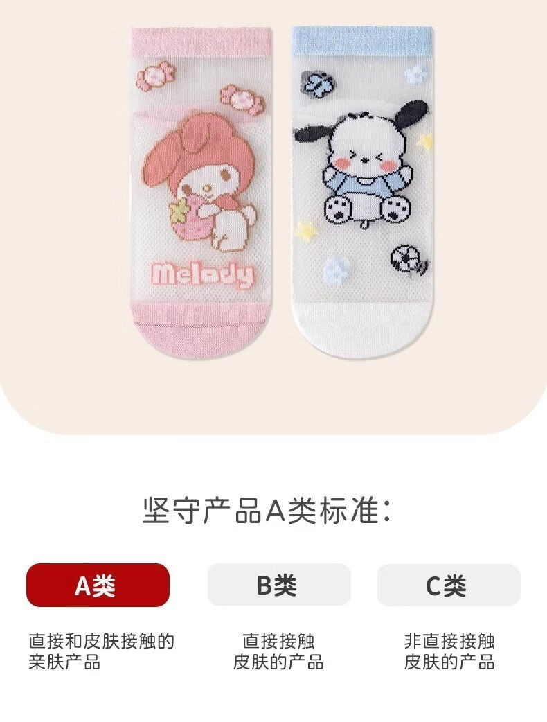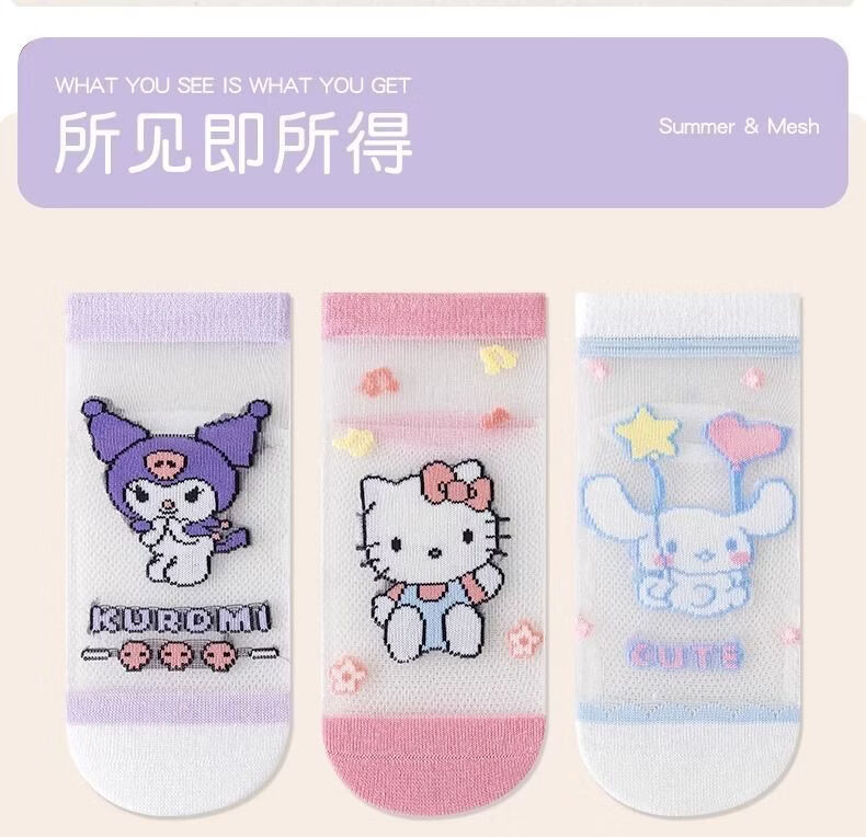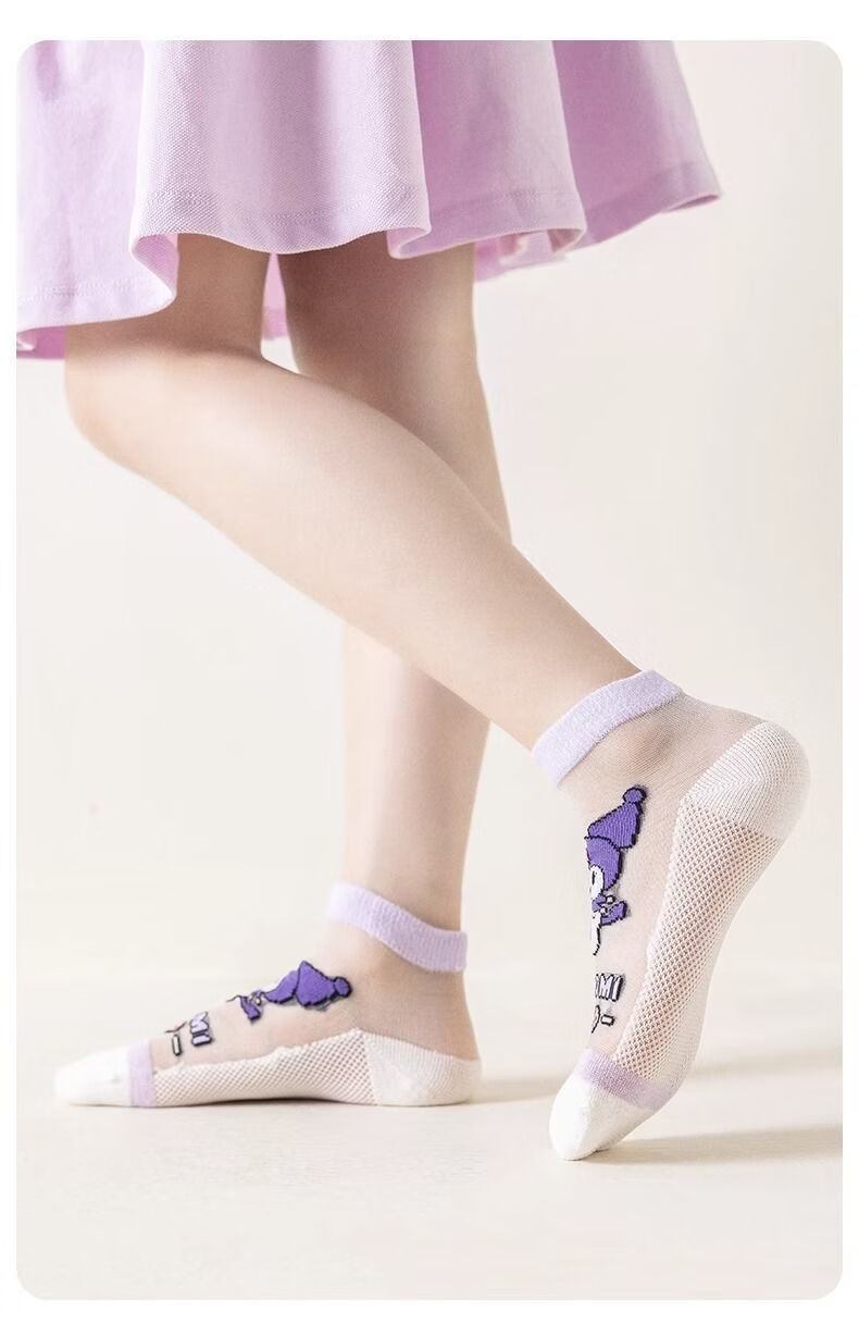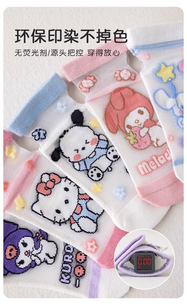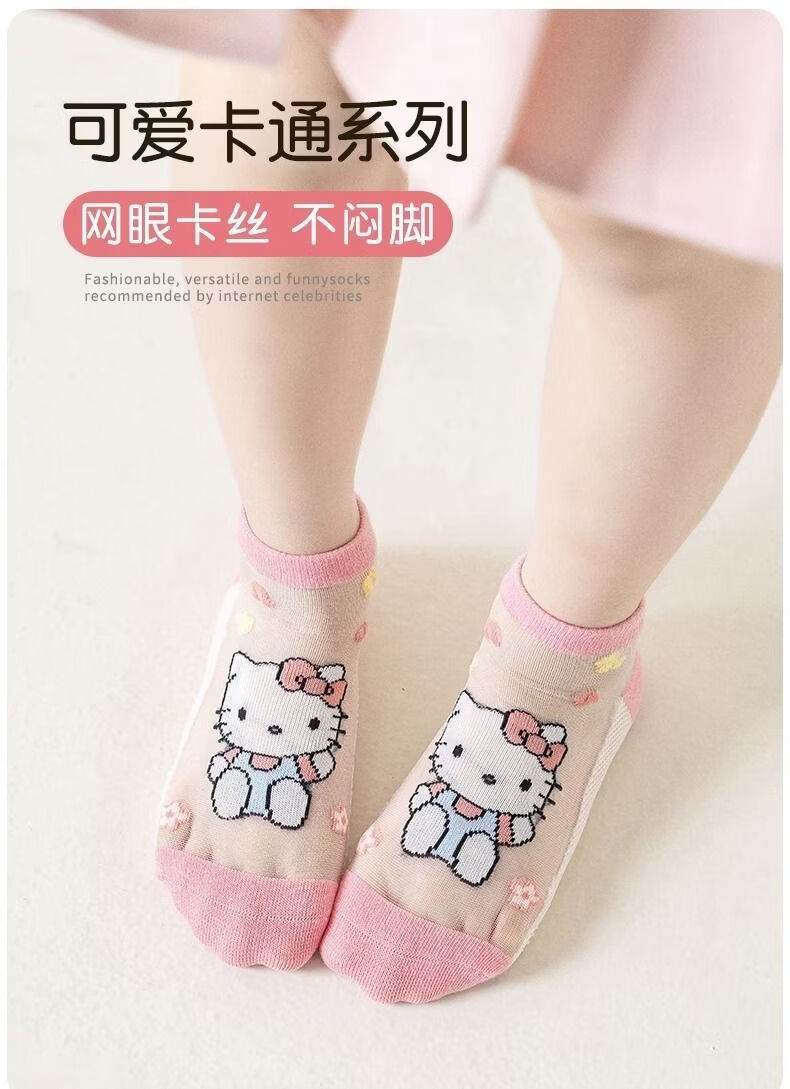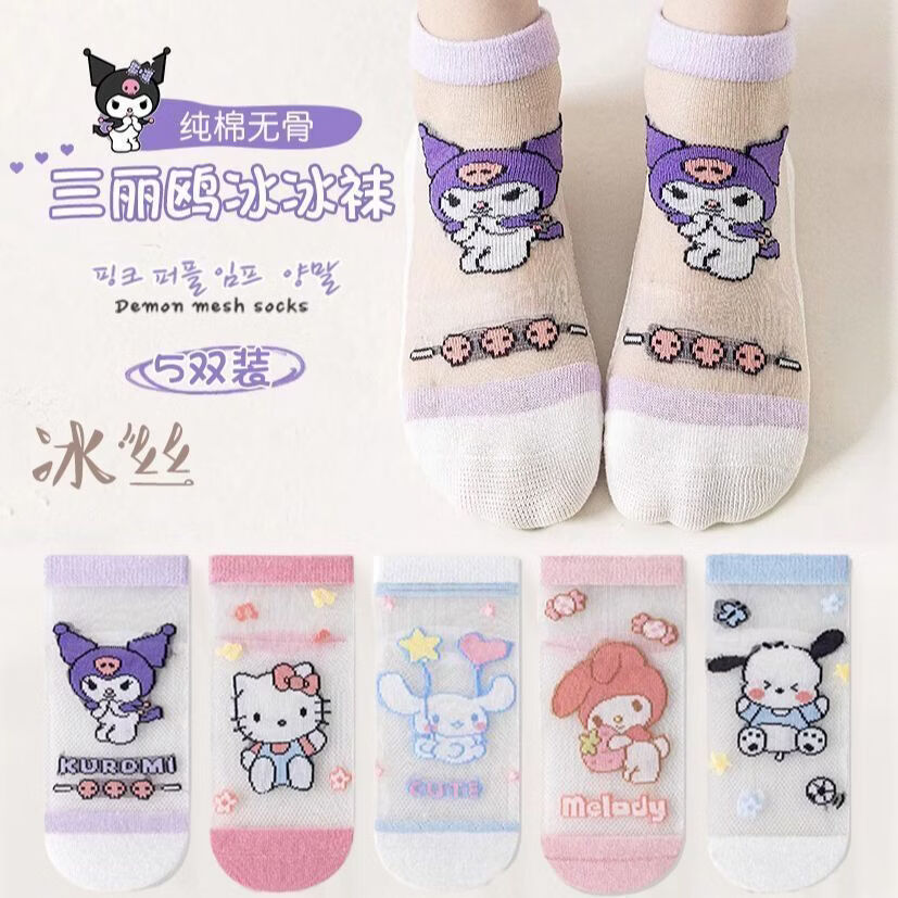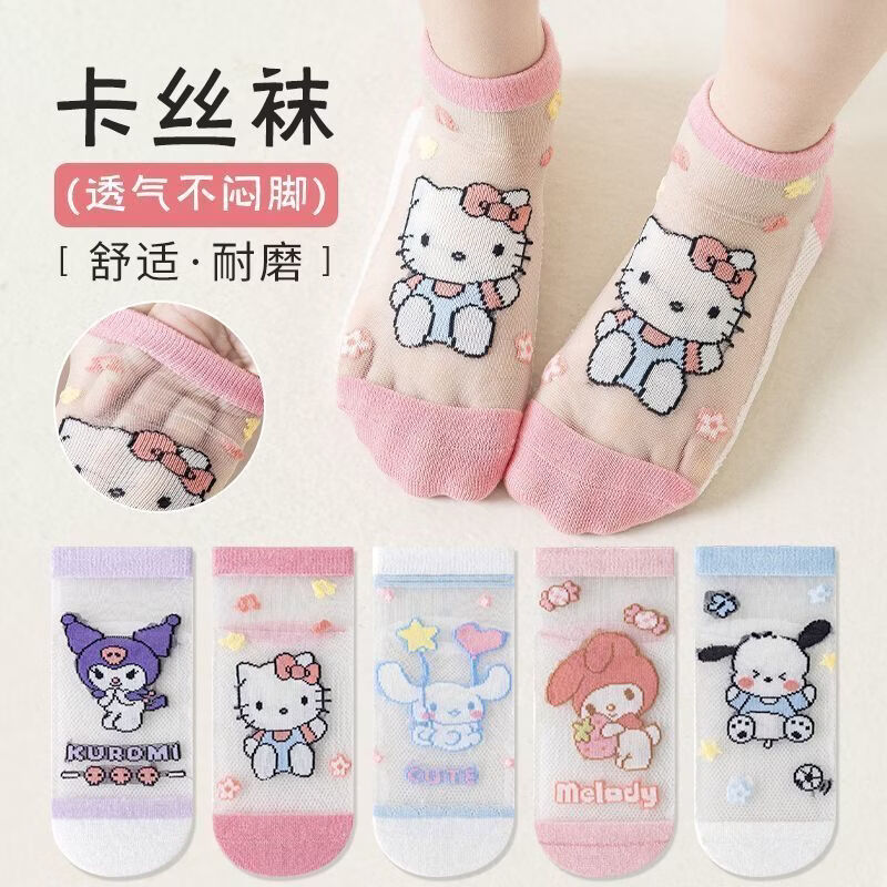 小红书同款夏天透气AA 三丽鸥冰丝5双装6-8岁 男女童袜子夏薄款短款透网