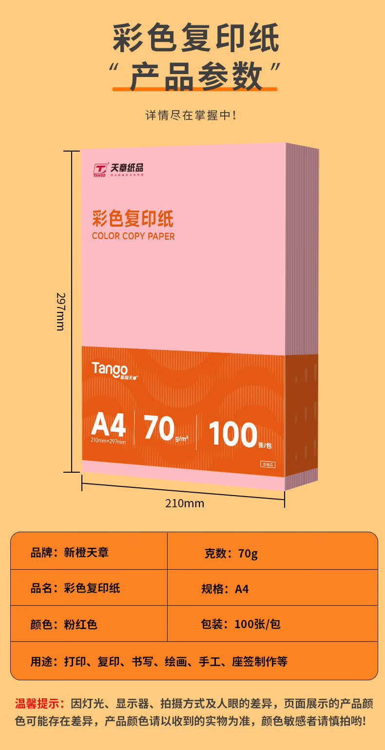 天章 (TANGO)新橙天章 A4彩色复印纸 手工折纸剪纸 凭证打印纸软卡纸 儿童DIY彩纸 浅粉红色 70g 100张/包