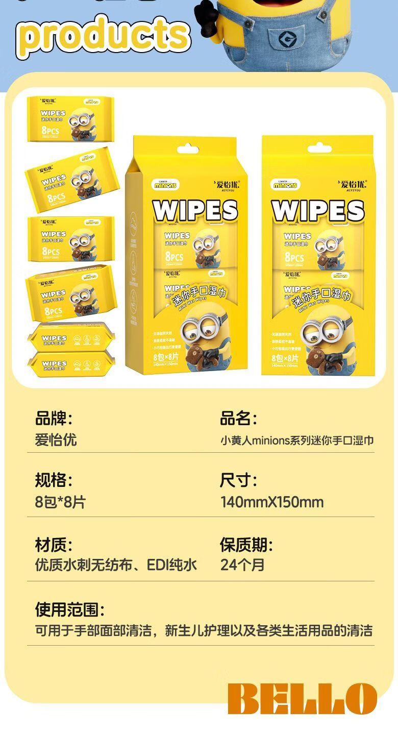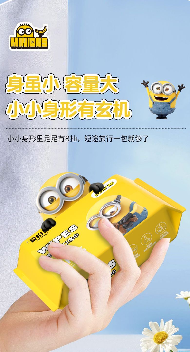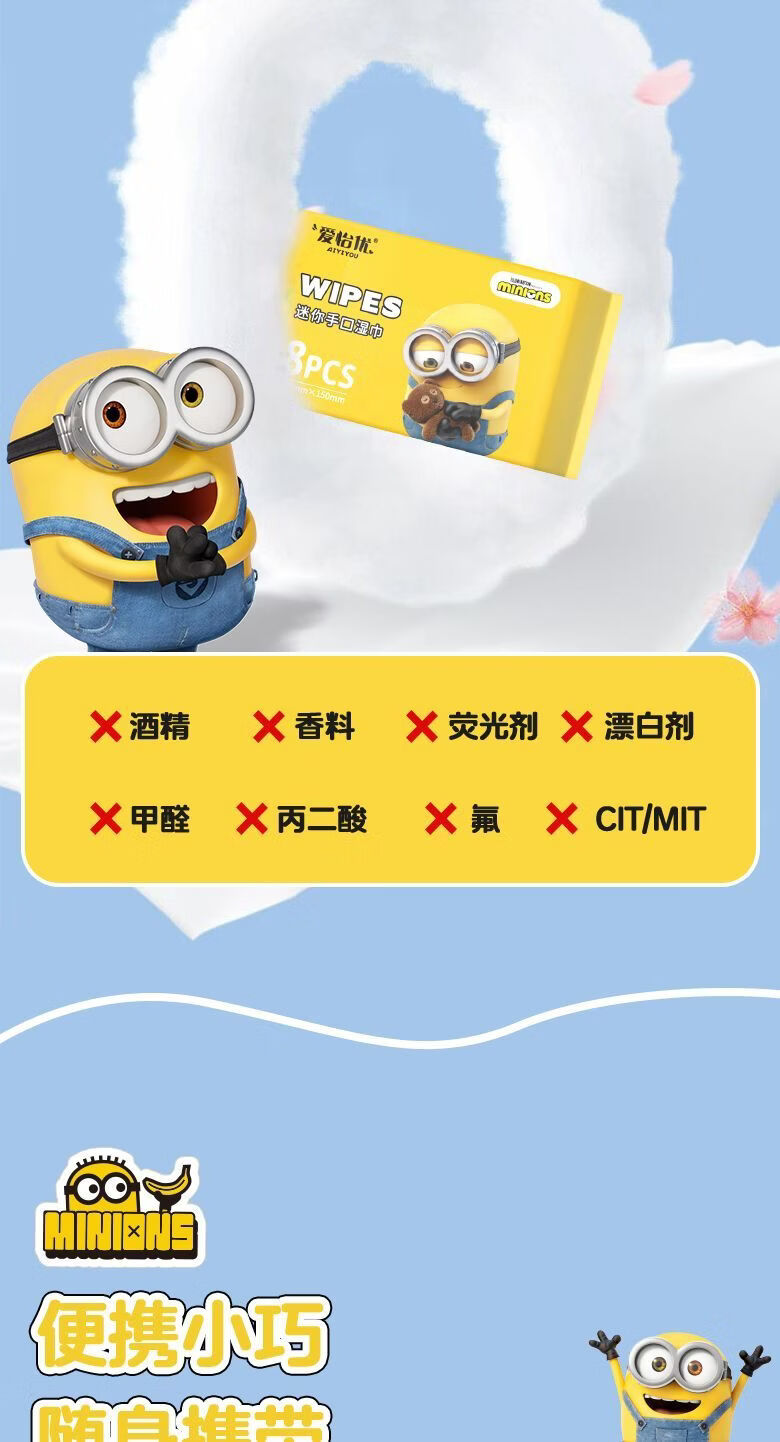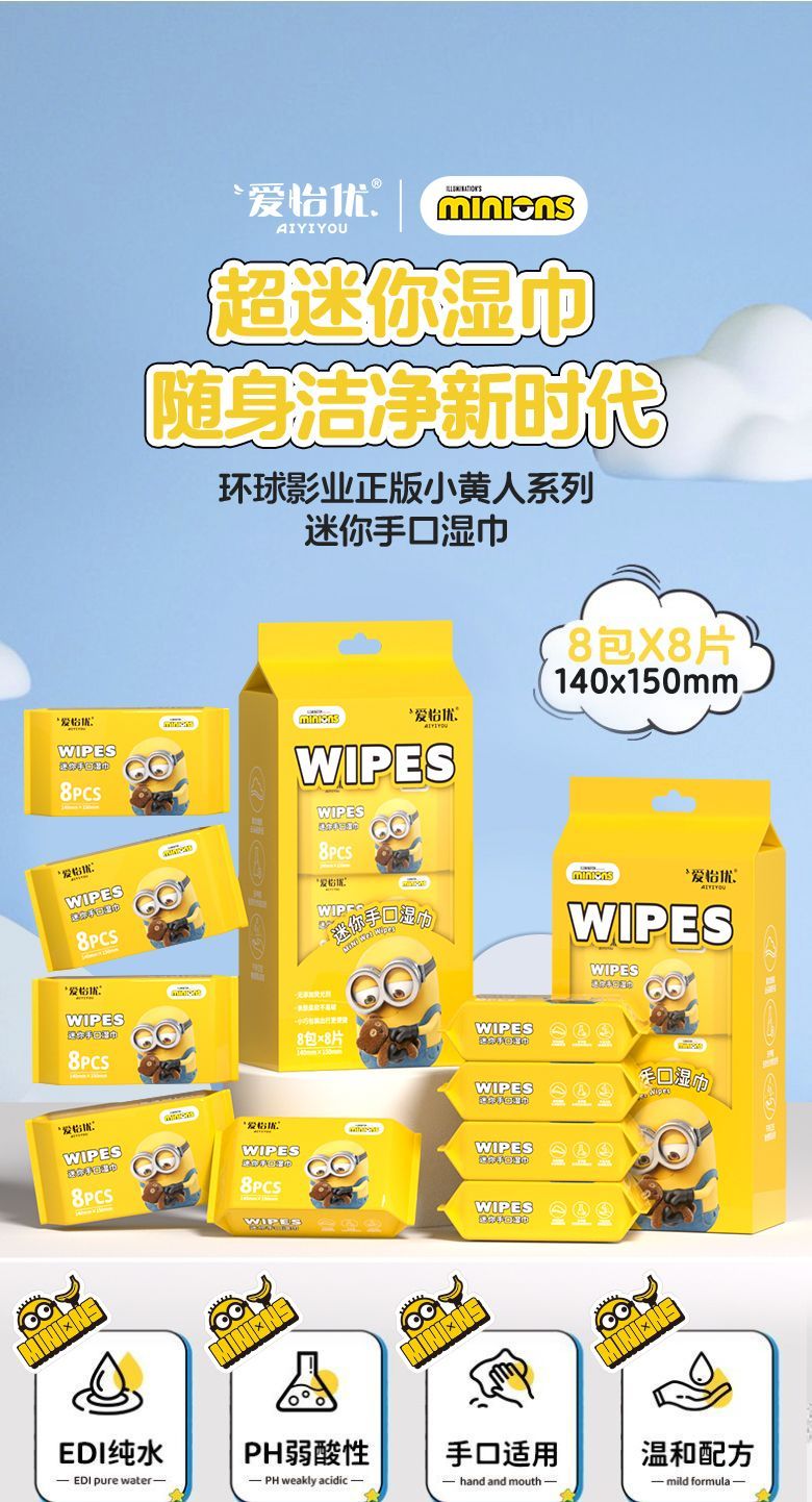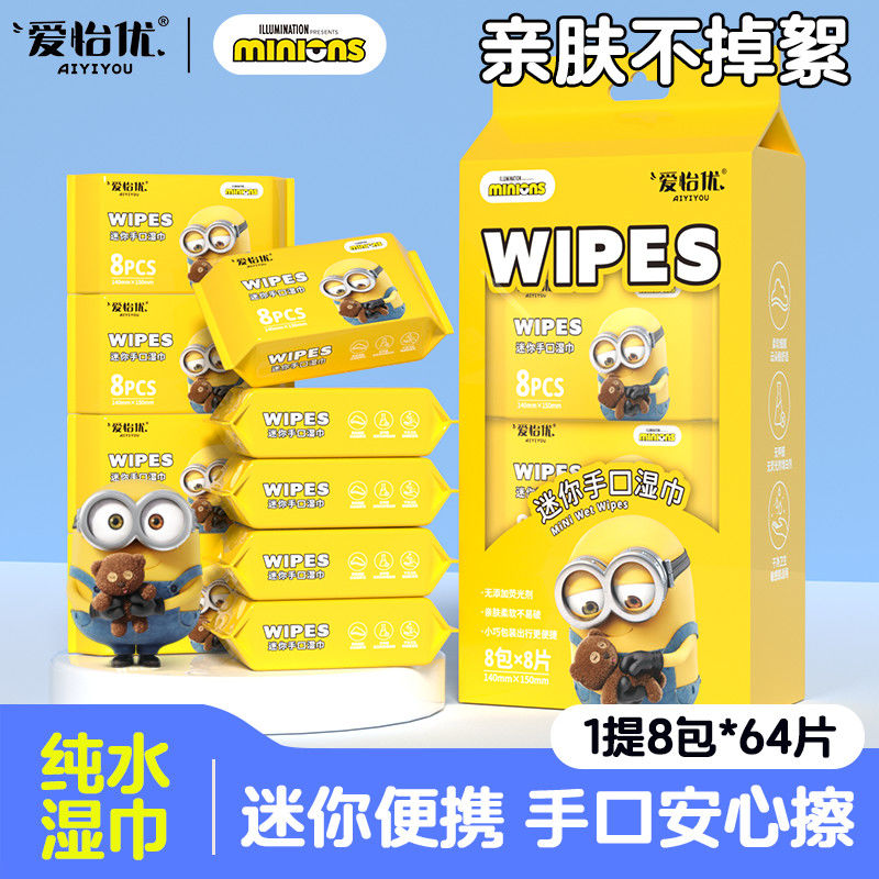 爱怡优×小黄人联名 便携迷你湿巾 EDI纯水 儿童手口湿纸巾婴幼儿湿巾纸 4提【8片*32包共256片】