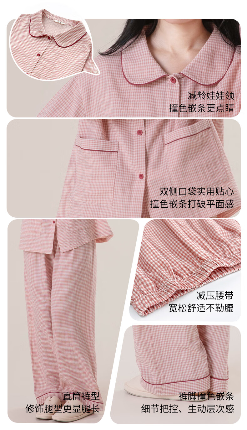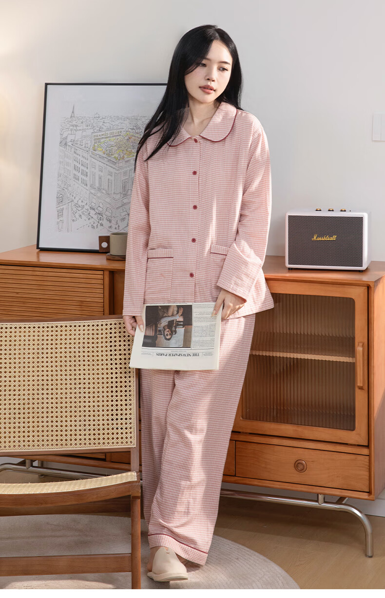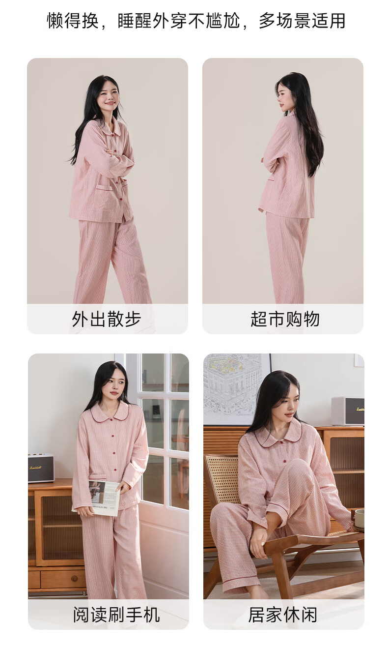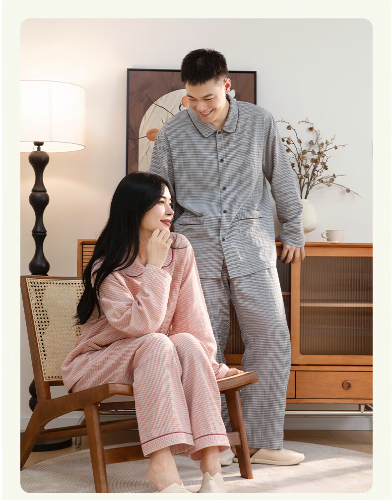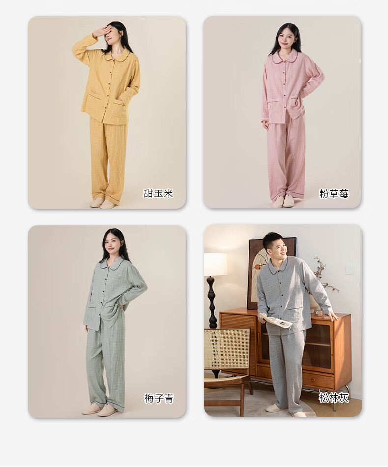 宜色家纯棉棉纱睡衣双层纱家居服 100%棉纱织男女士情侣睡衣套装可外穿 升级款娃娃领-甜玉米 女款 XL