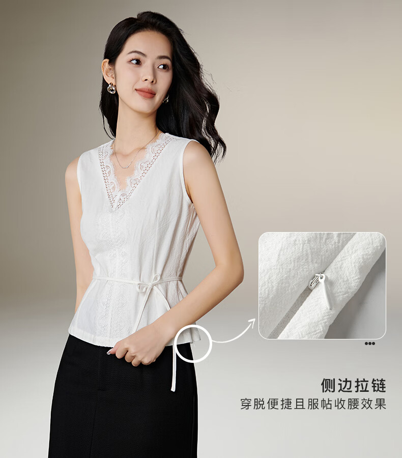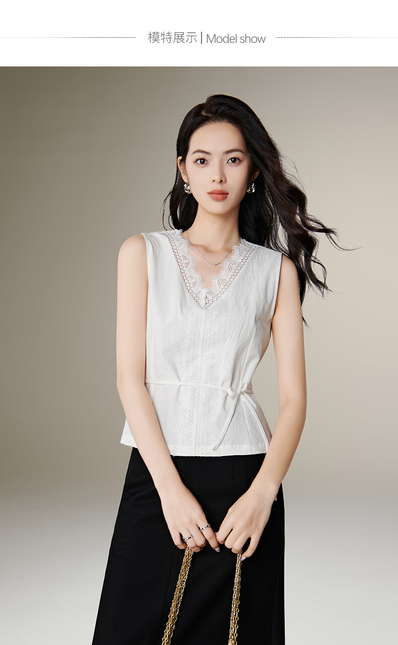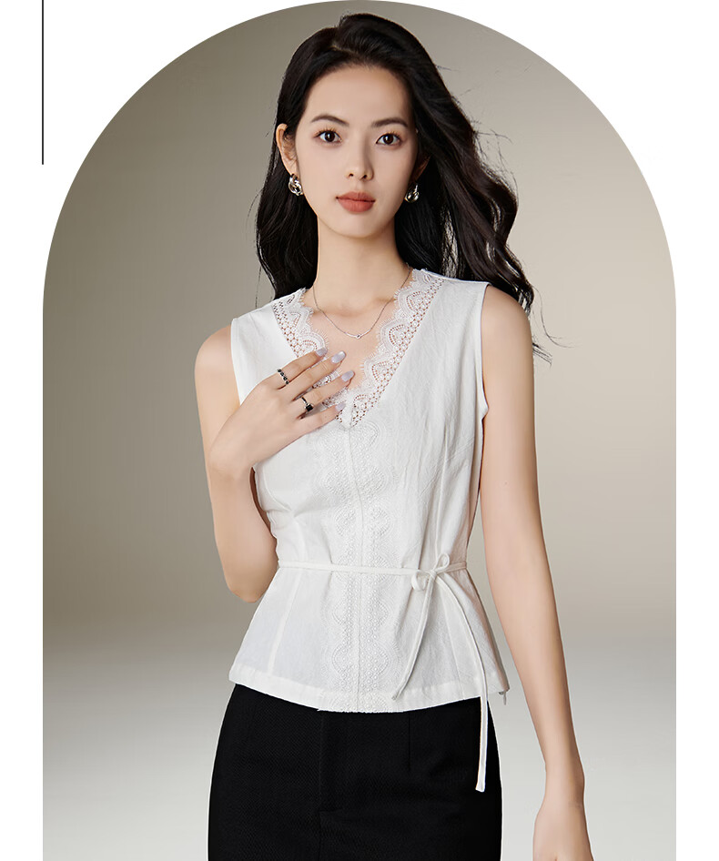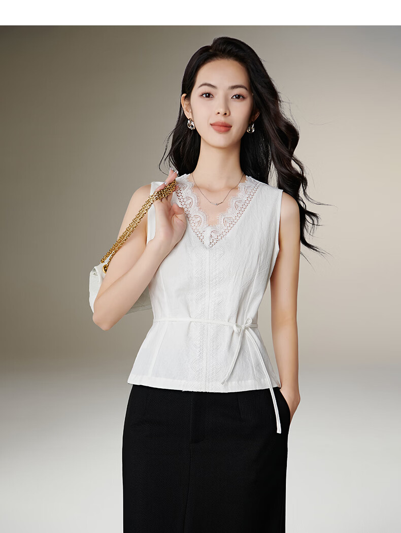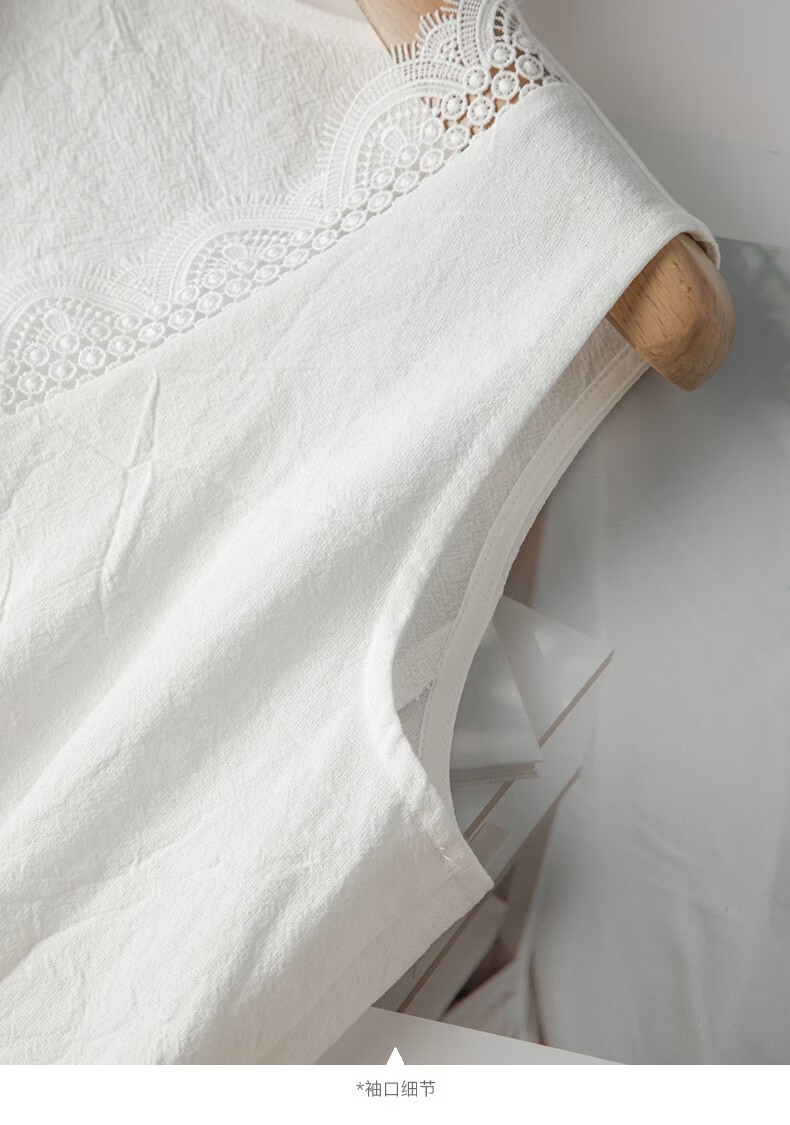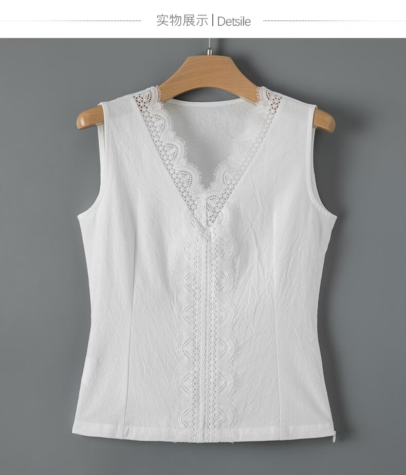 晚白【新品】2026年春款时尚蕾丝花边V领上衣全棉亲肤柔软无袖衬衫女 白色 L