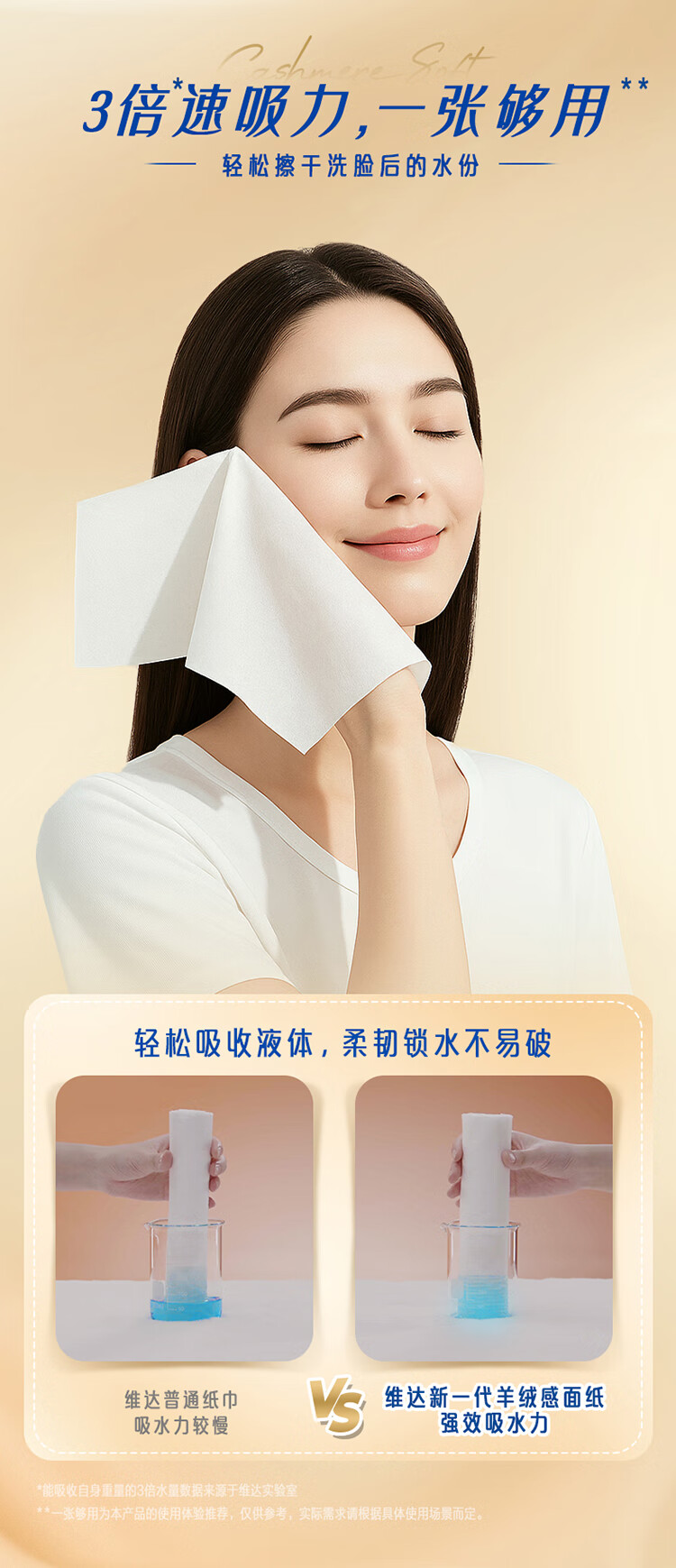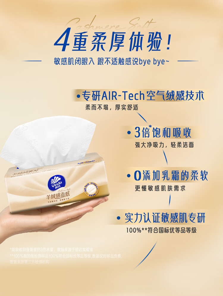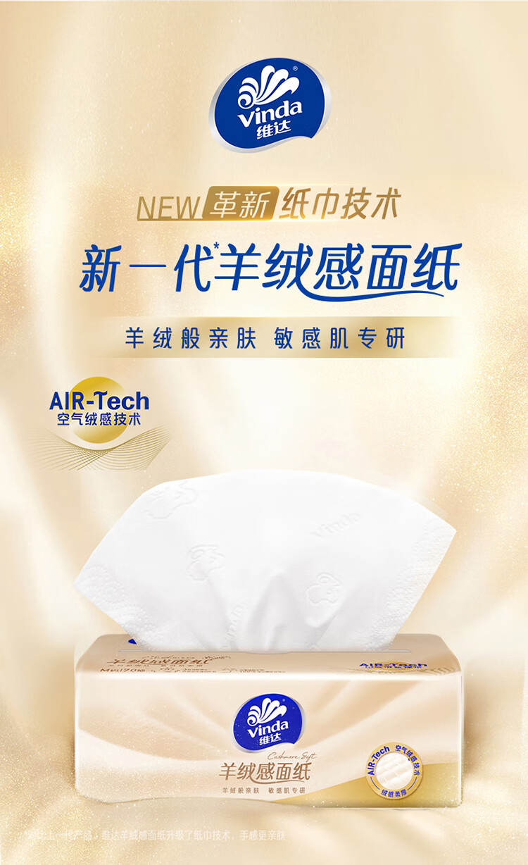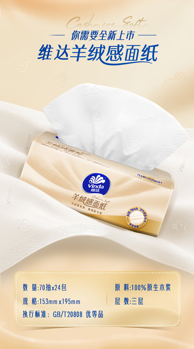 维达(Vinda)抽纸 羊绒感面纸70抽*24包M码 敏感肌适用 卫生纸纸巾 纸抽整箱