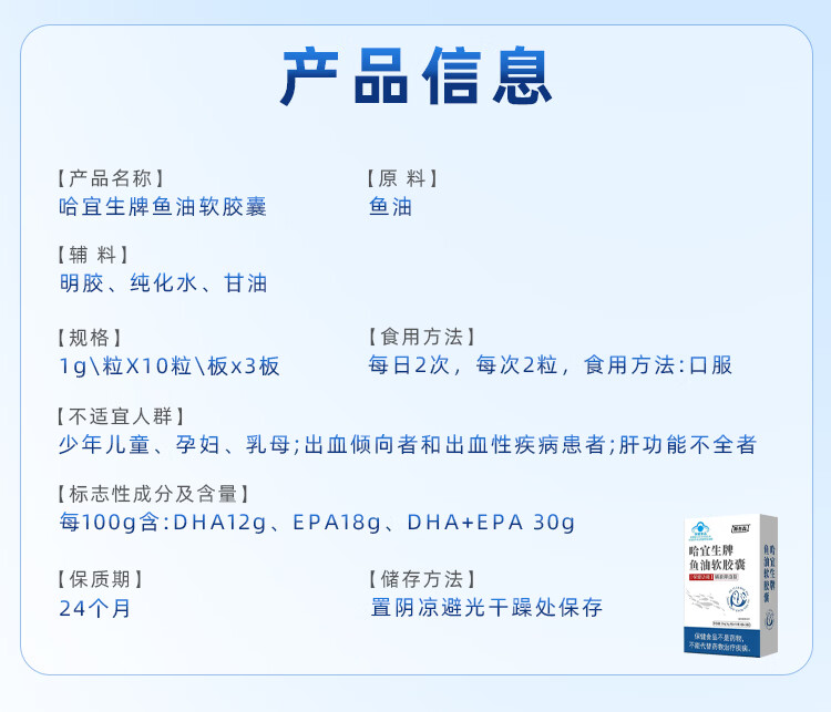 斯普森哈宜生牌鱼油软胶囊蓝帽认证鱼油omega3成人中老年1g/粒*30粒 30粒*10盒 巩固装 鱼油