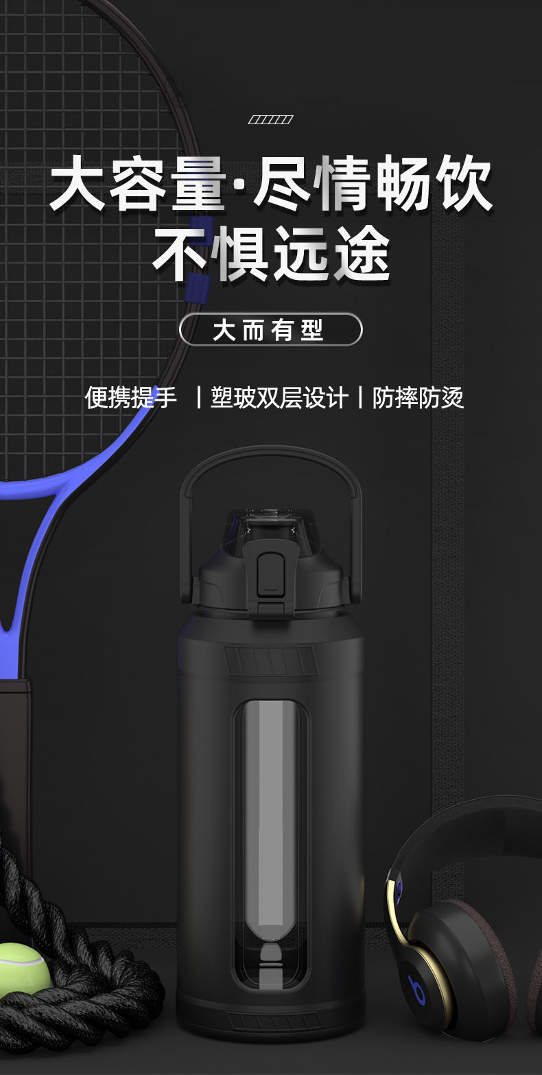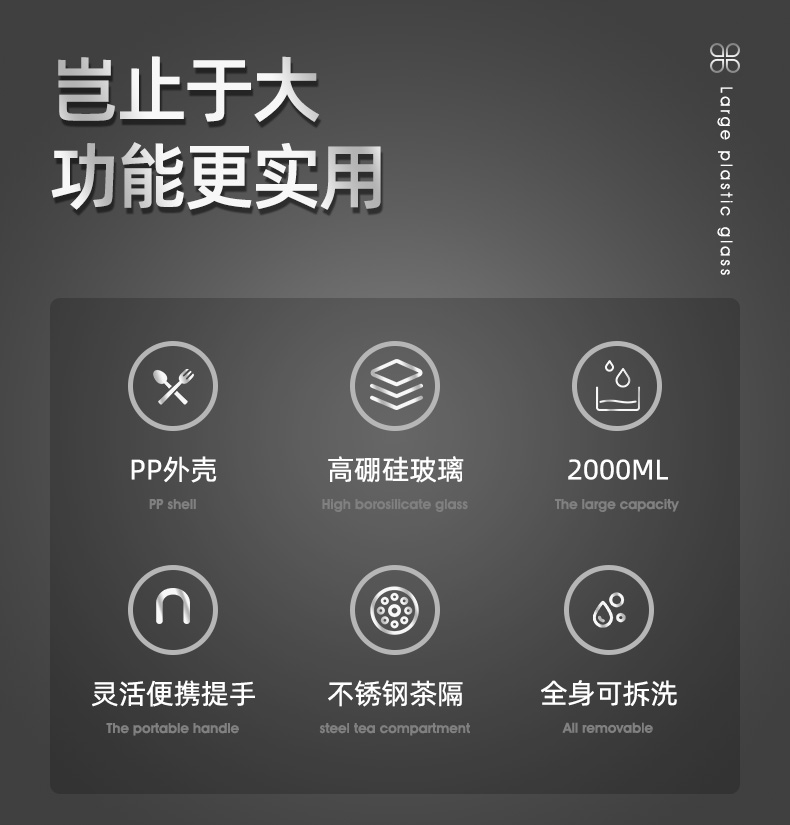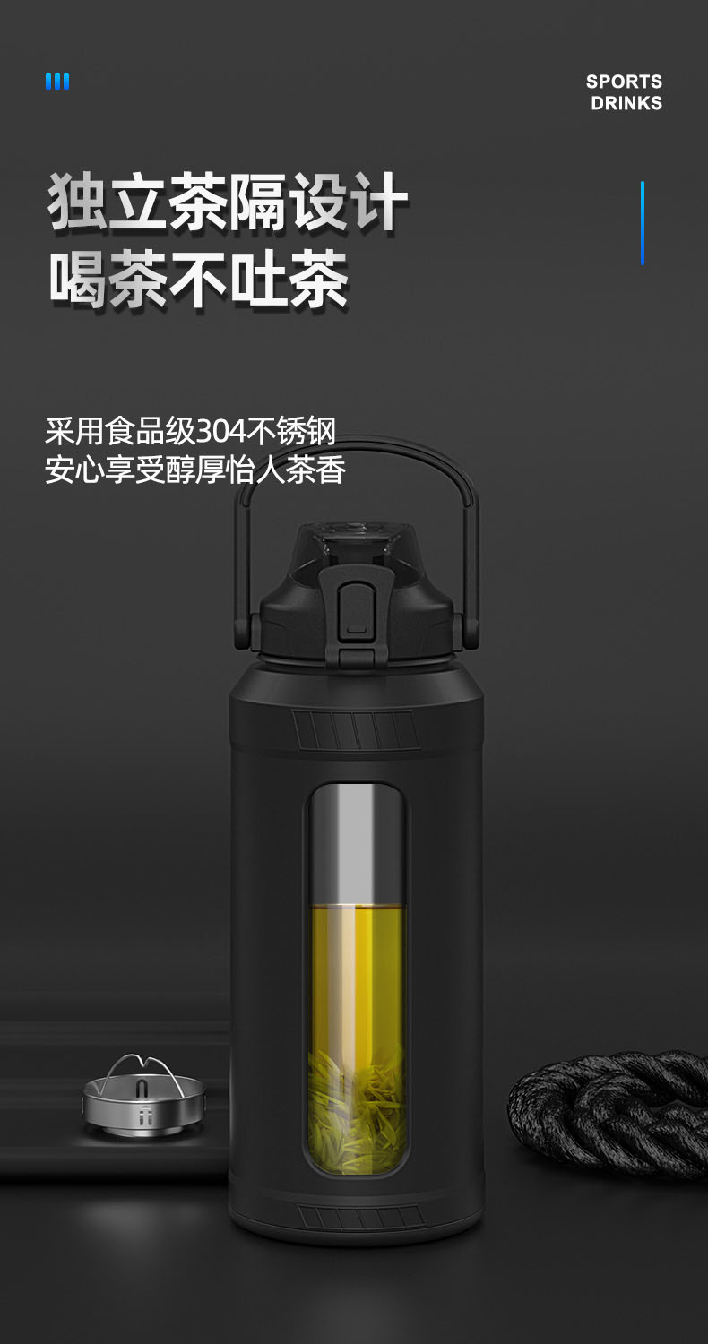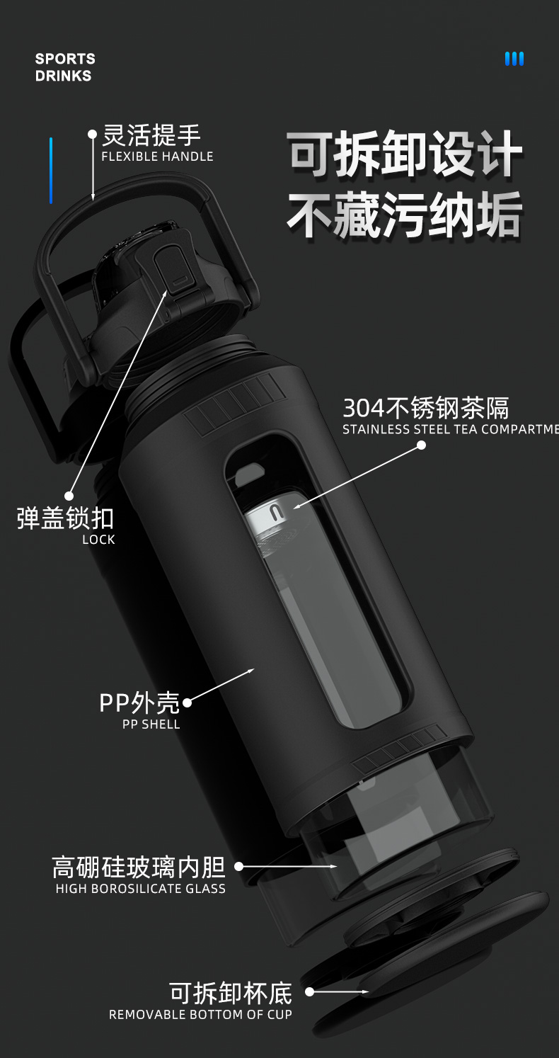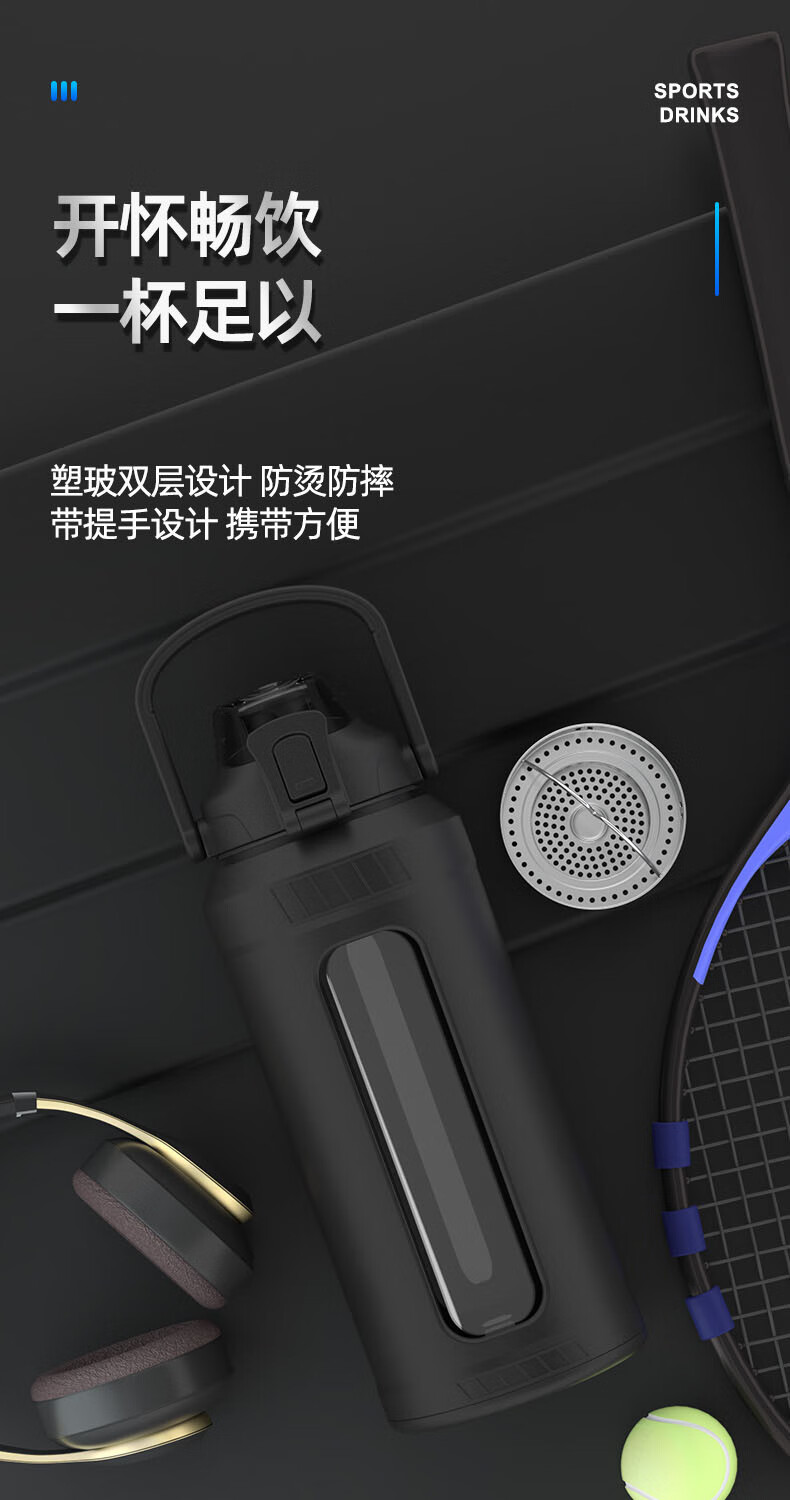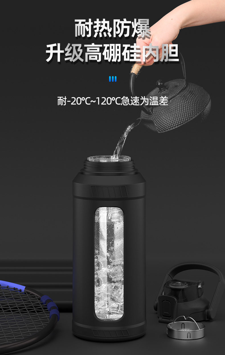 GROOT大容量玻璃杯耐高温防摔防爆运动吸管水杯子便携泡茶杯超大号水壶 【加厚防摔+茶隔】2000ml