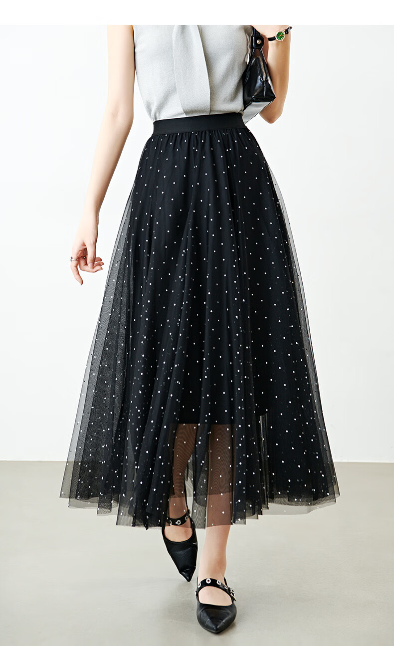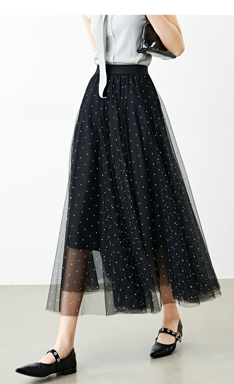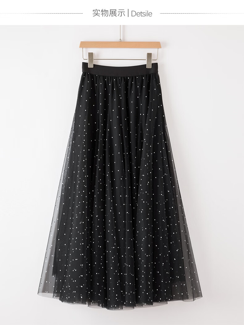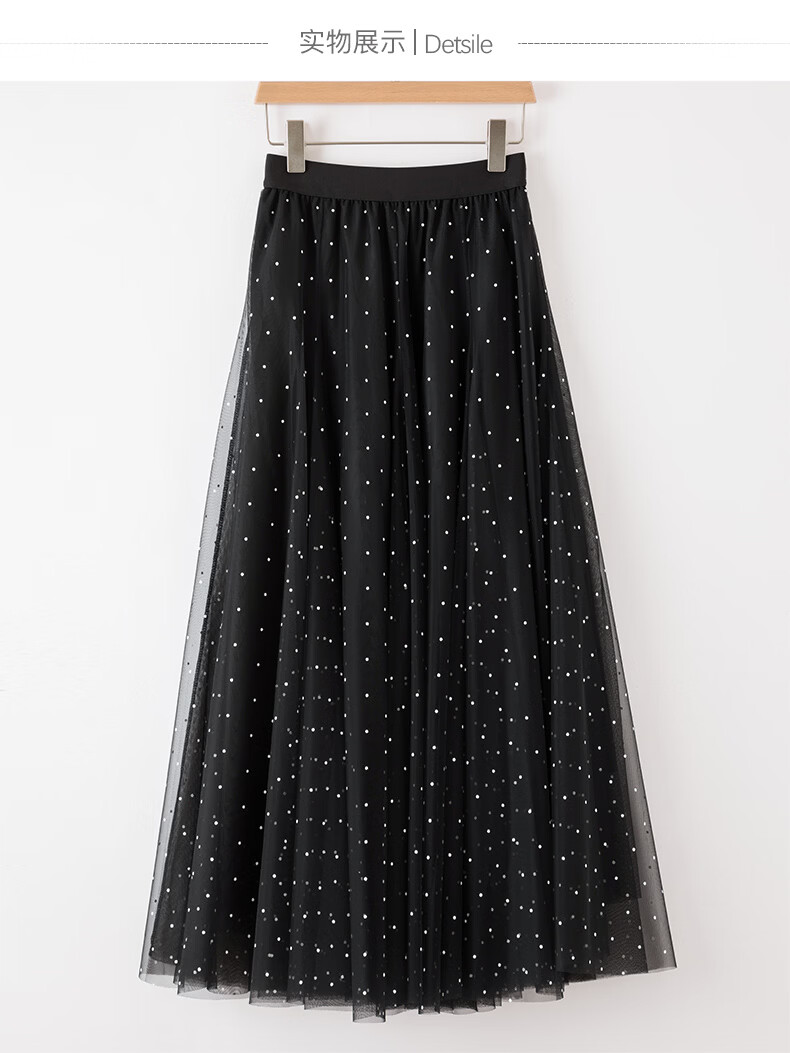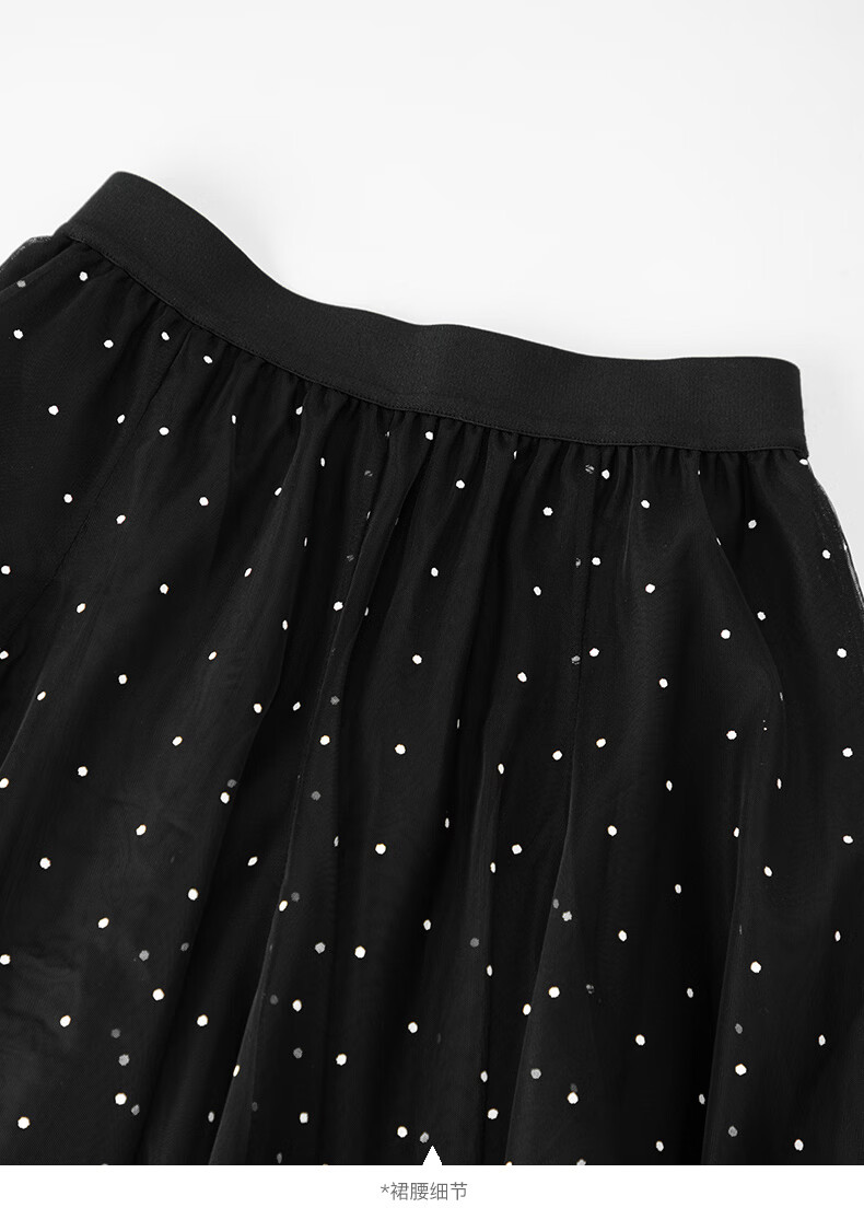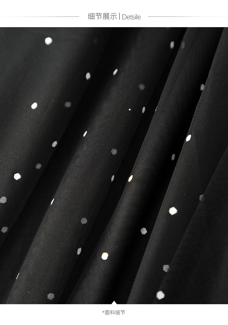 晚白复古波点网纱半裙2026春款港风层次感飘逸透气大摆a字半身裙 黑色 XL