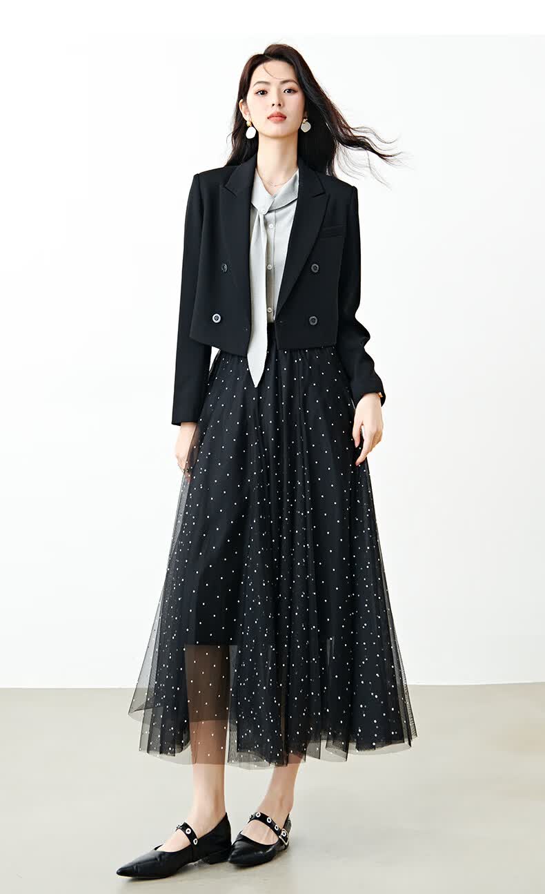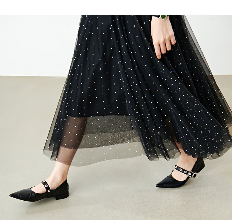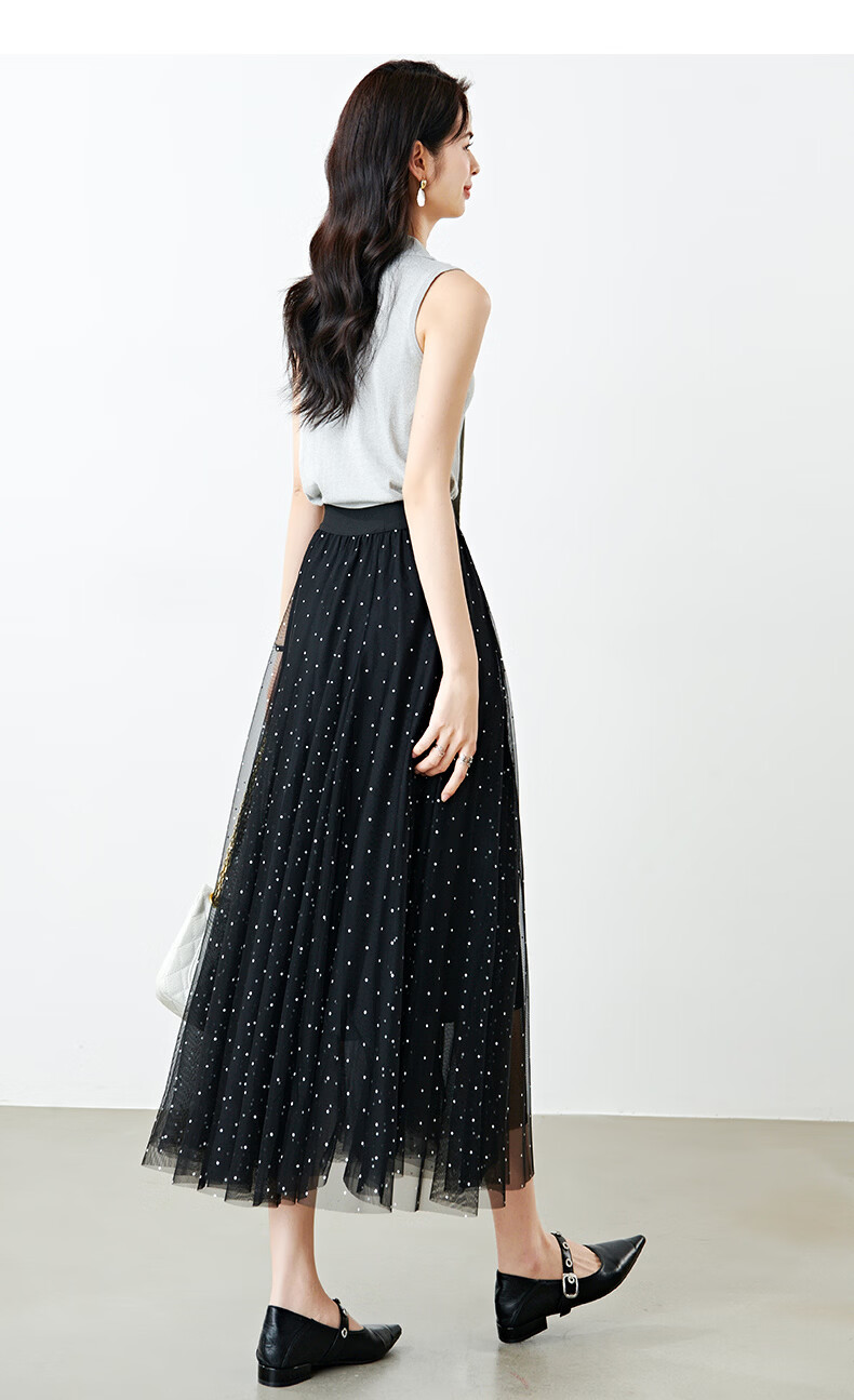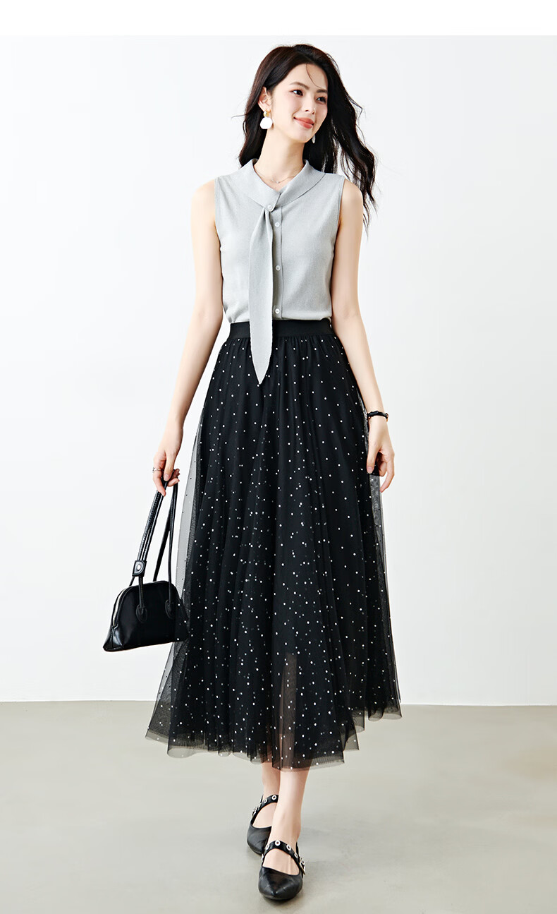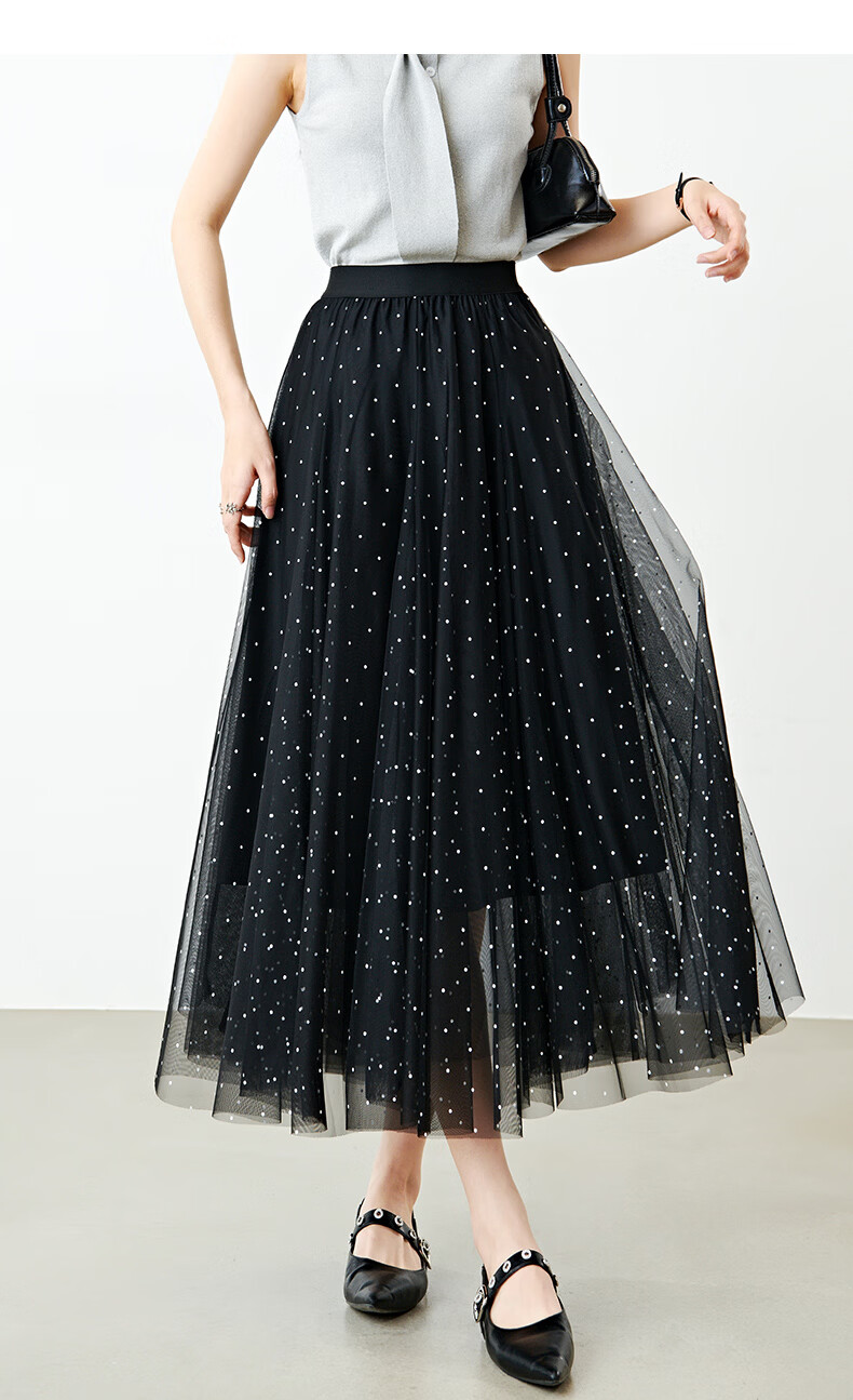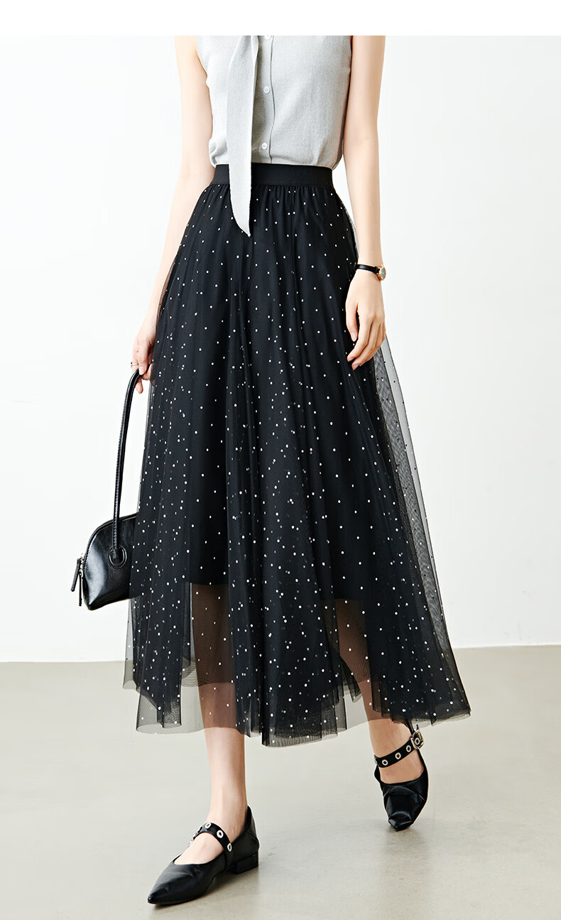晚白复古波点网纱半裙2026春款港风层次感飘逸透气大摆a字半身裙 黑色 XL