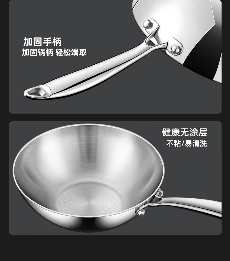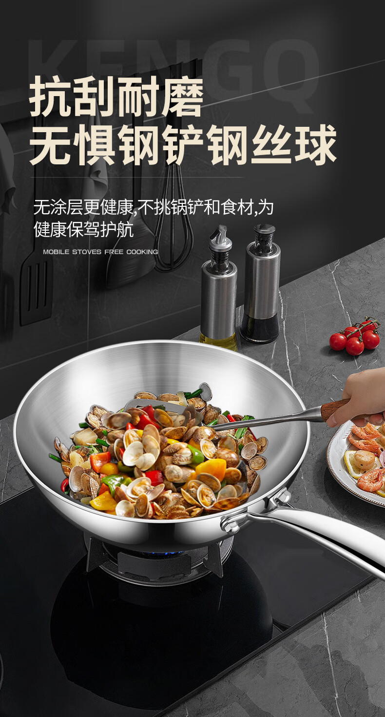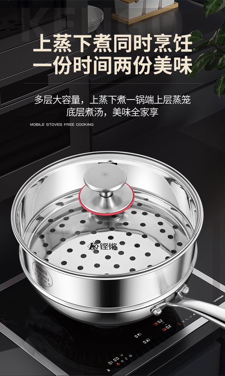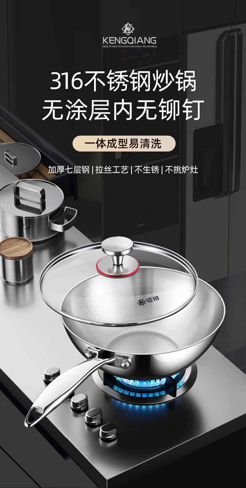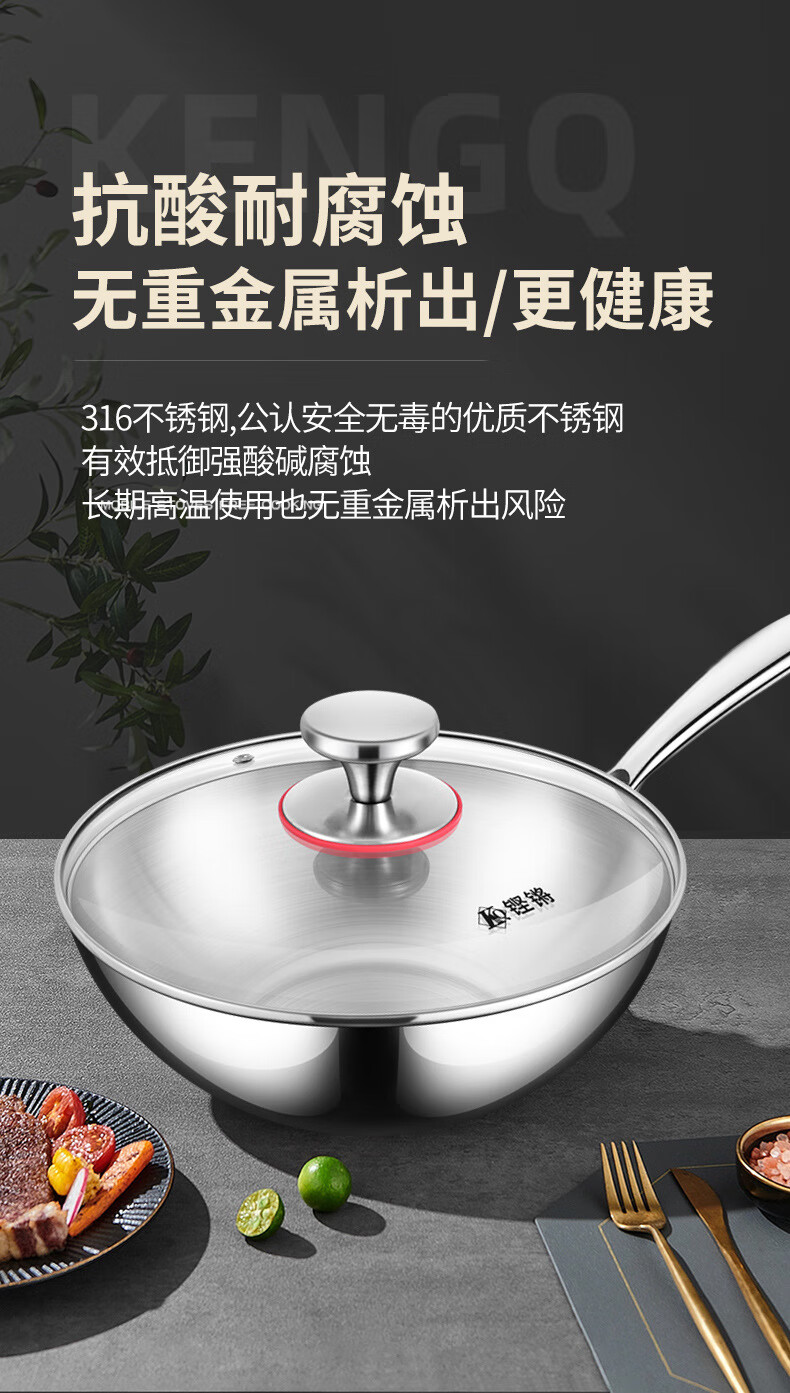 铿锵316不锈钢炒锅家用电磁炉通用一人食平底炒菜锅无涂层不粘小炒锅 30cm 带盖+蒸格【316加厚无涂层】