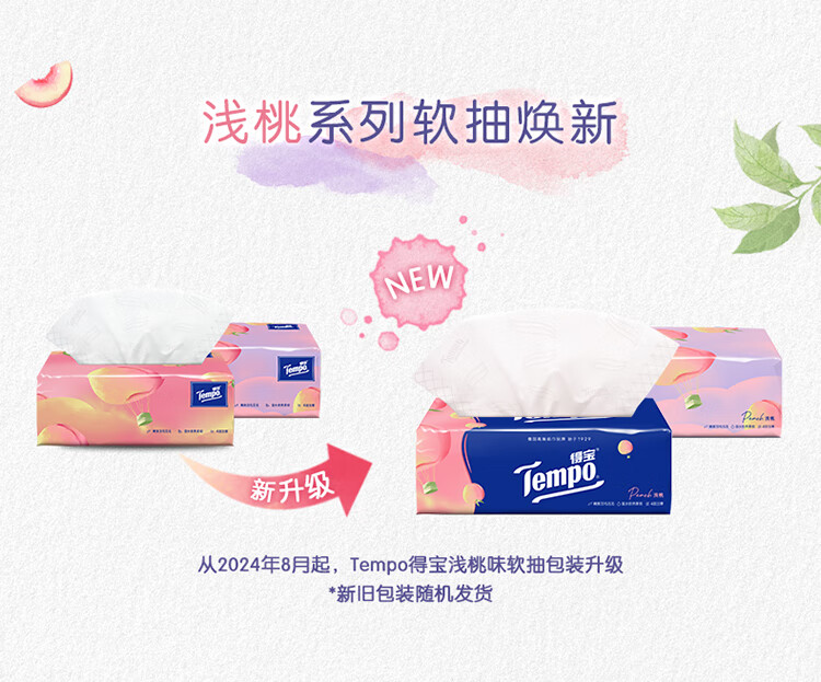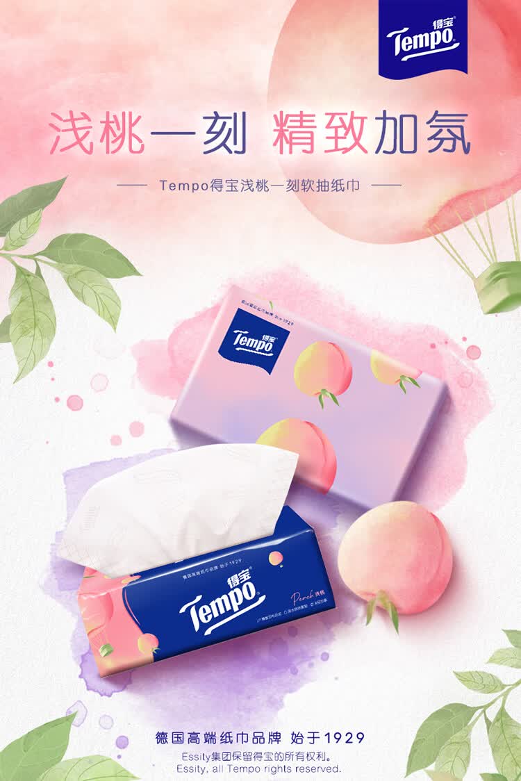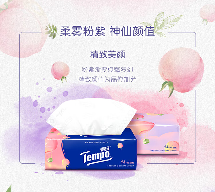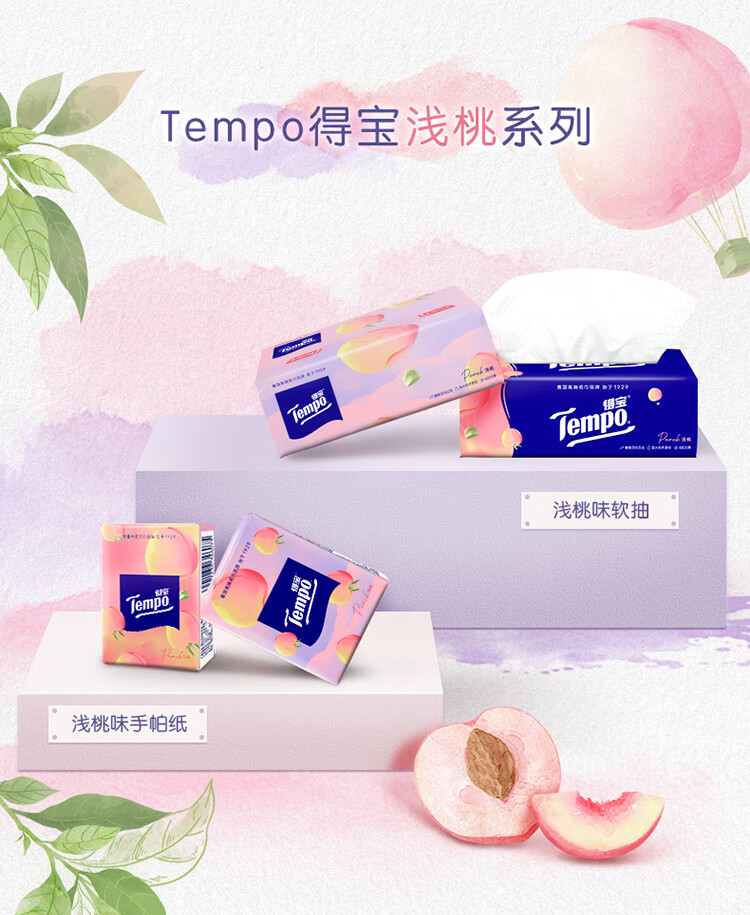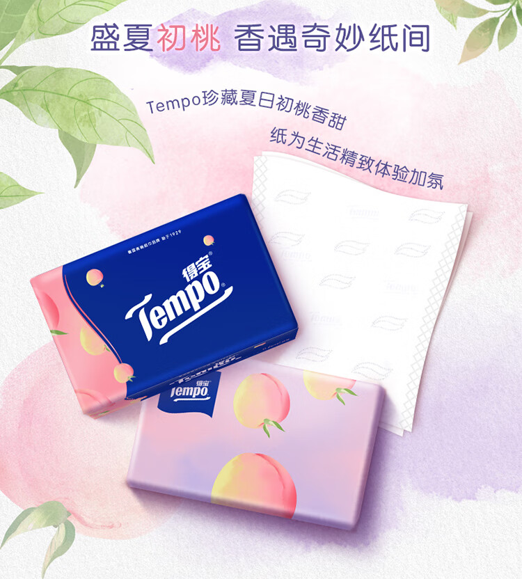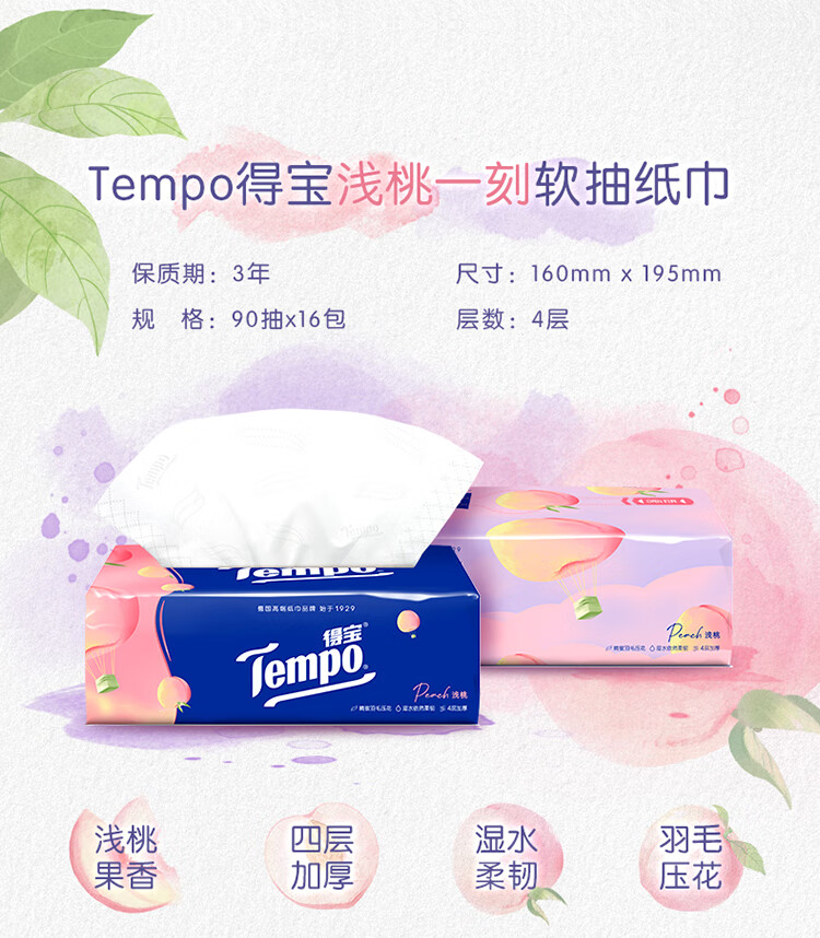得宝(TEMPO)一博同款 抽纸 真M码 甜心桃味4层90抽*16包 湿水不易破 纸巾