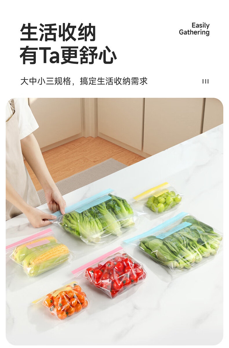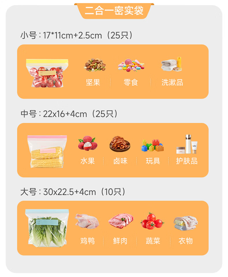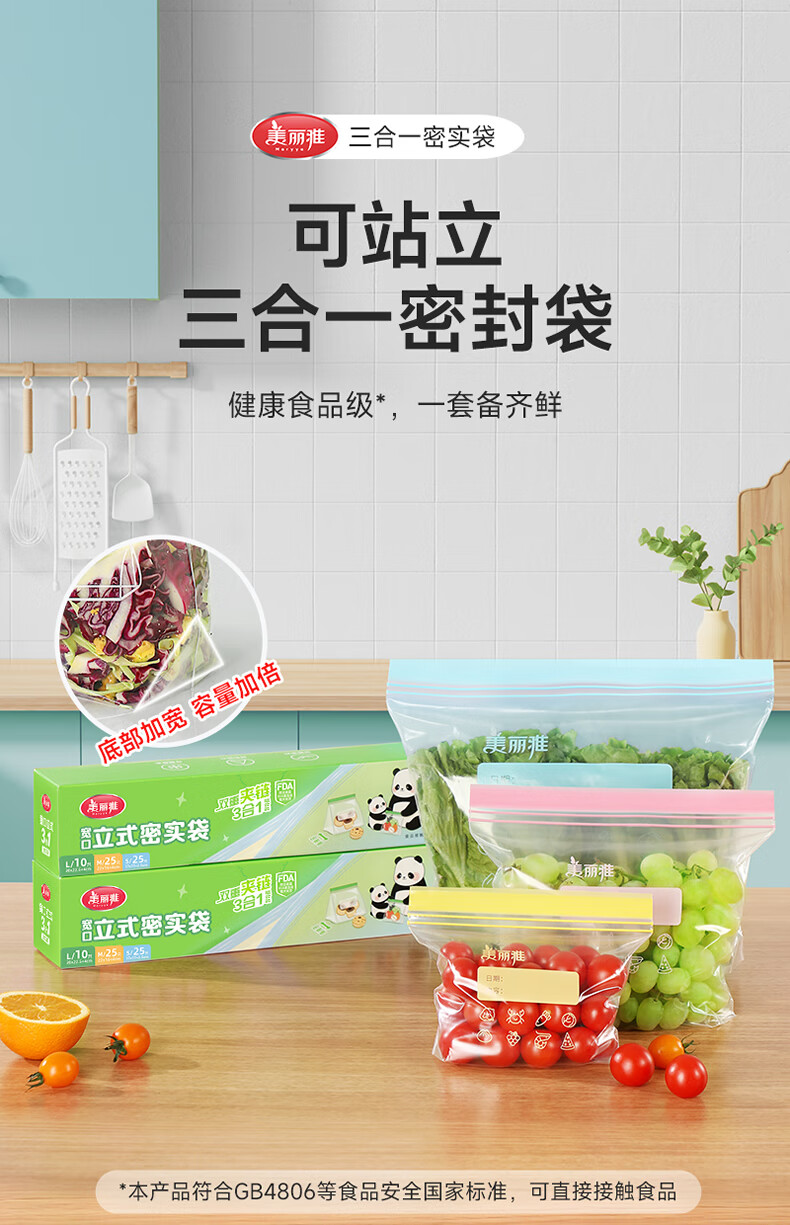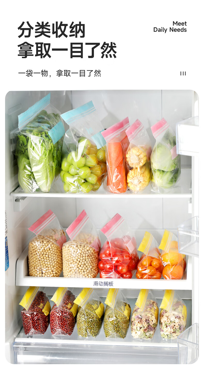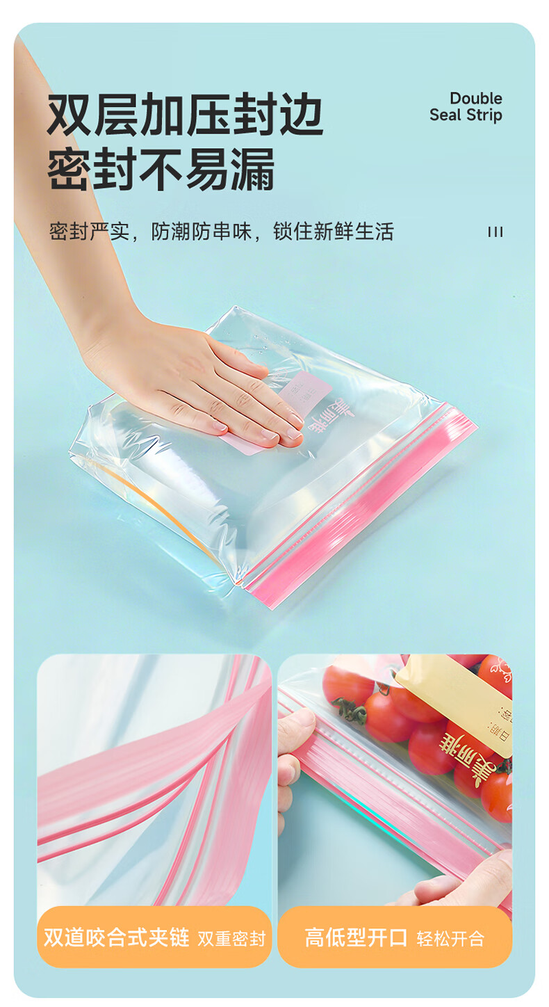 美丽雅密封袋食品级 大中小号共60只 站立冰箱分装收纳密实保鲜袋