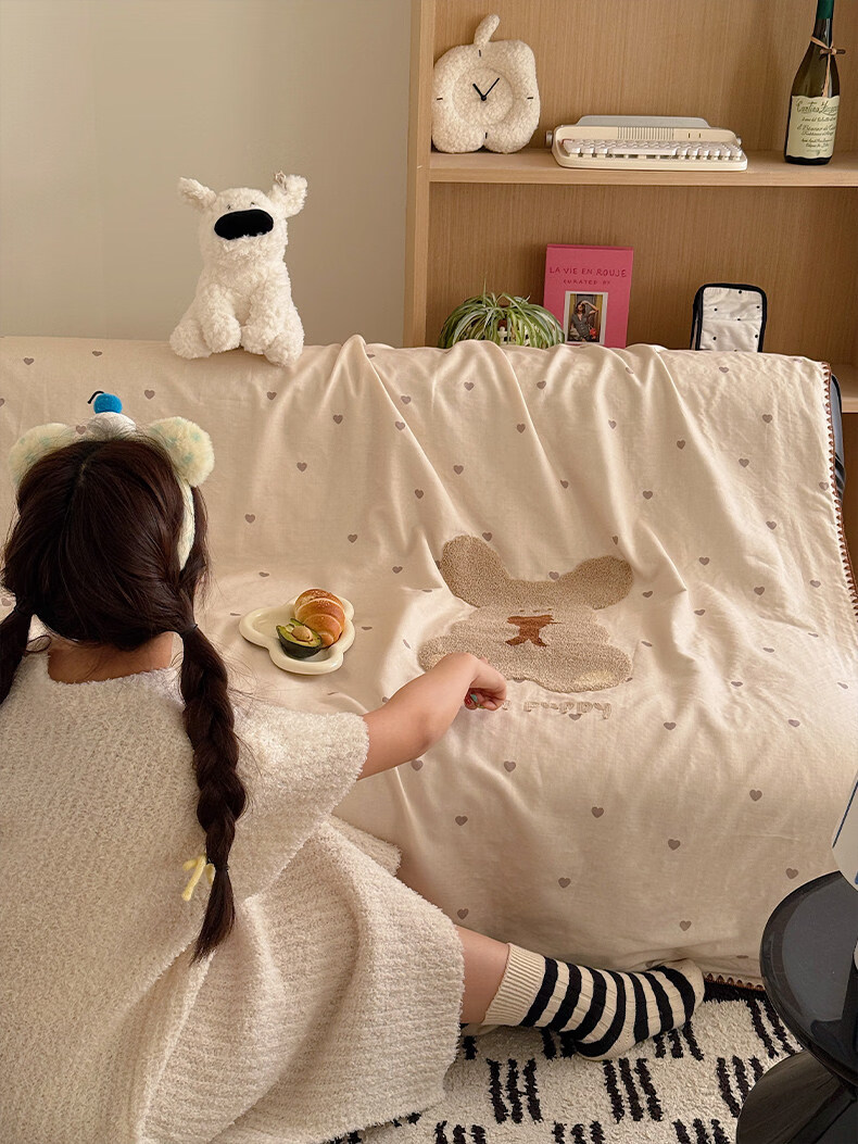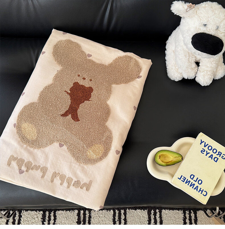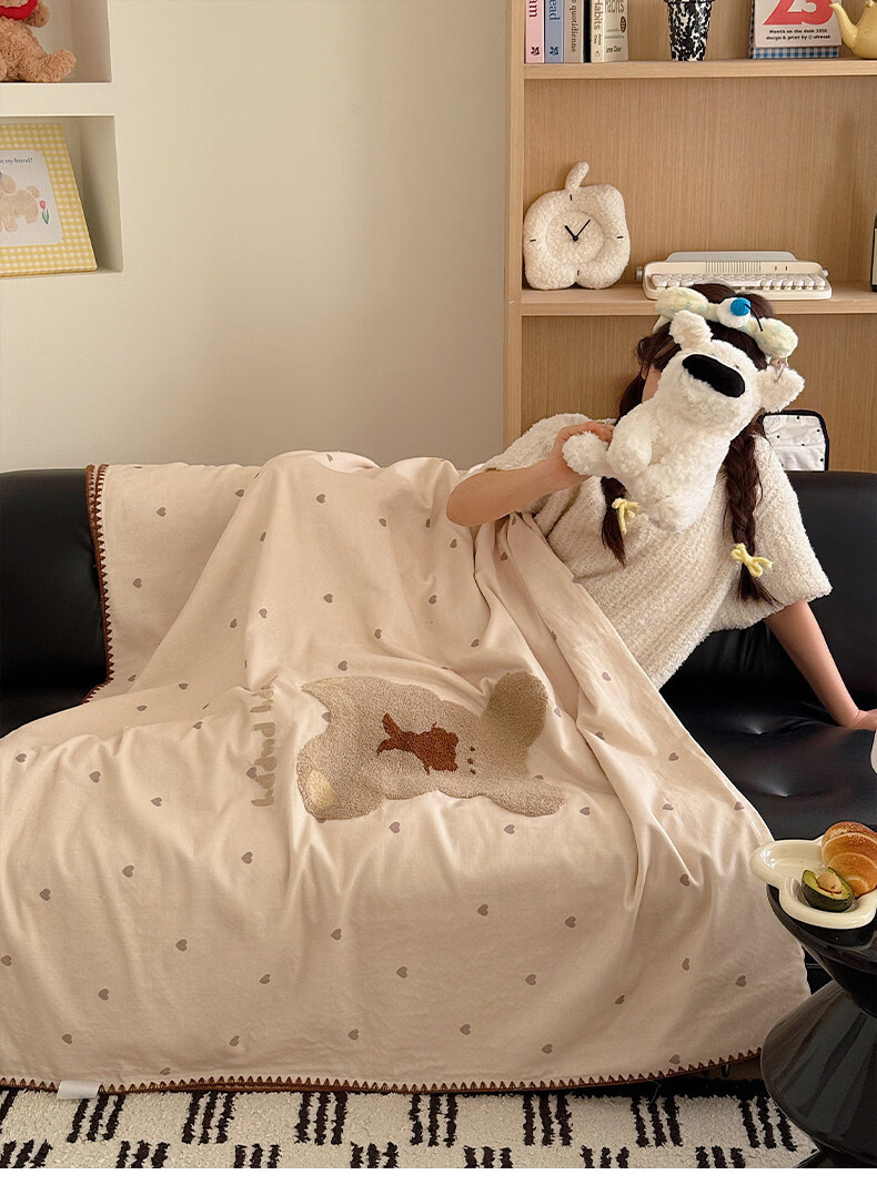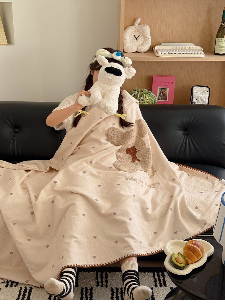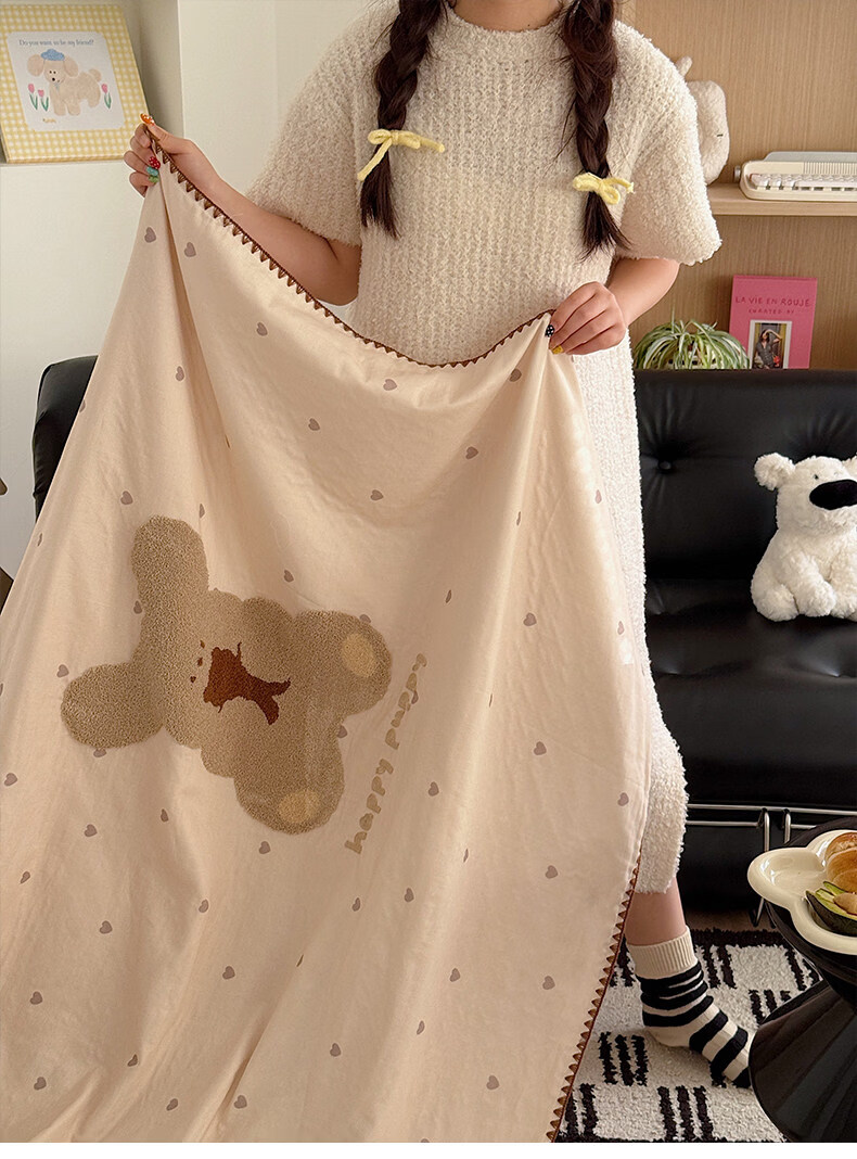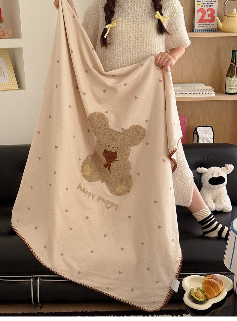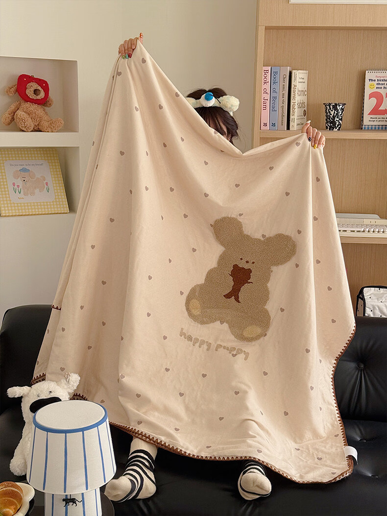 苏萱卡通抱熊小狗毛巾绣全棉双层纱毛毯儿童学生宿舍毯子午睡沙发盖毯 苹果小狗 单人毯:150x200cm