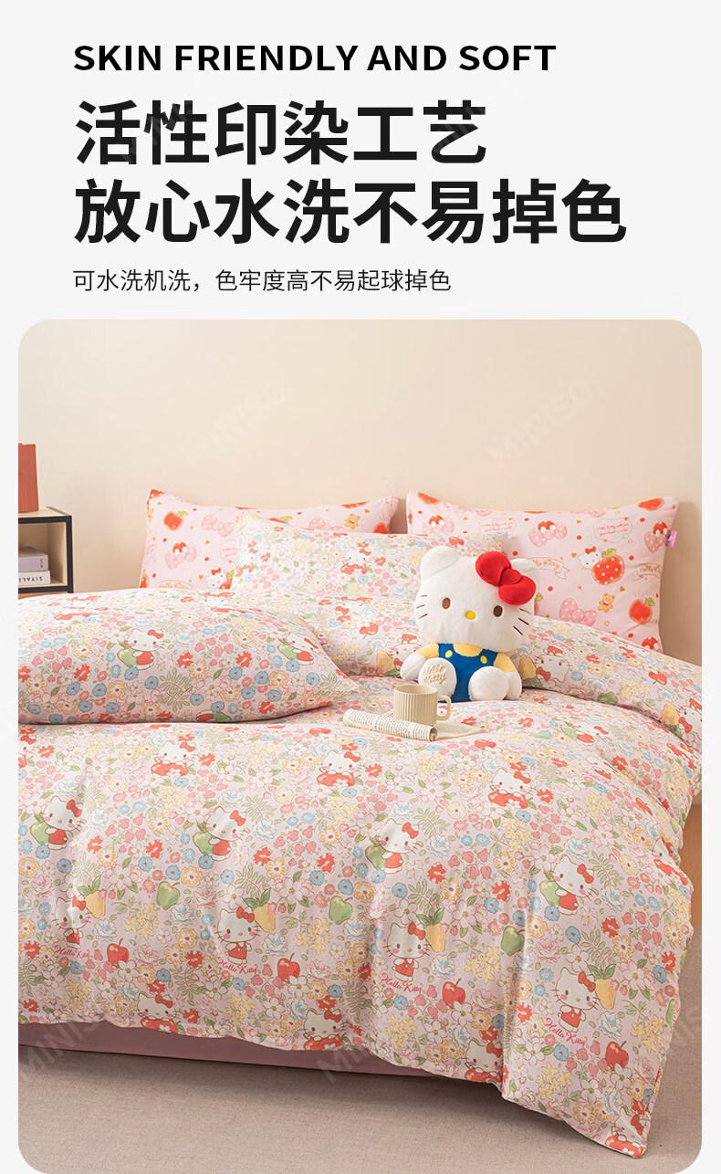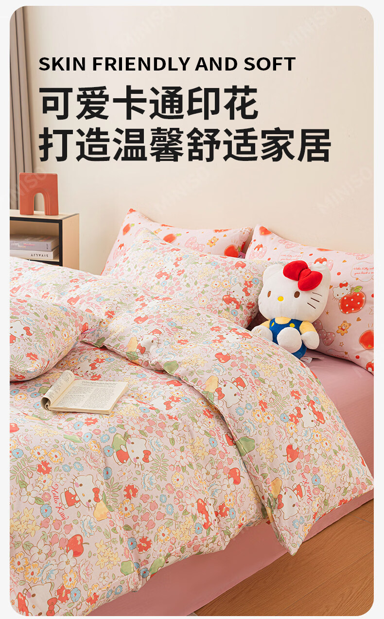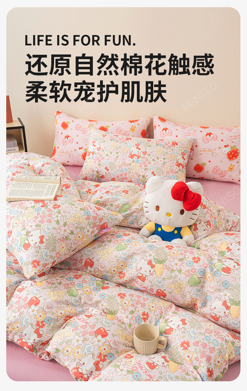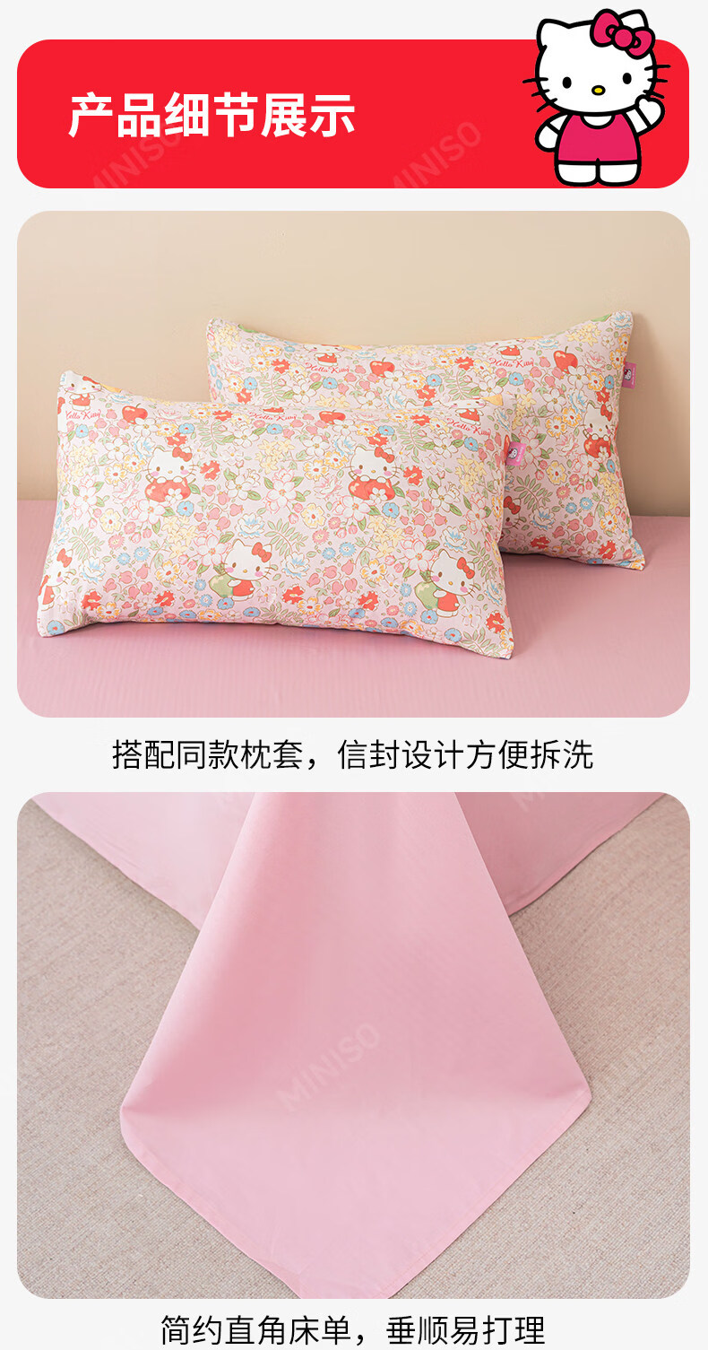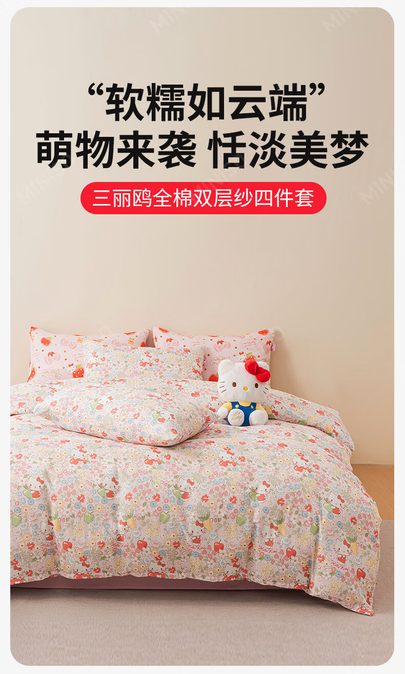 名创优品(MINISO)HelloKitty全棉床上四件套 纯棉双层纱被套床单轻奢单双人三件套 MINISO-花房日记 1.2 床单款 三件套(被套150*200cm)