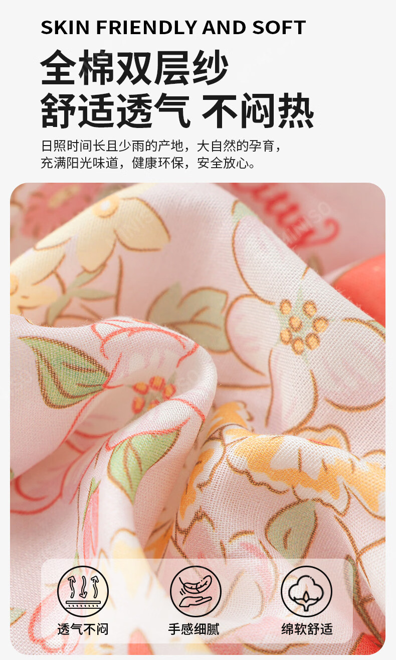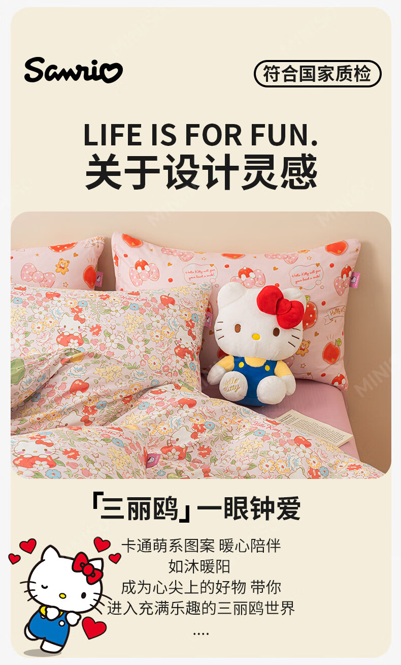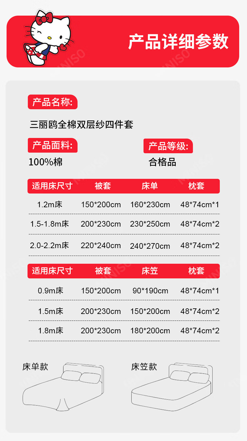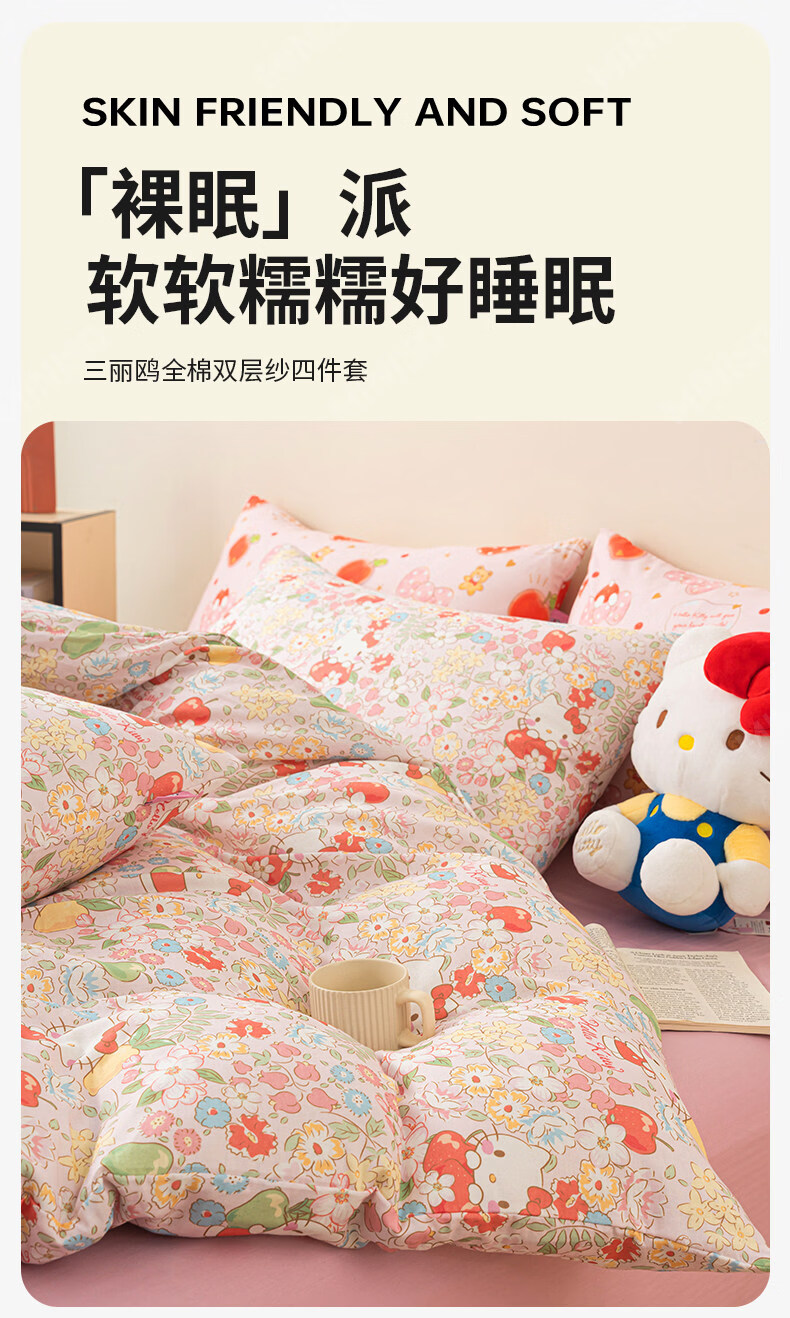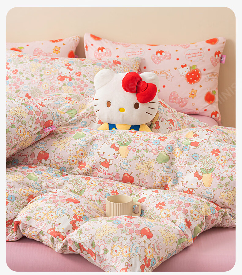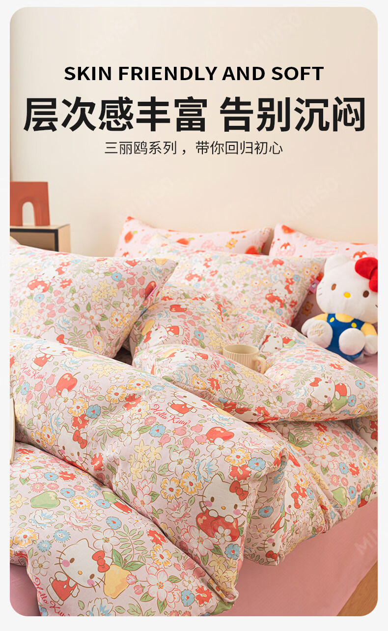 名创优品(MINISO)HelloKitty全棉床上四件套 纯棉双层纱被套床单轻奢单双人三件套 MINISO-花房日记 1.2 床单款 三件套(被套150*200cm)