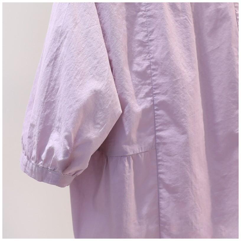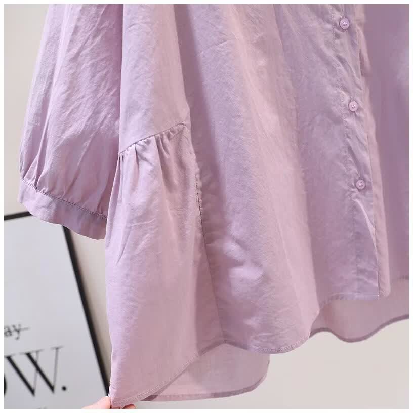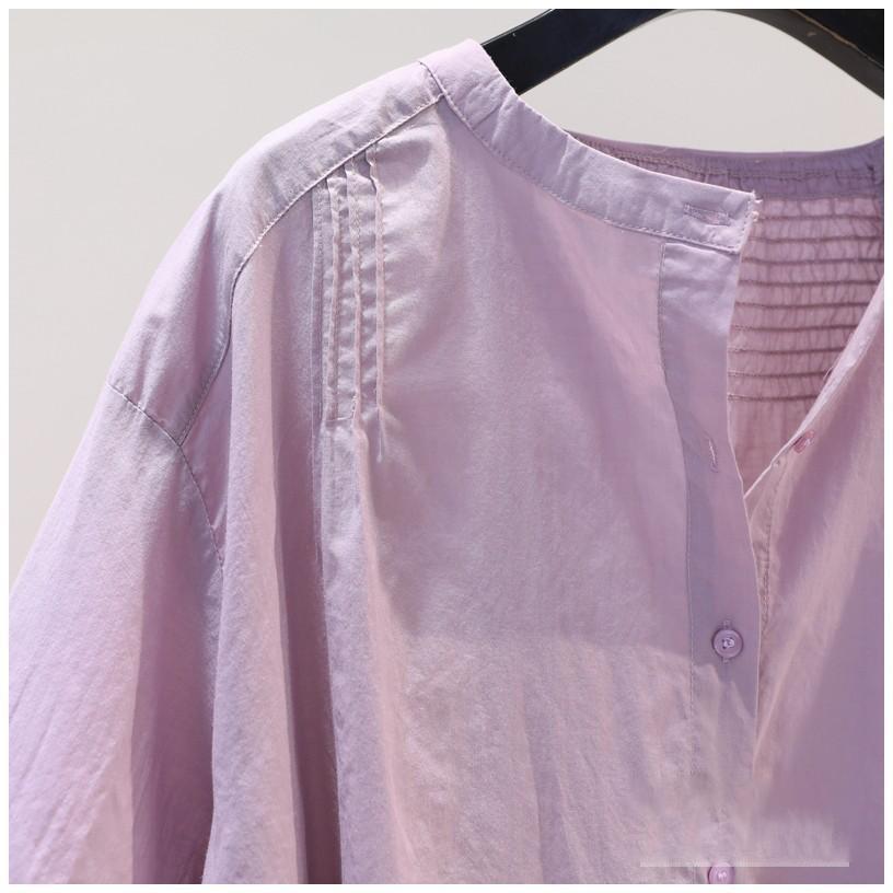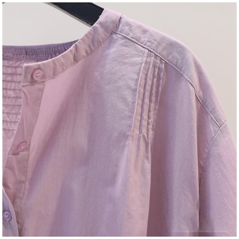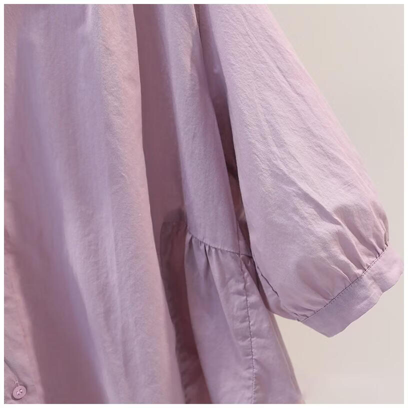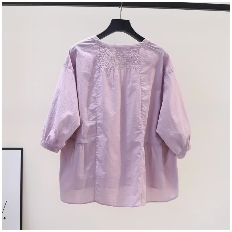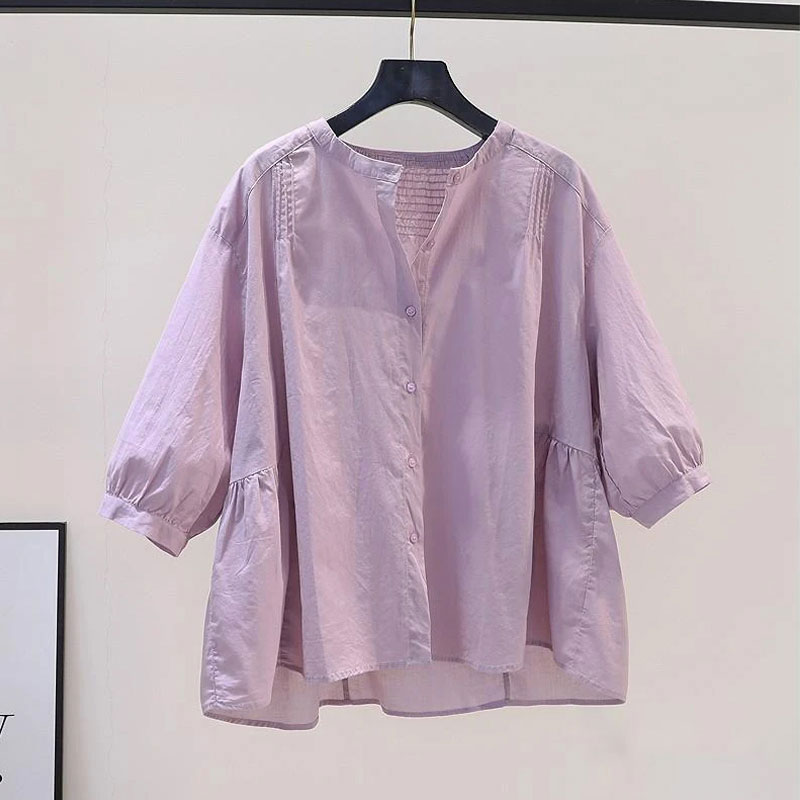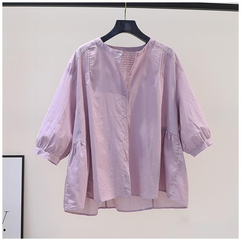 子牧棉麻2026春夏装 女洋气小衫宽松显瘦圆领开衫五分袖衬衫上衣8013 紫色 M (建议95-115斤)