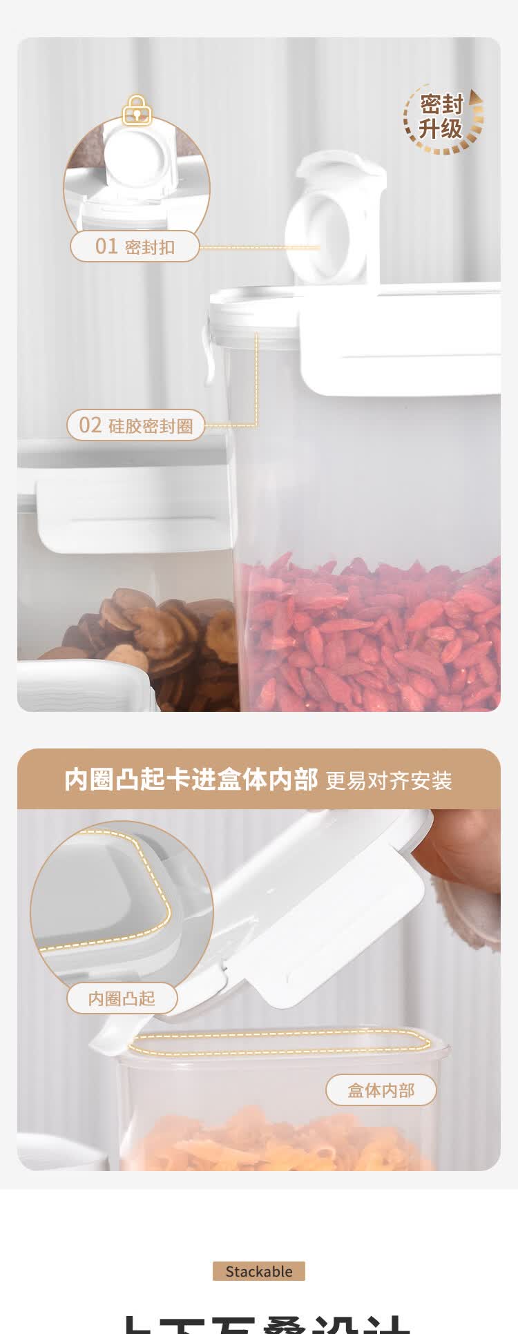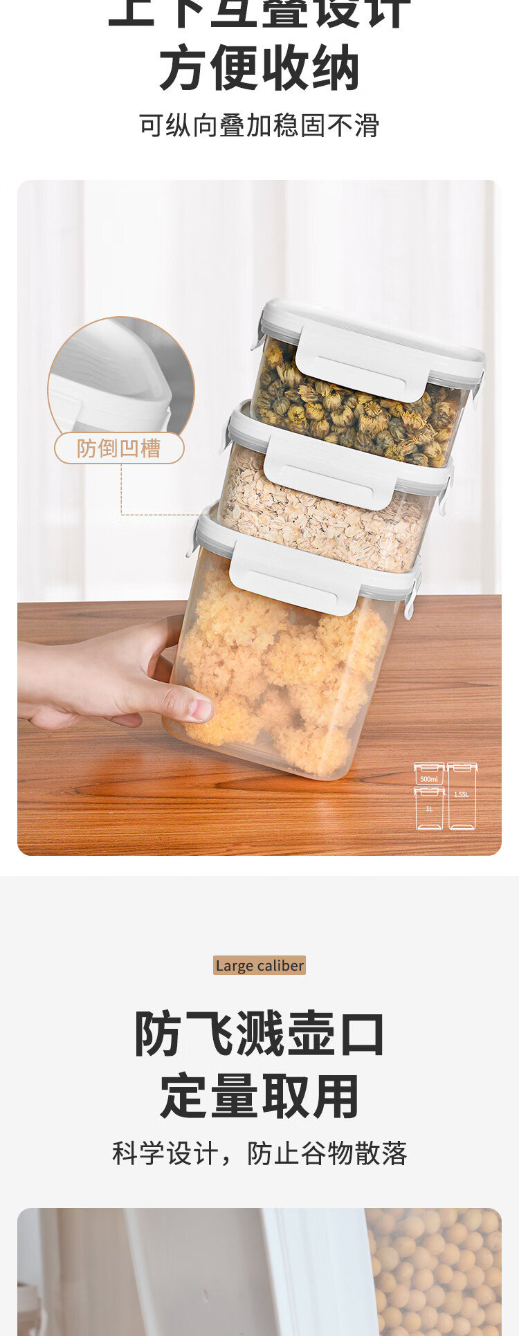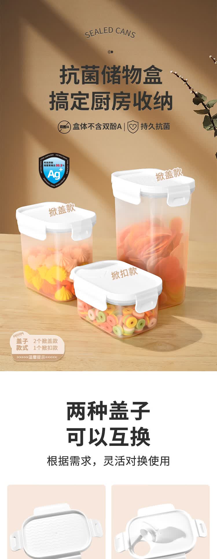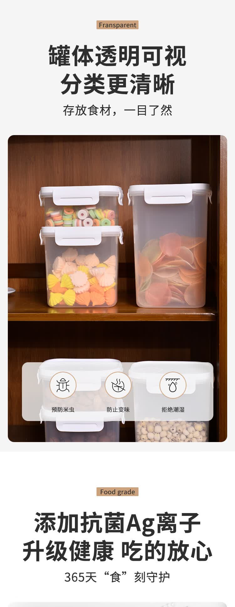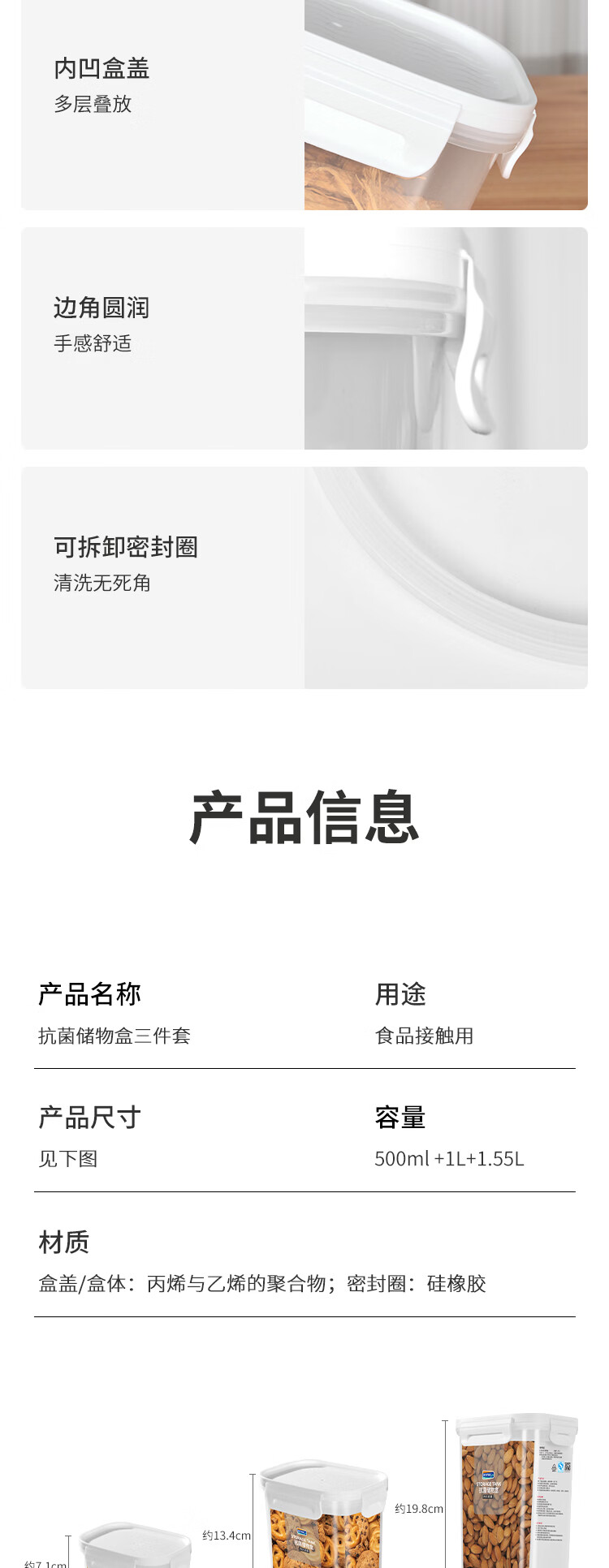 安买抗菌储物盒3件套 储物罐食品级塑料密封罐米桶厨房收纳盒S1289 【500ml+1L+1.55L】三件套