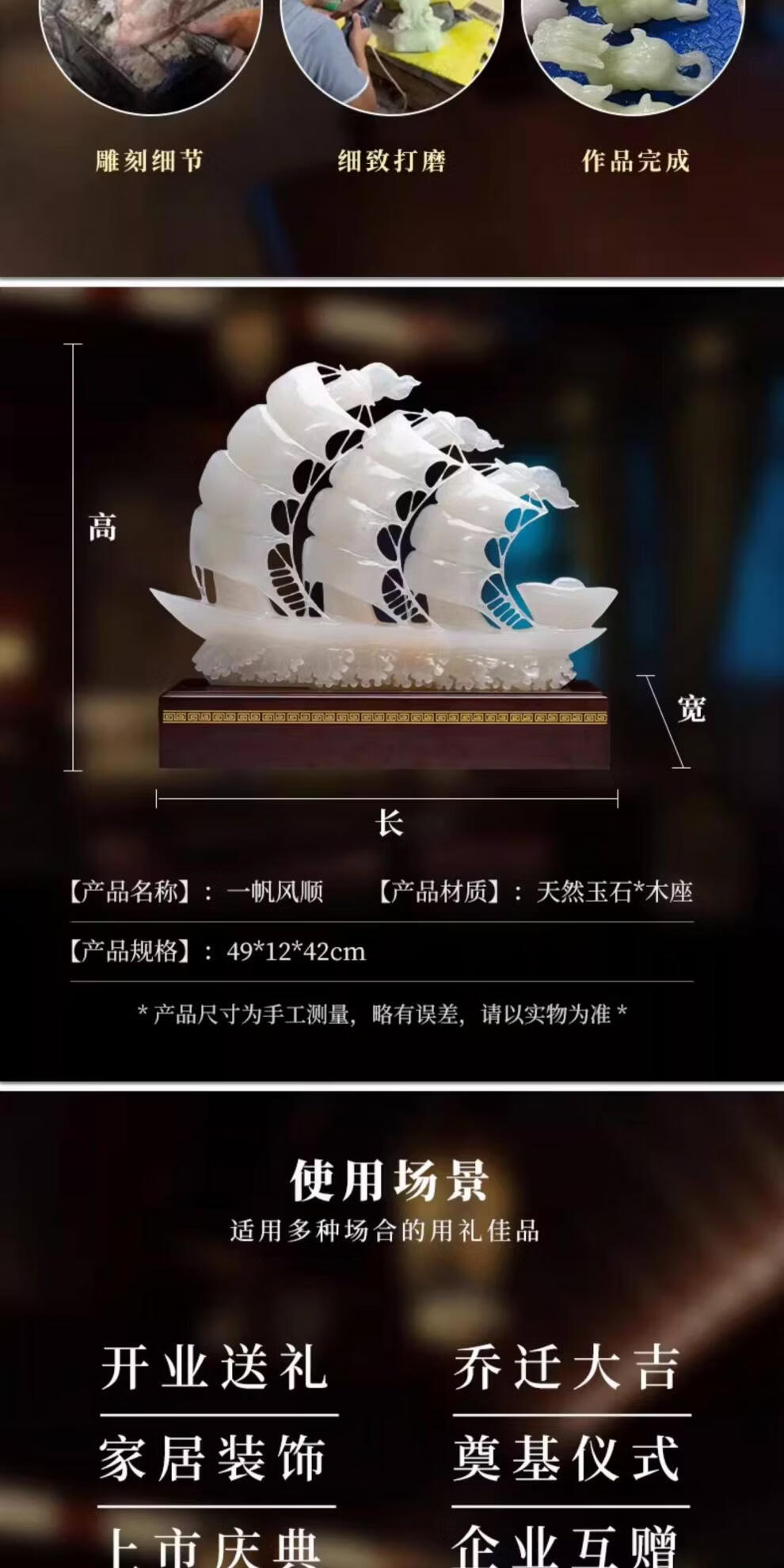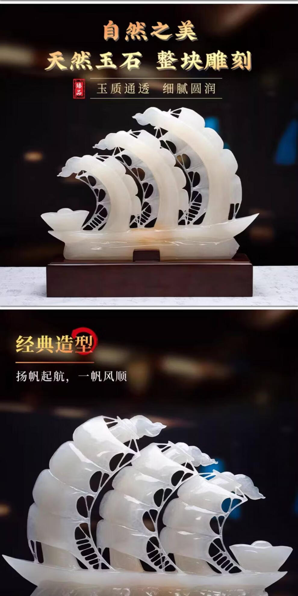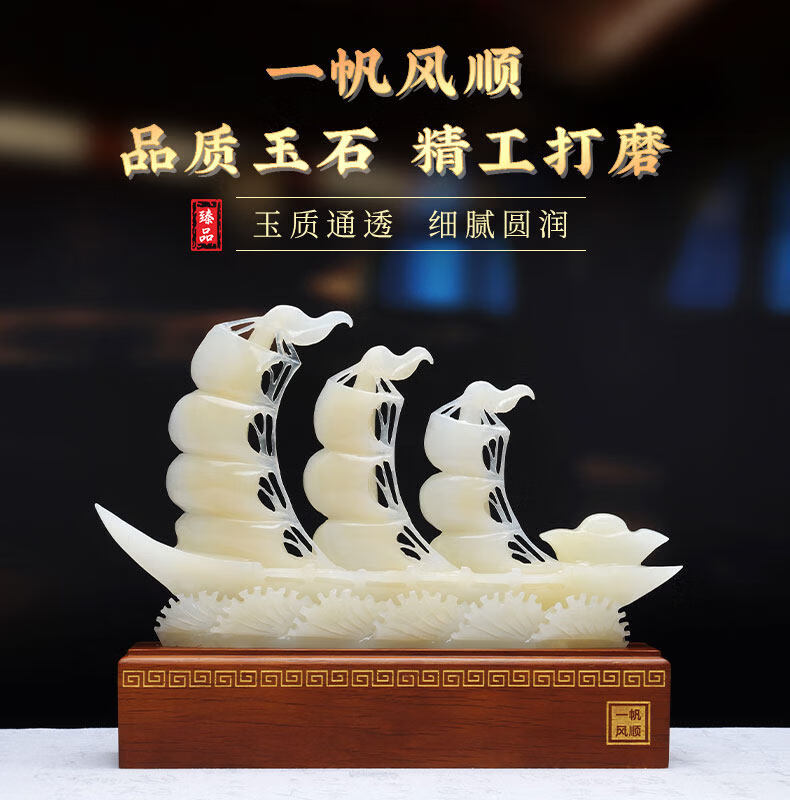 CLCEY天然玉石一帆风顺帆船摆件客厅玄关公司办公室开业装饰乔迁送礼品 D10红花冰玉(长55*高45cm)