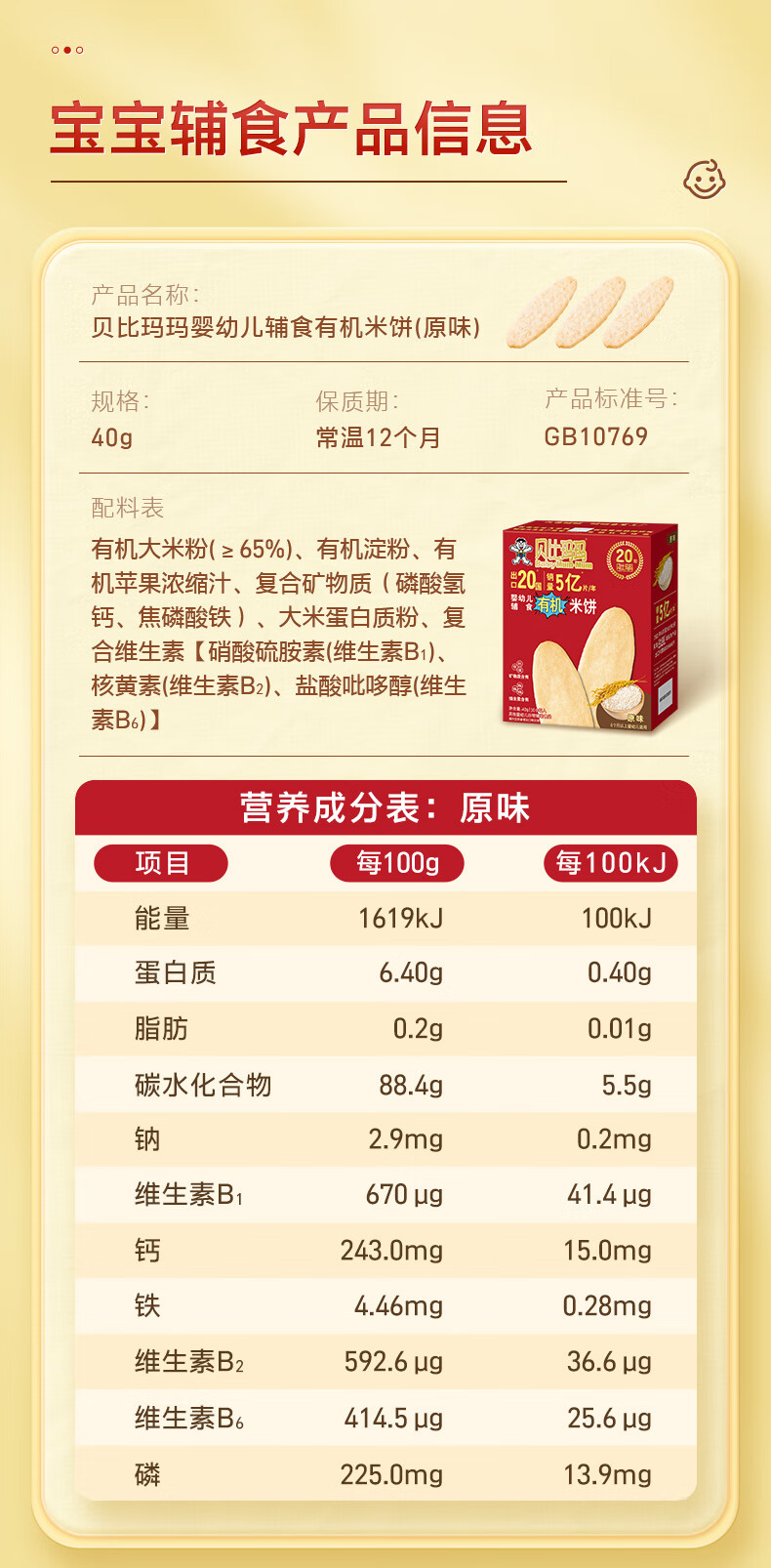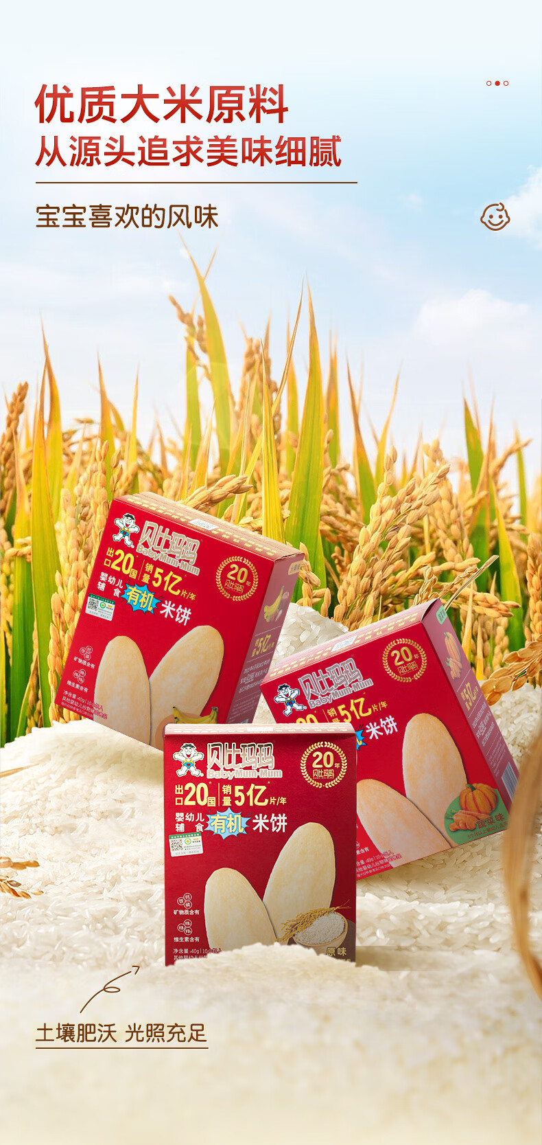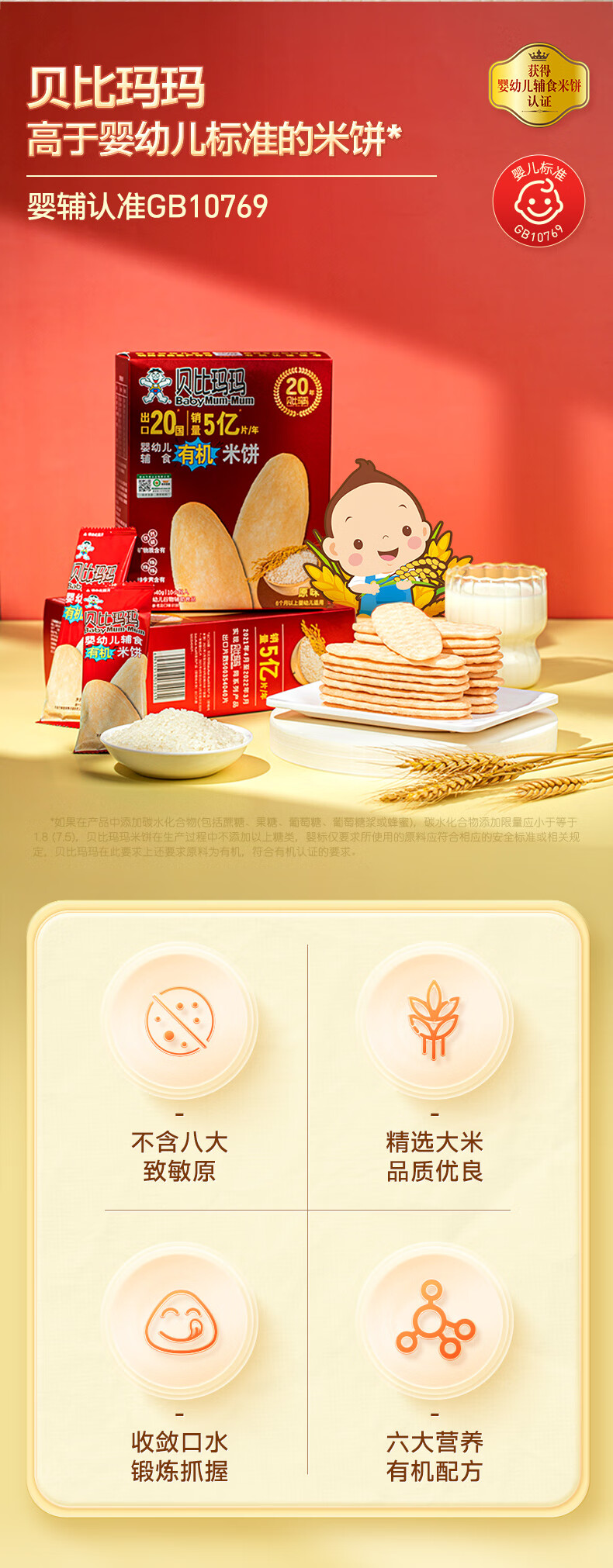 贝比玛玛旺旺婴幼儿有机米饼儿童婴儿零食宝宝磨牙棒饼干原味40g6个月以上