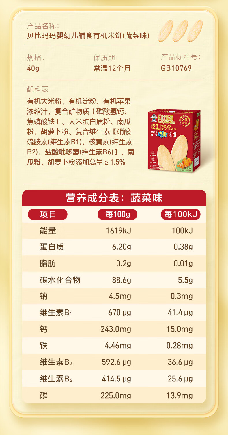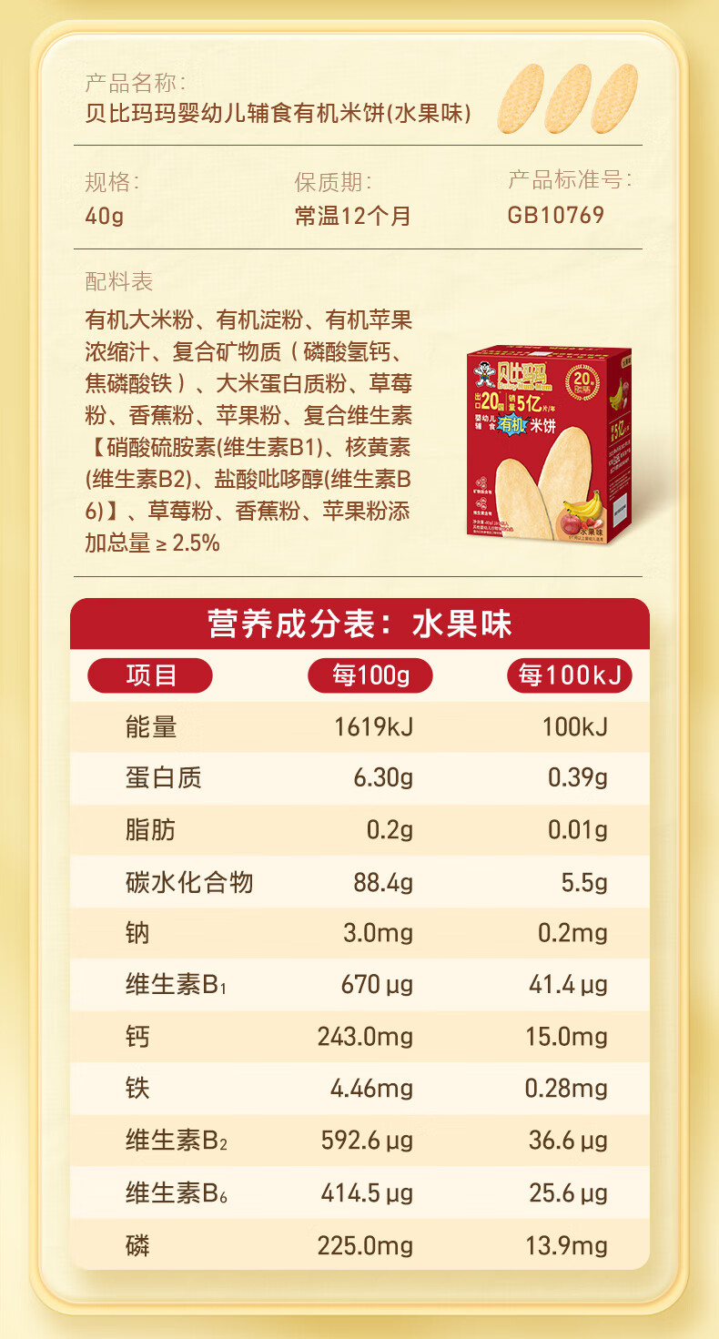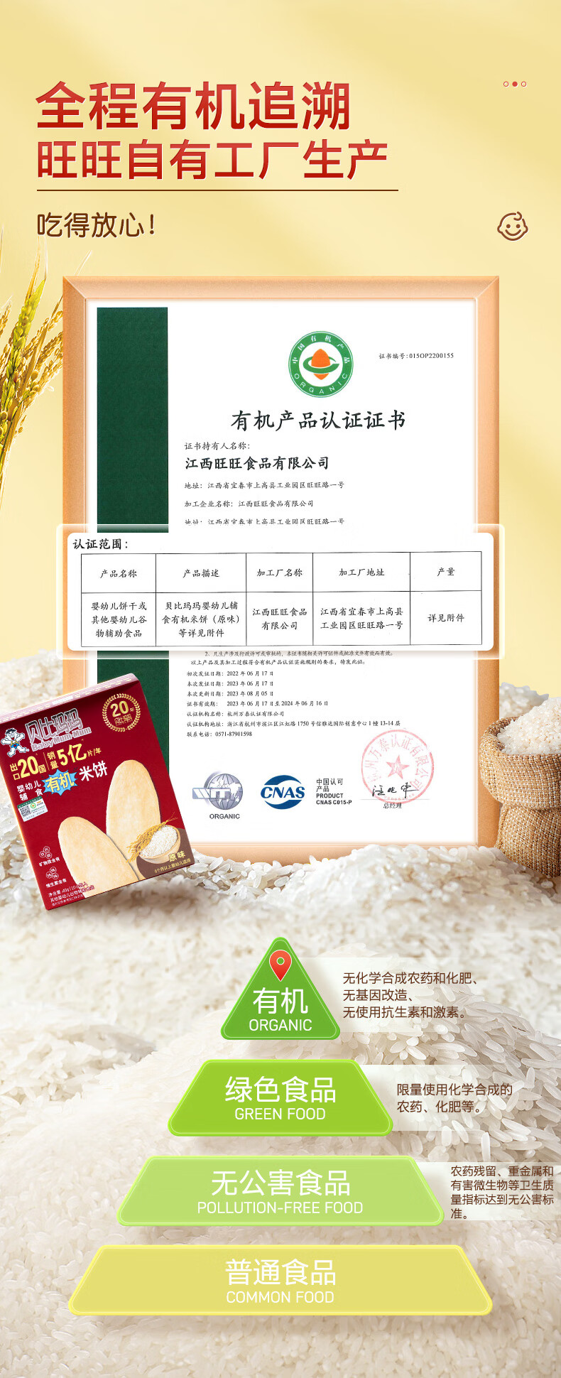 贝比玛玛旺旺婴幼儿有机米饼儿童婴儿零食宝宝磨牙棒饼干原味40g6个月以上