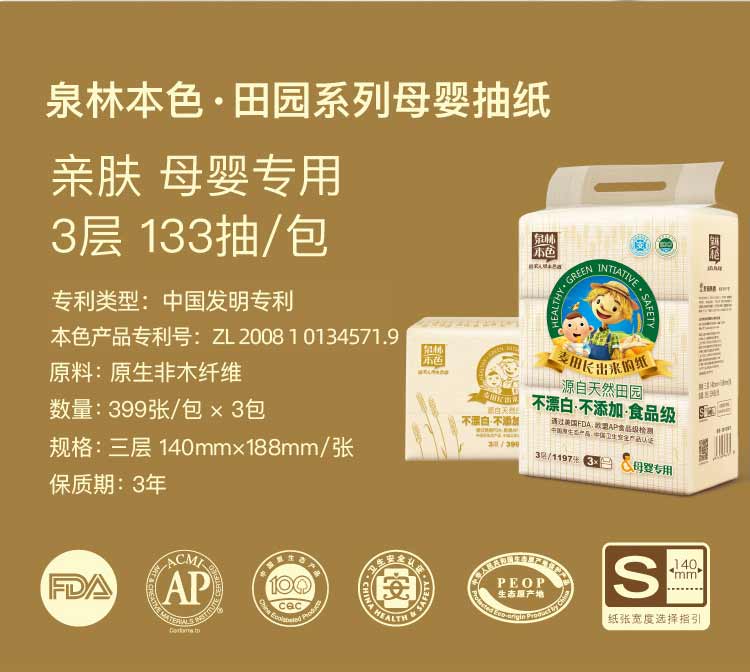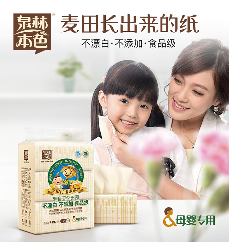 泉林本色柔韧抽纸3层133抽*3包亲肤宝宝婴儿纸巾卫生纸餐巾纸面巾纸更健康