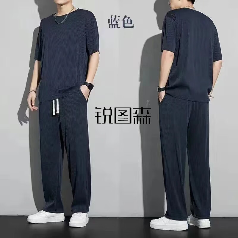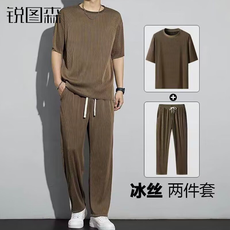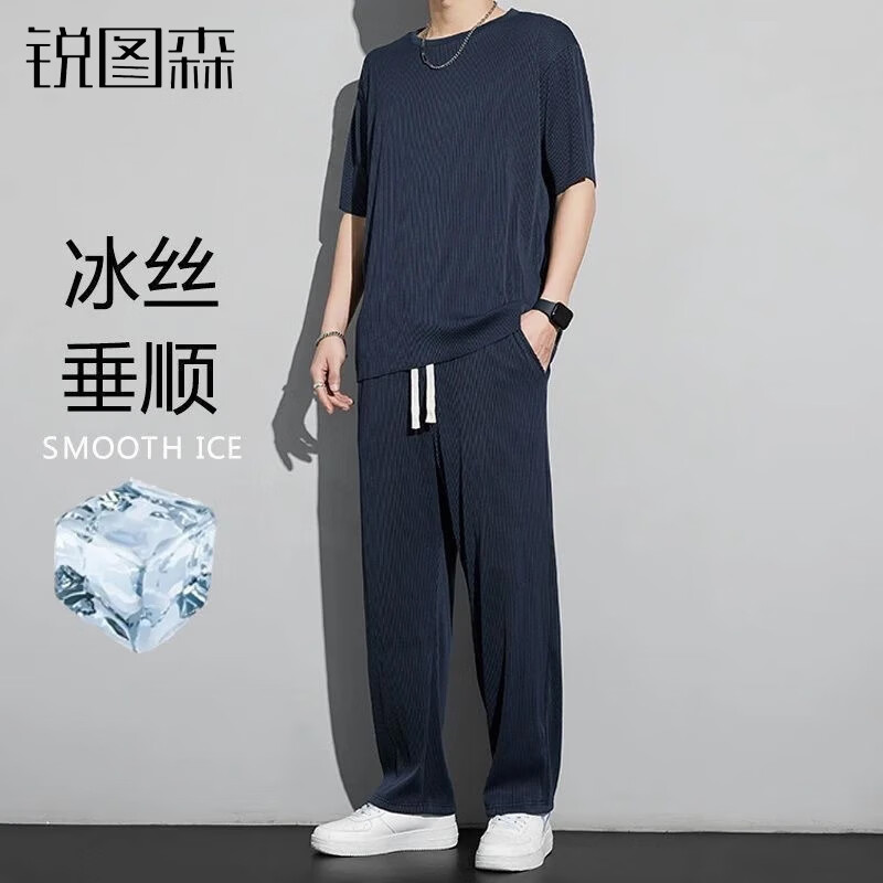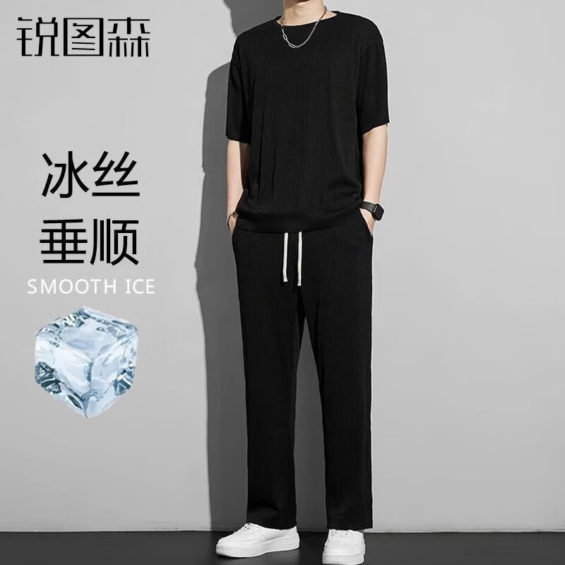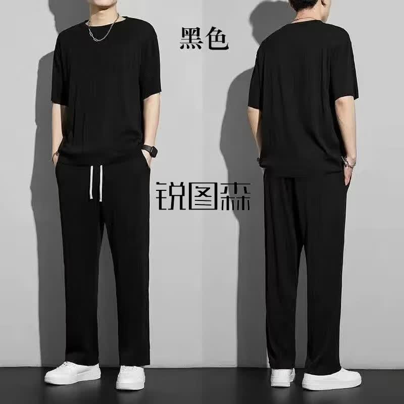 锐图森热销爆款冰丝罗纹套装夏季冰丝运动套装男垂感速干短袖长裤两件套 黑色 XL(建议110-130斤)