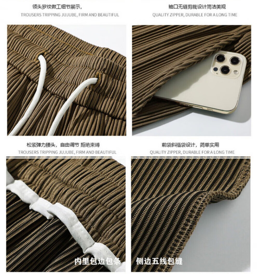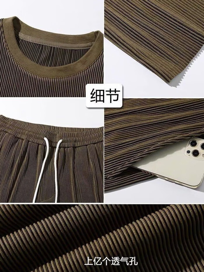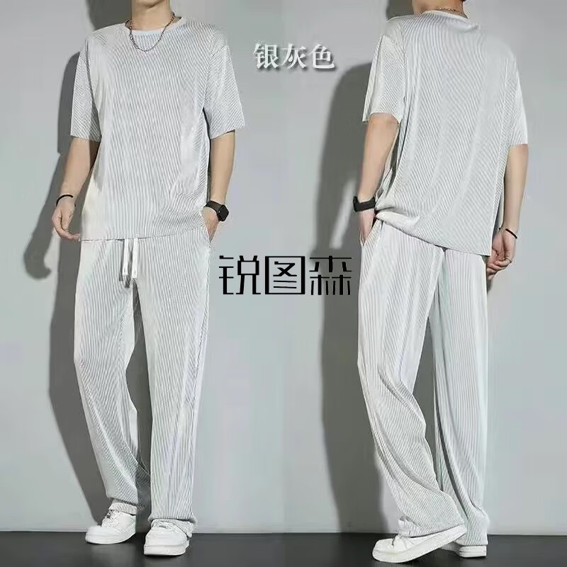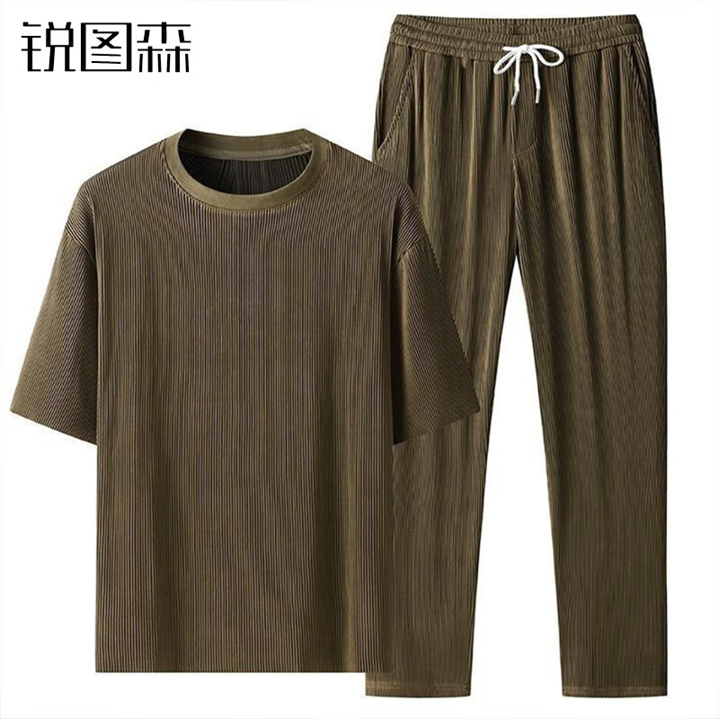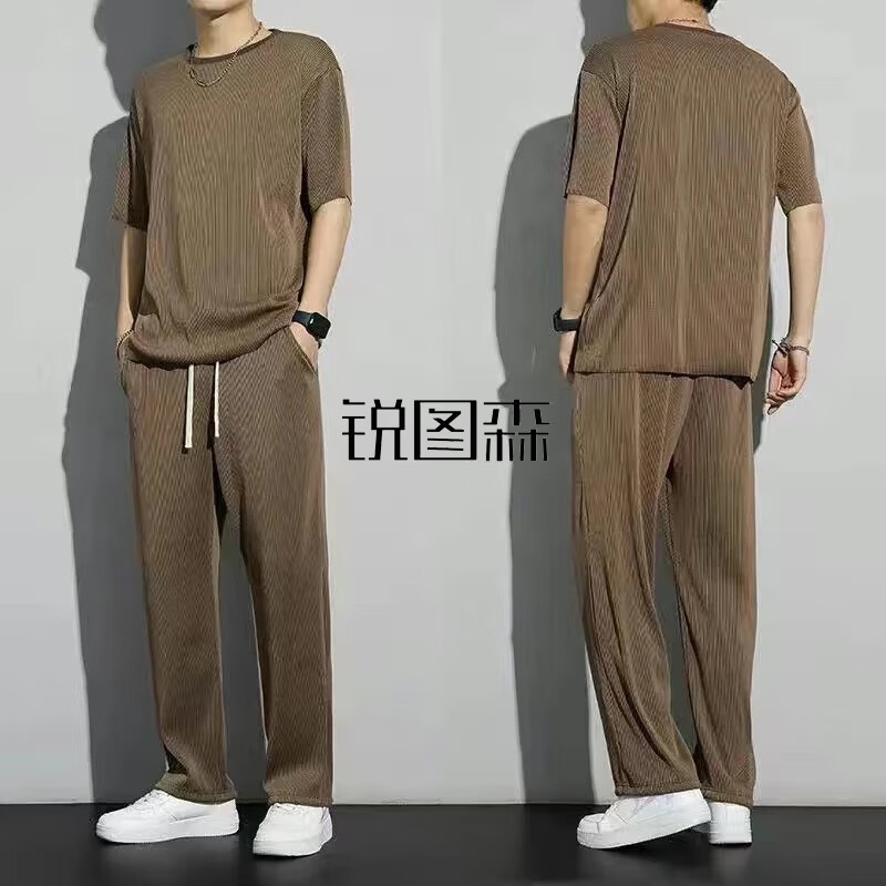 锐图森热销爆款冰丝罗纹套装夏季冰丝运动套装男垂感速干短袖长裤两件套 黑色 XL(建议110-130斤)
