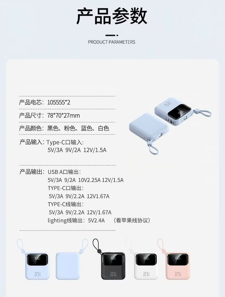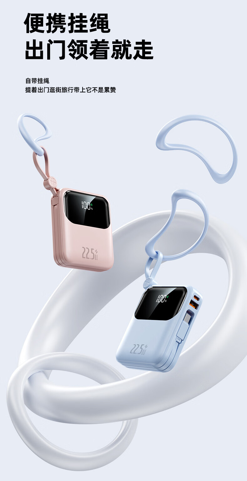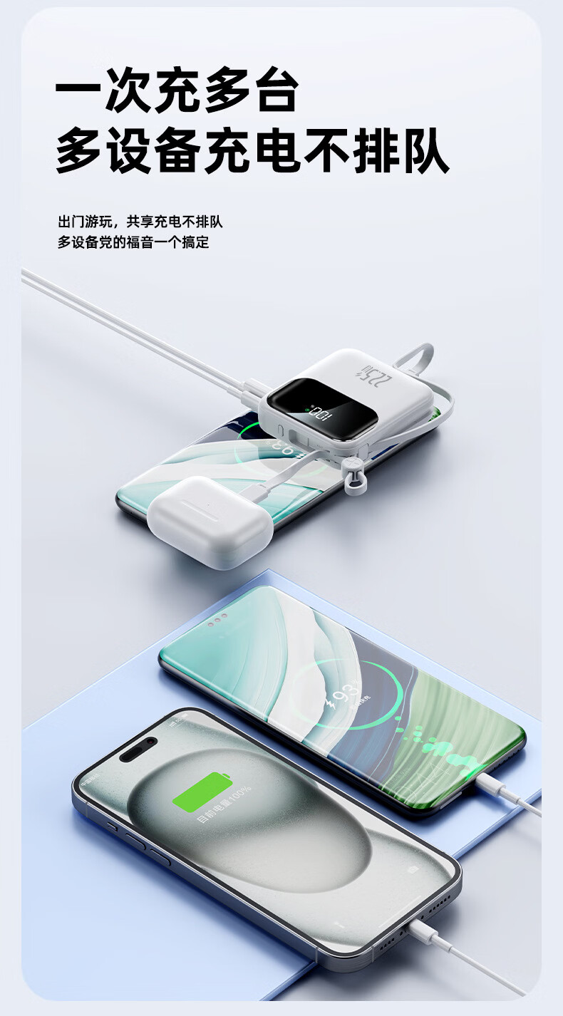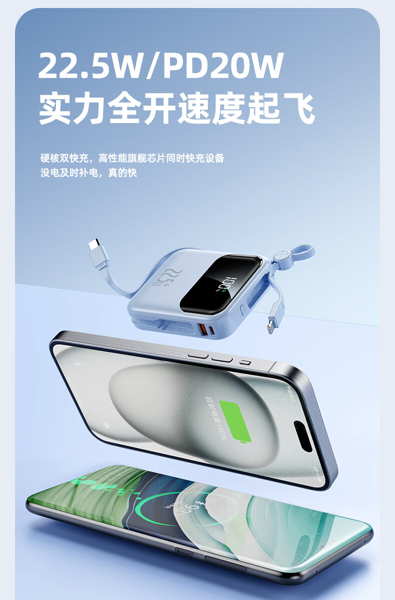 柯训3C认证22.5W快充10000毫安便携充电宝自带线移动电源定 制log 白色 10000mAH【足容】