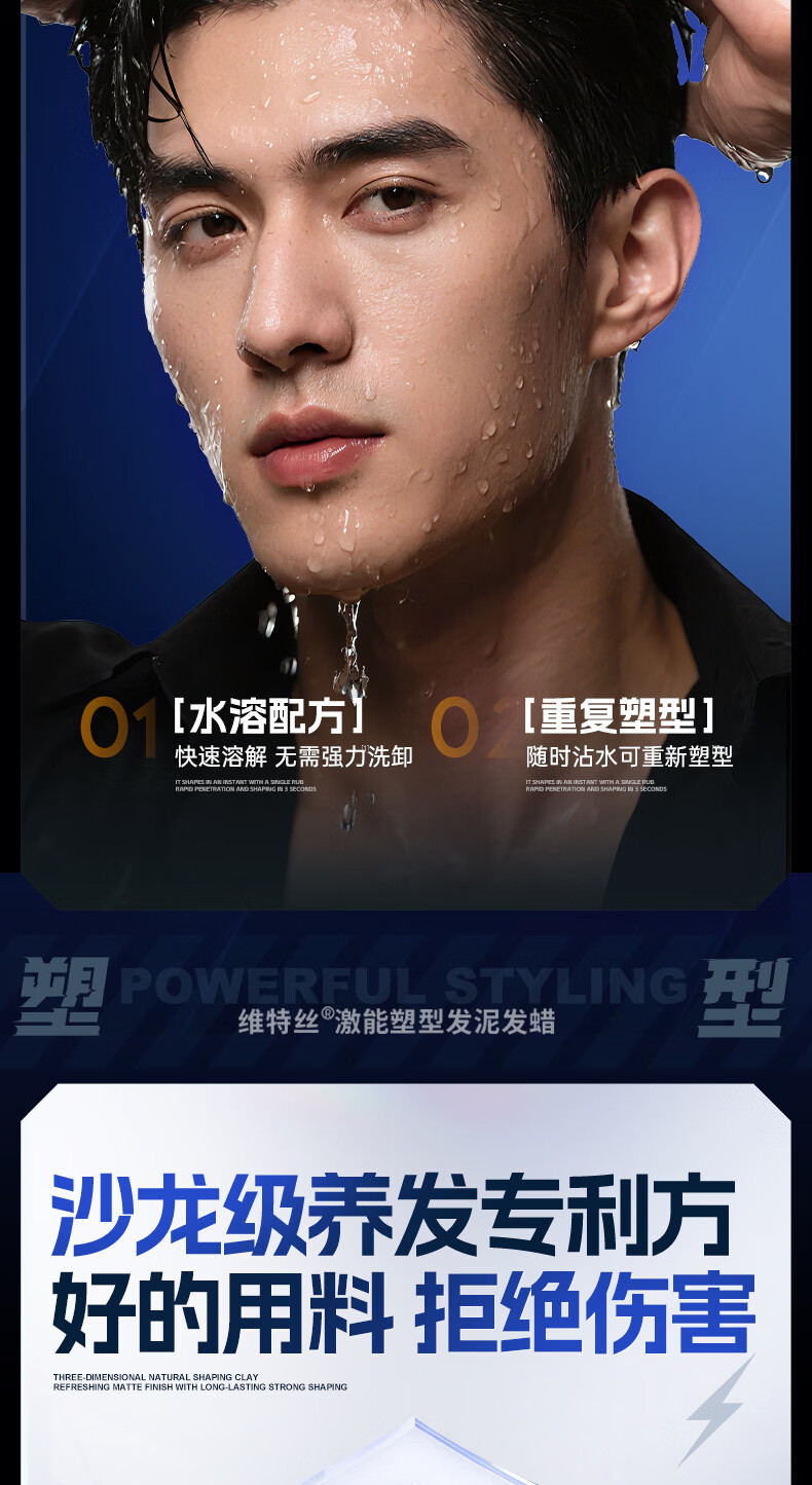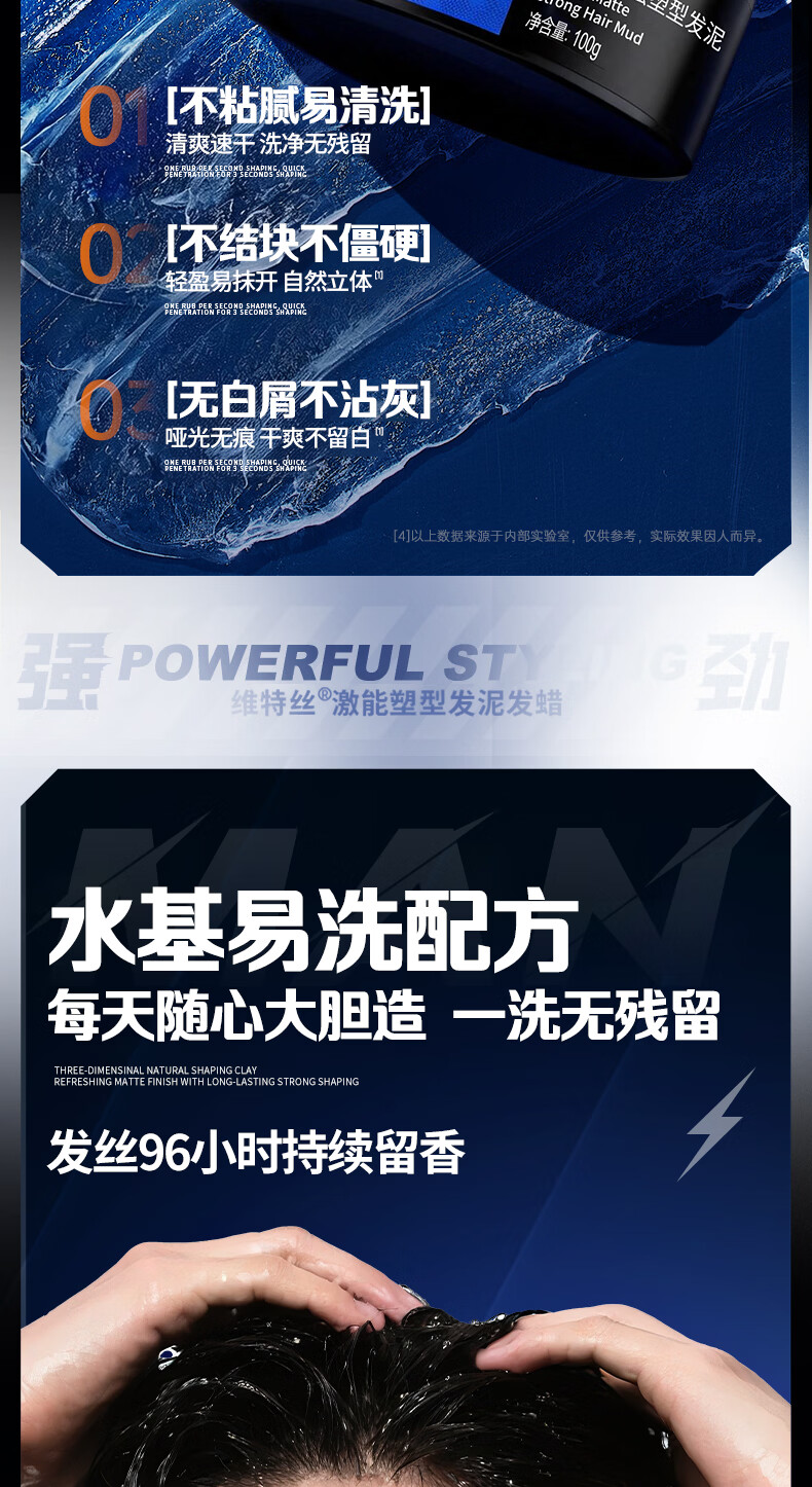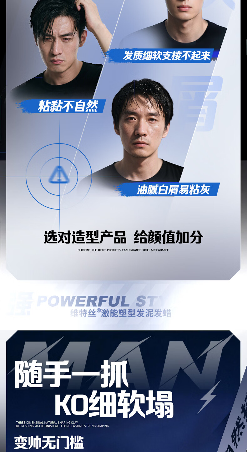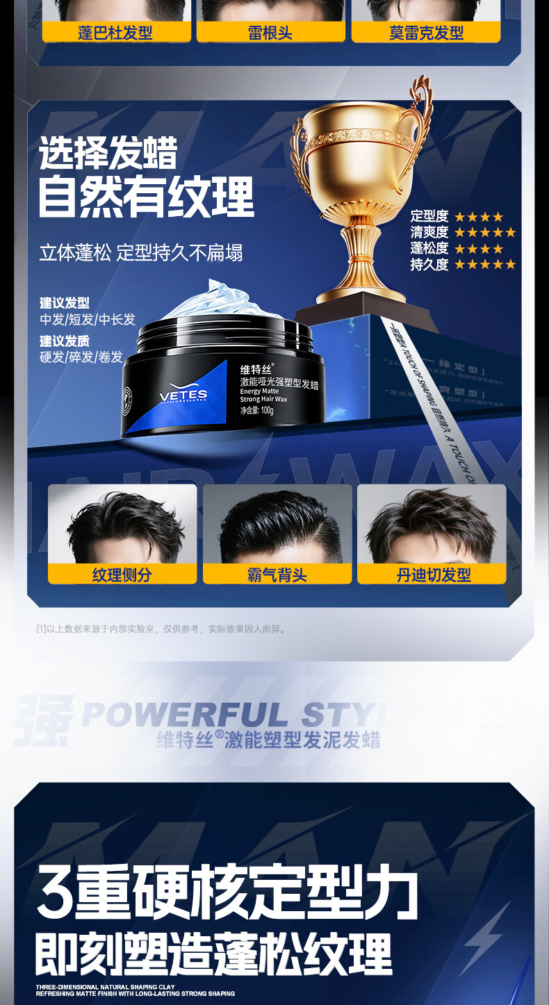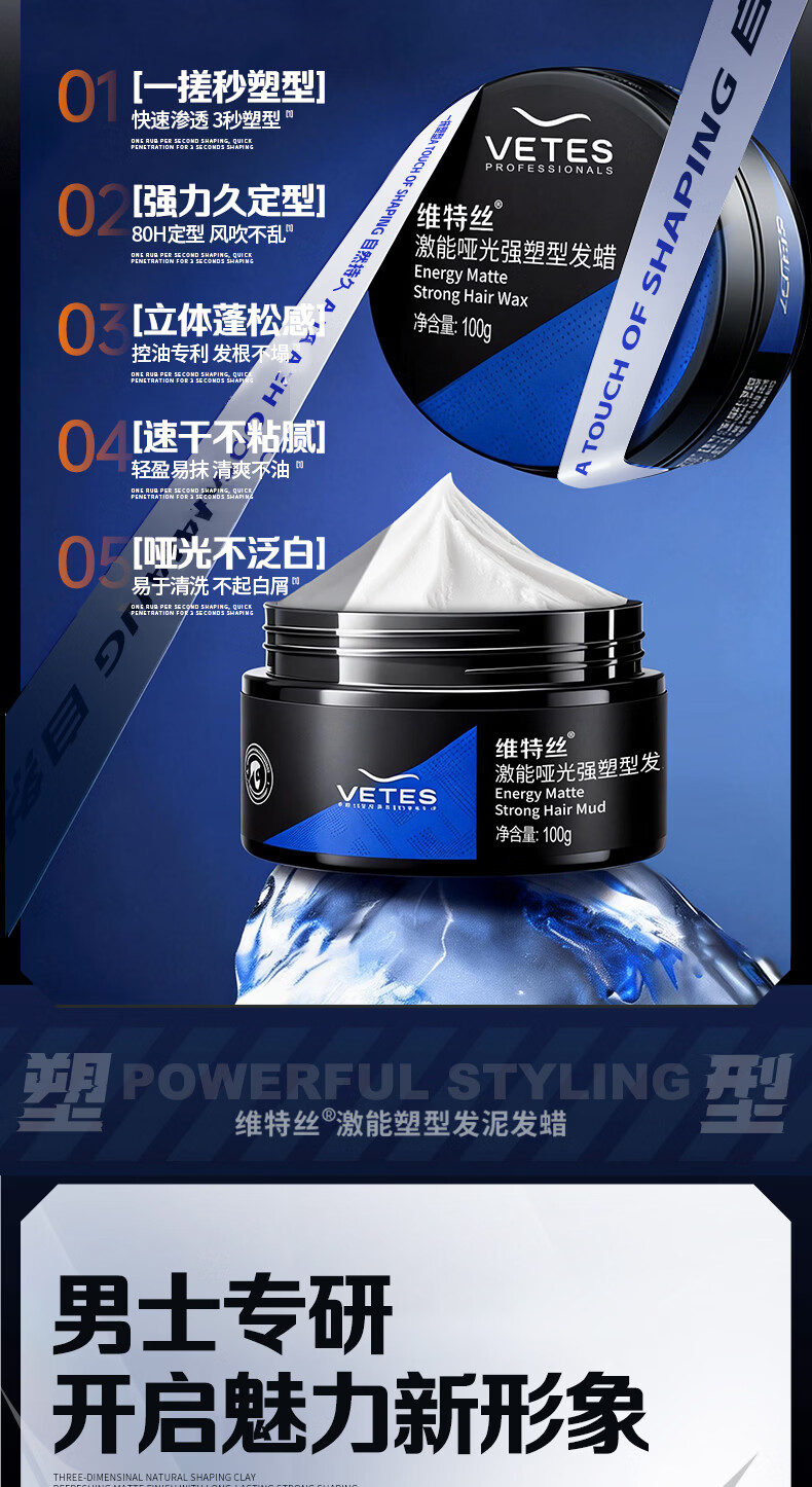 维特丝男士哑光强力塑型发泥自然蓬松持久定型发蜡发胶发膏发油清爽造型