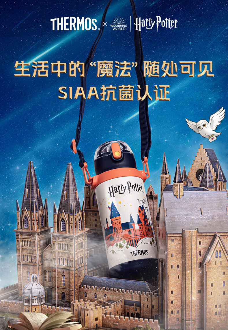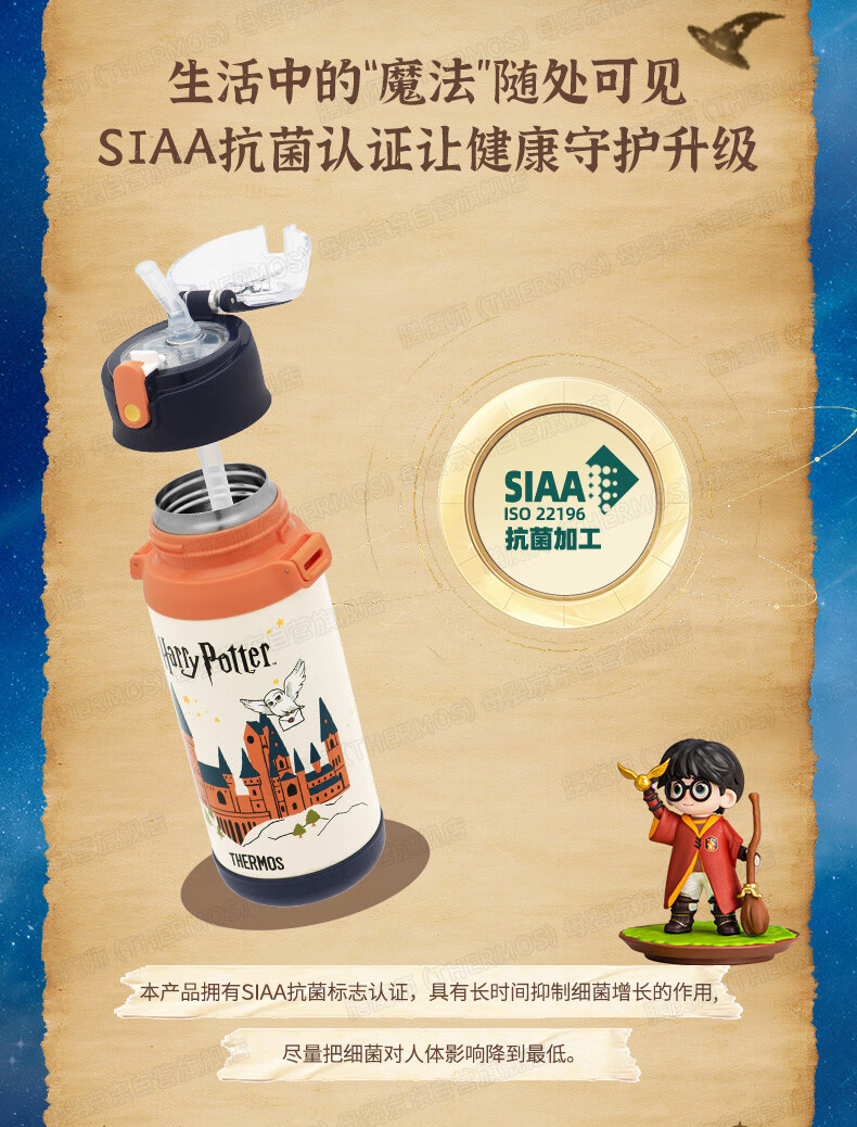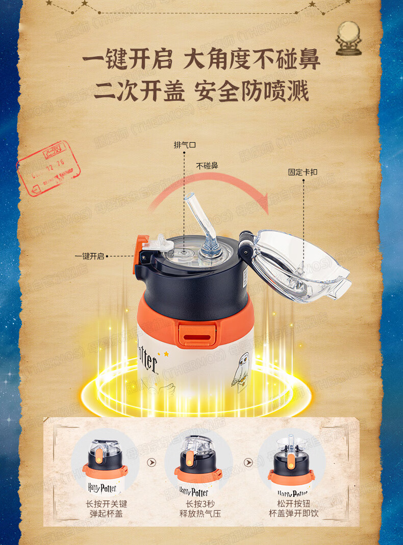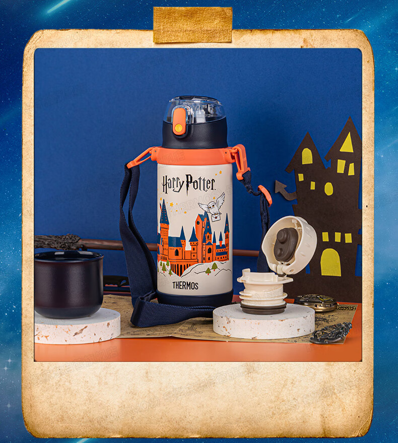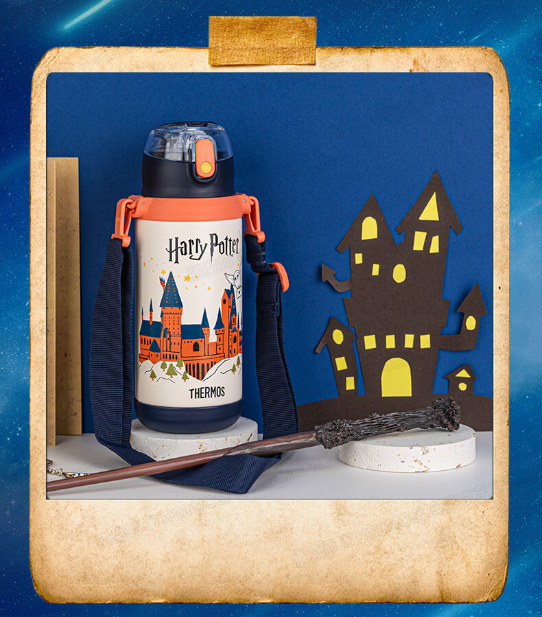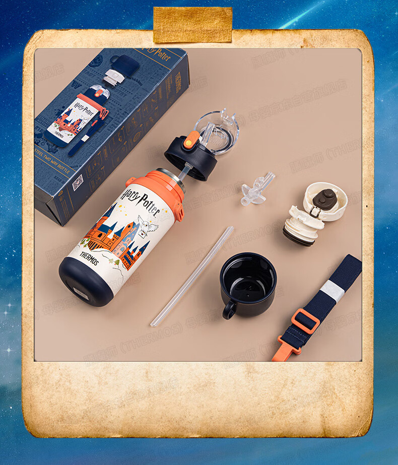 膳魔师儿童316L保温杯吸管水杯学生开学必备水壶哈利波特男600ml橙黑
