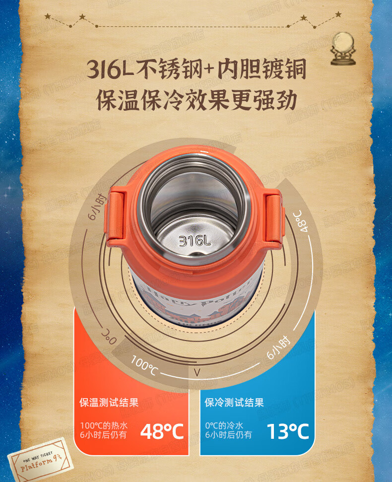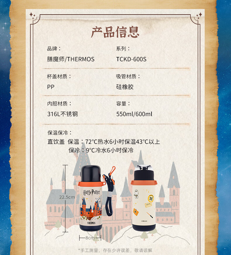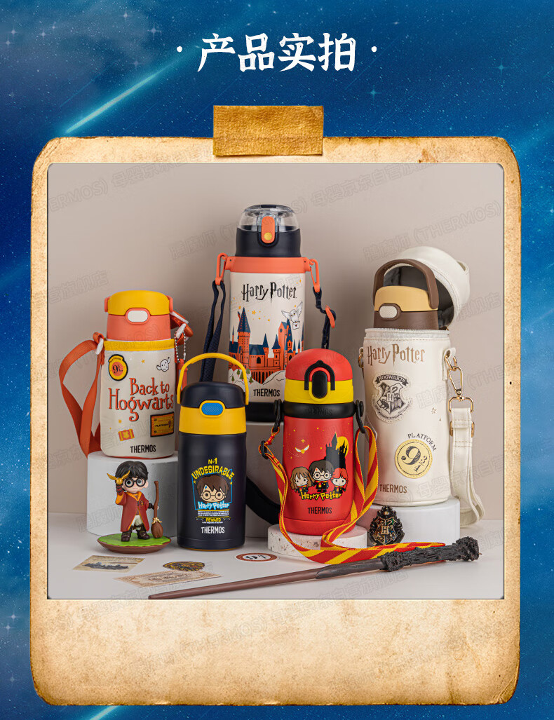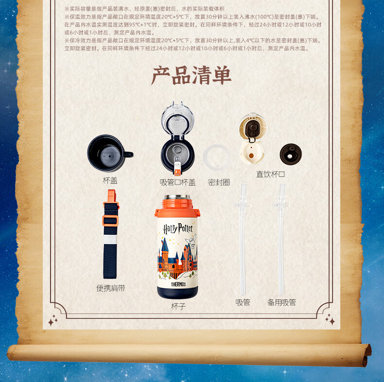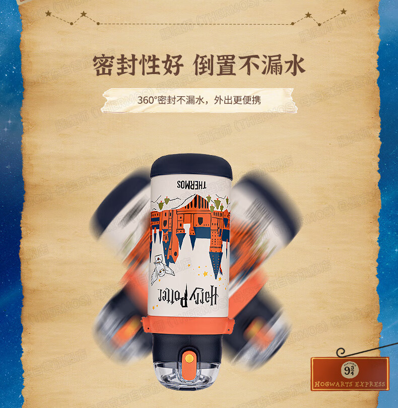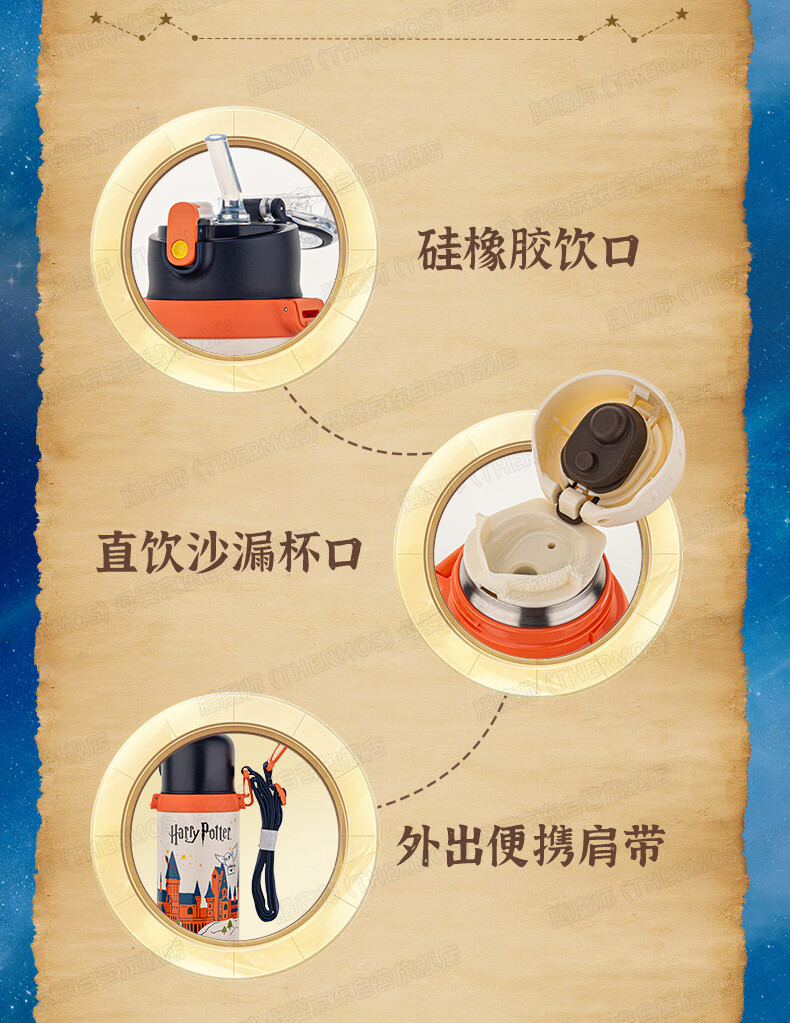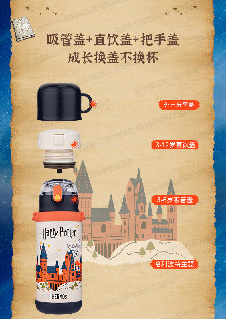 膳魔师儿童316L保温杯吸管水杯学生开学必备水壶哈利波特男600ml橙黑