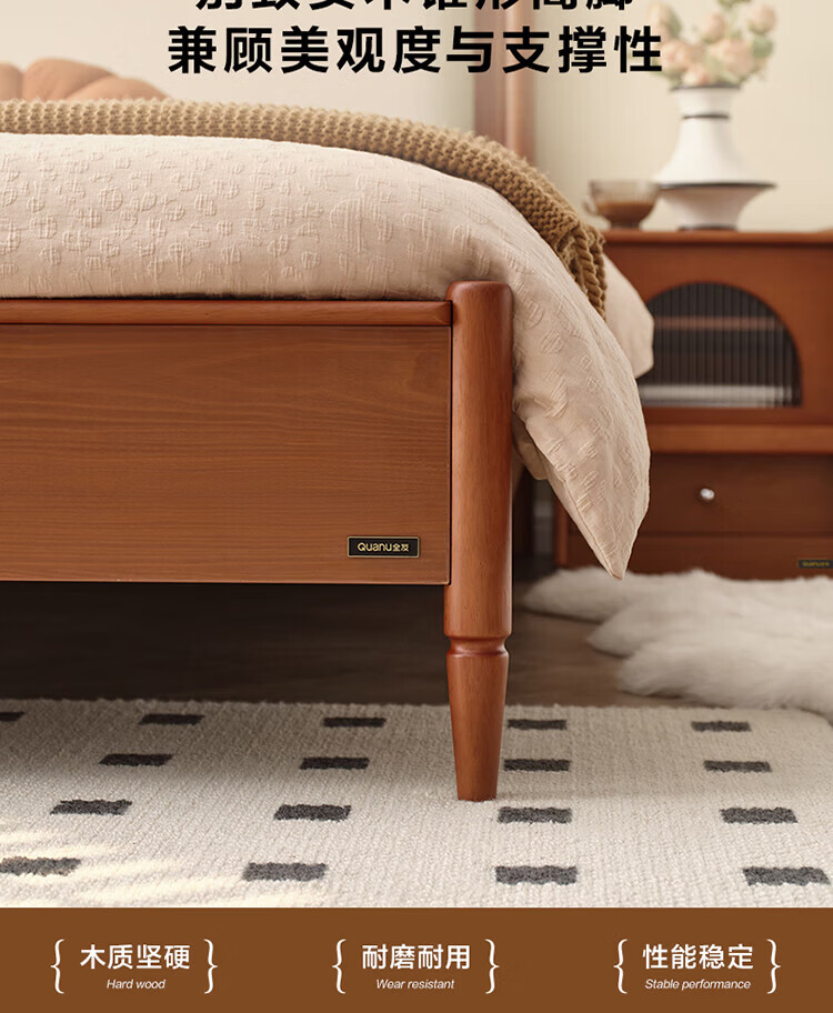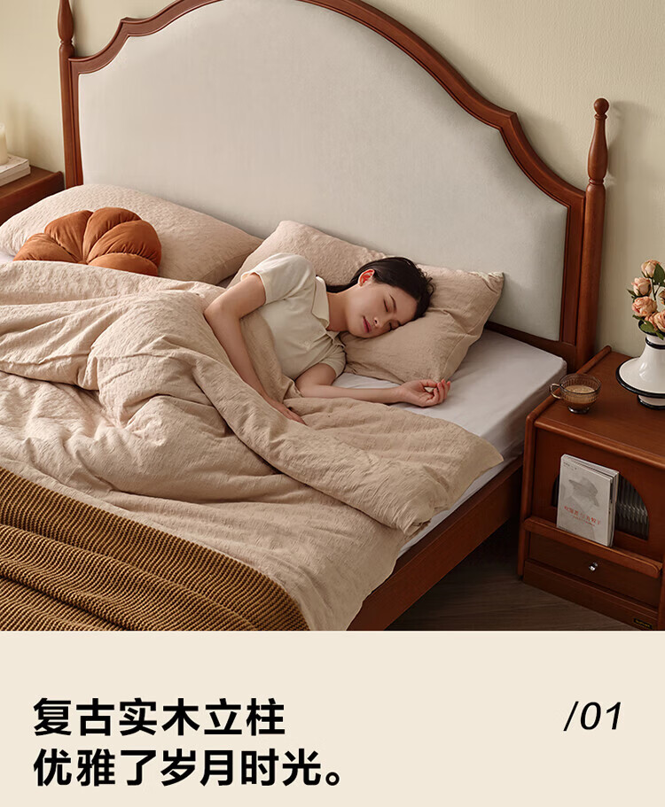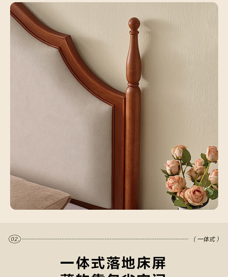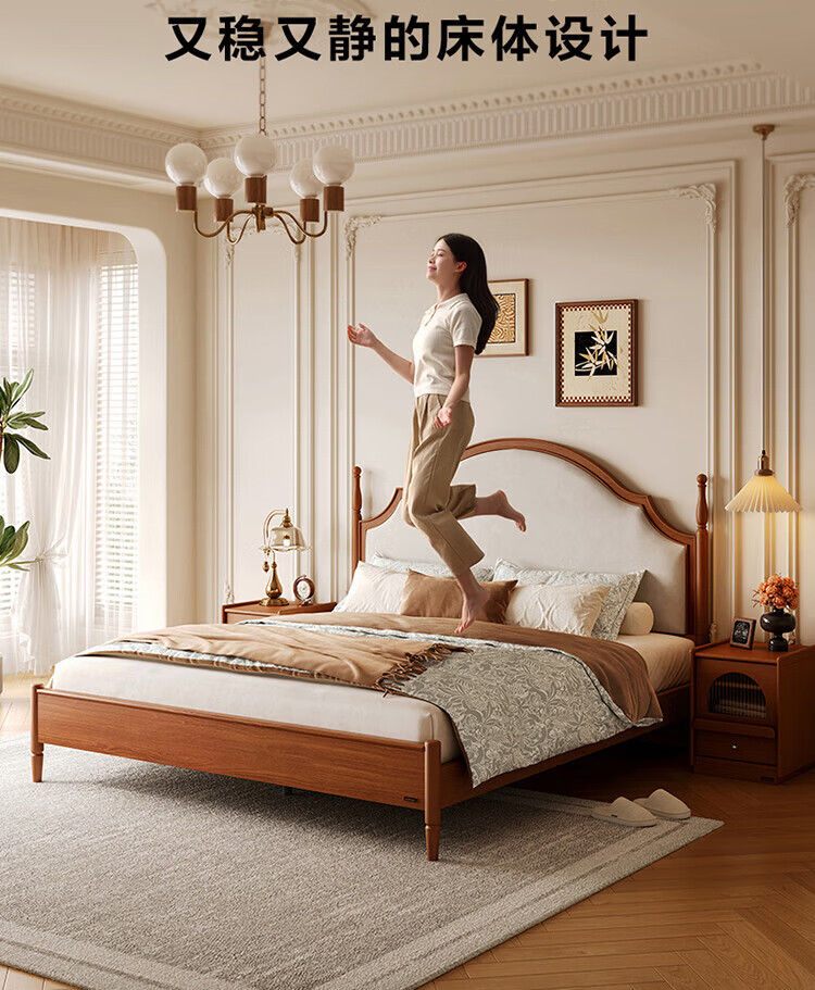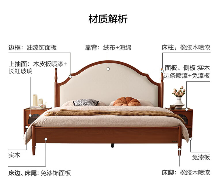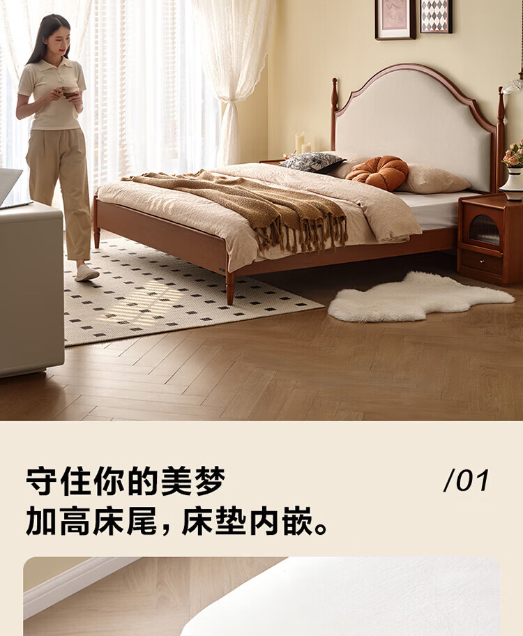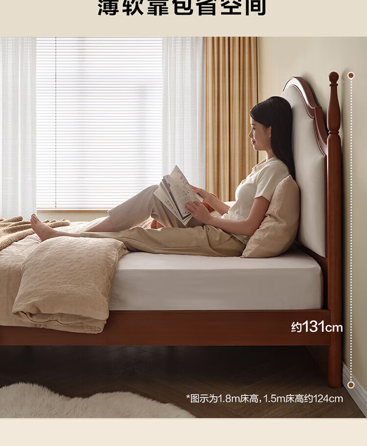 全友家居波尔多皮艺软包高脚床复古法式奶油风主卧1.8米x2米双人大床 复古棕|床头柜*1 1.8米