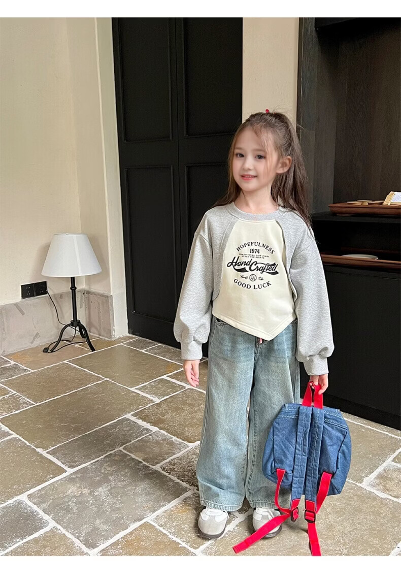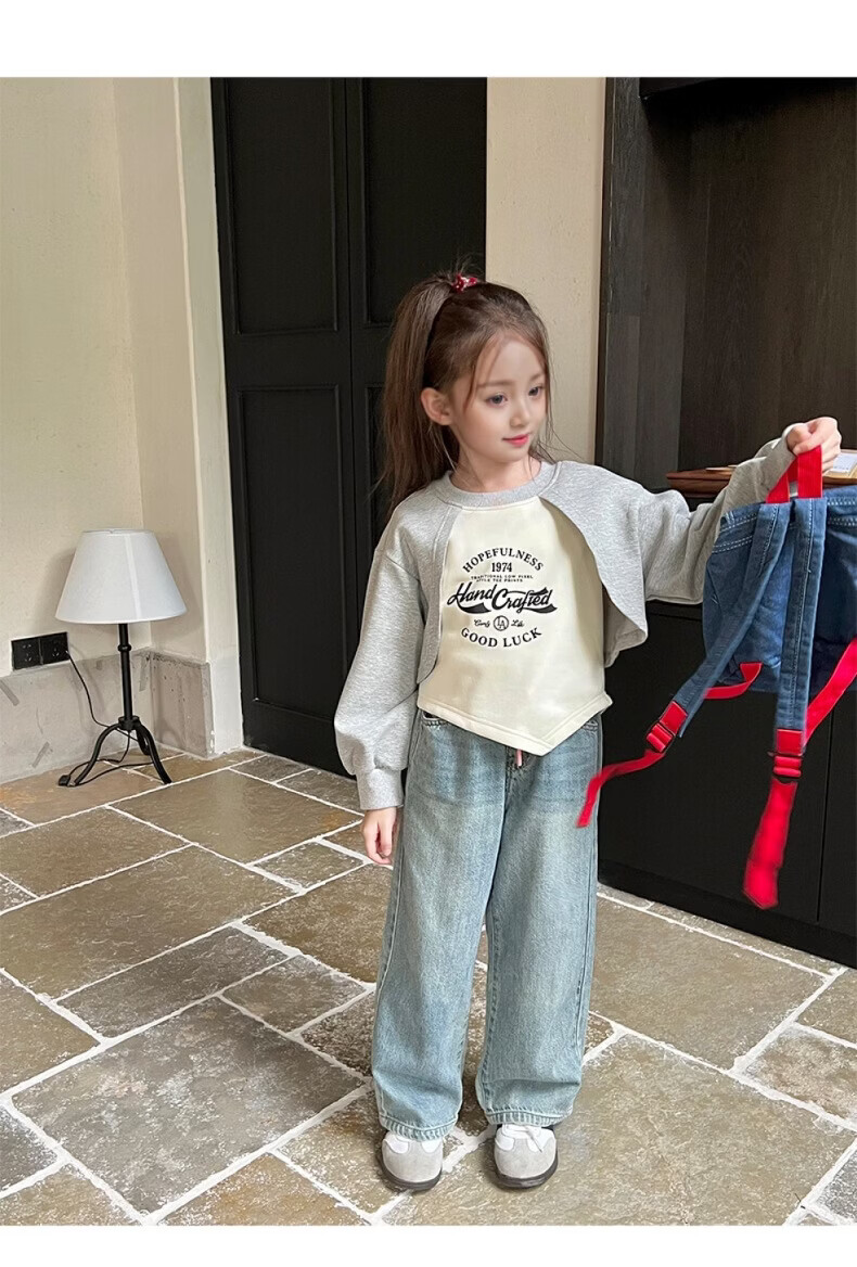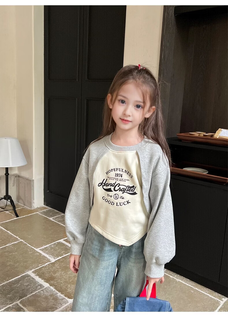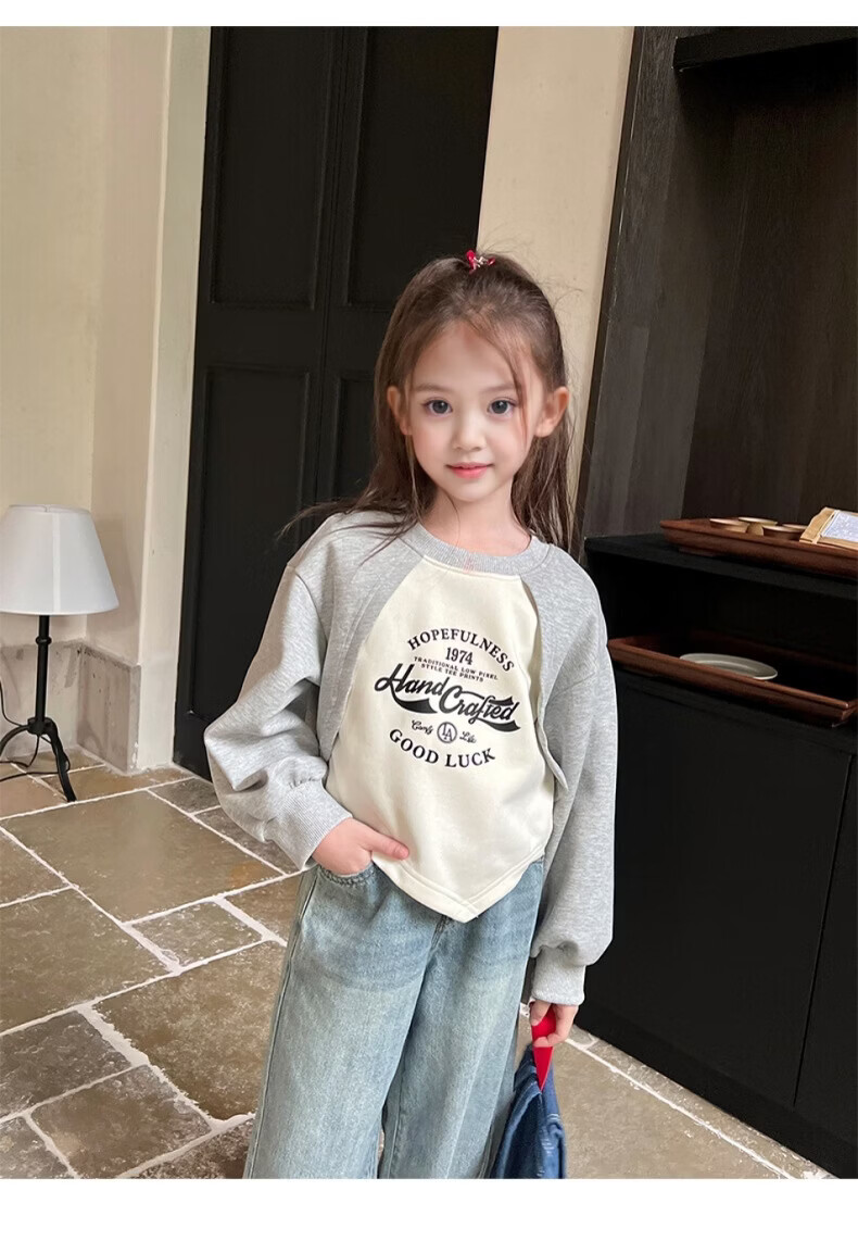 小猪班纳(PEPCO)女童宽松假两件卫衣春秋新款儿童宝宝长袖印花复古外穿上衣潮 花灰/米白 90 *建议身高80-90cm