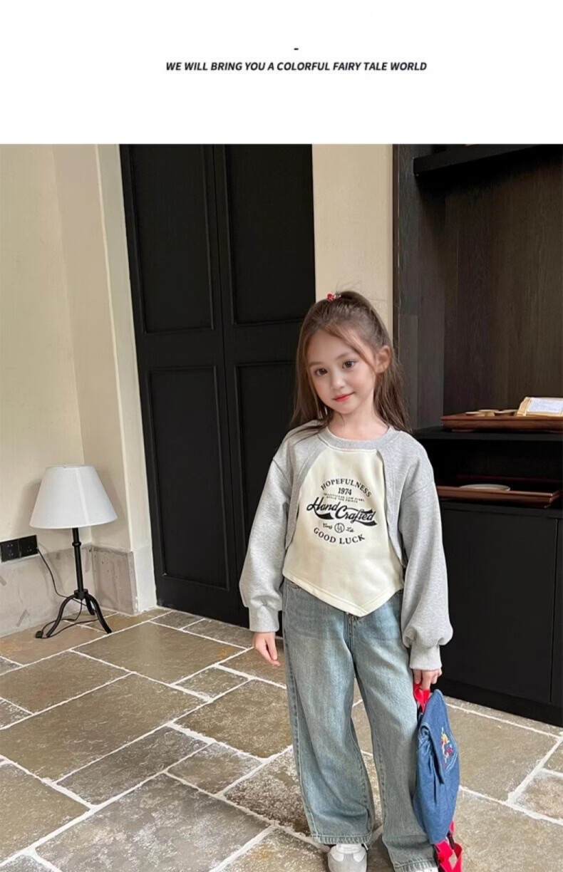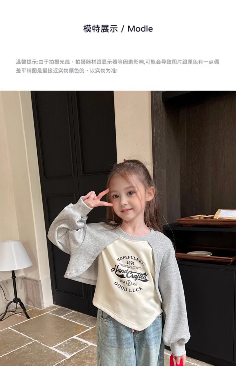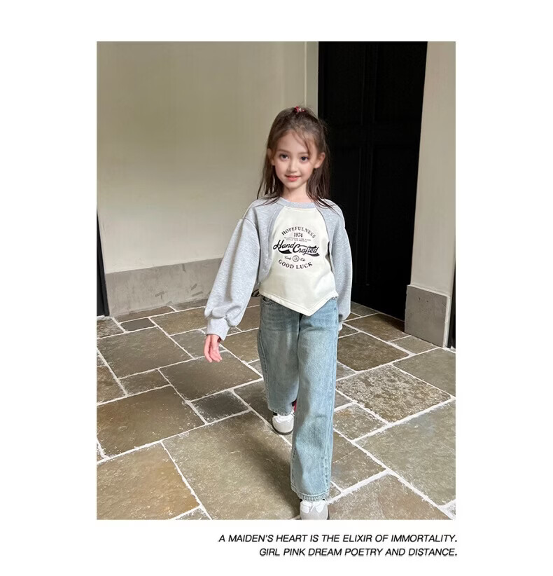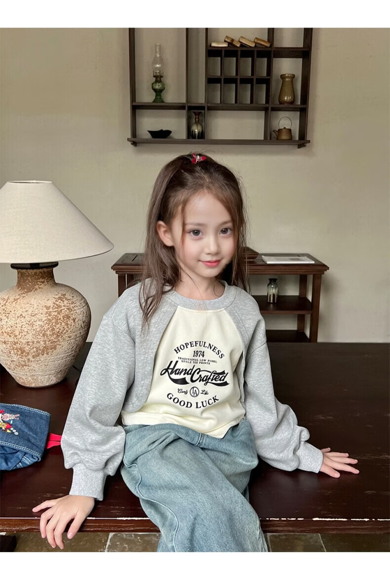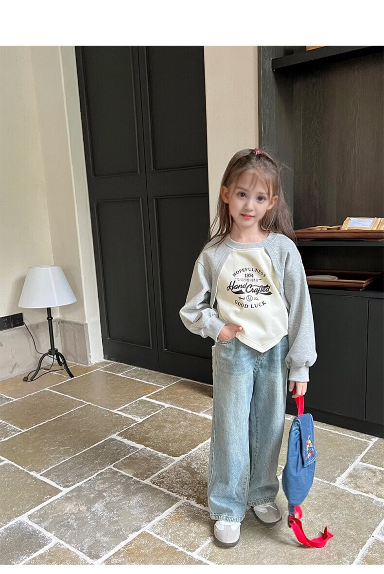 小猪班纳(PEPCO)女童宽松假两件卫衣春秋新款儿童宝宝长袖印花复古外穿上衣潮 花灰/米白 90 *建议身高80-90cm