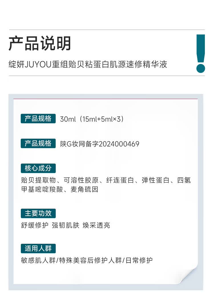屈臣氏绽妍JUYOU重组贻贝粘蛋白肌源速修精华液30ml(15ml+5mlx3) 精华液30ml(15ml+5mlx3)