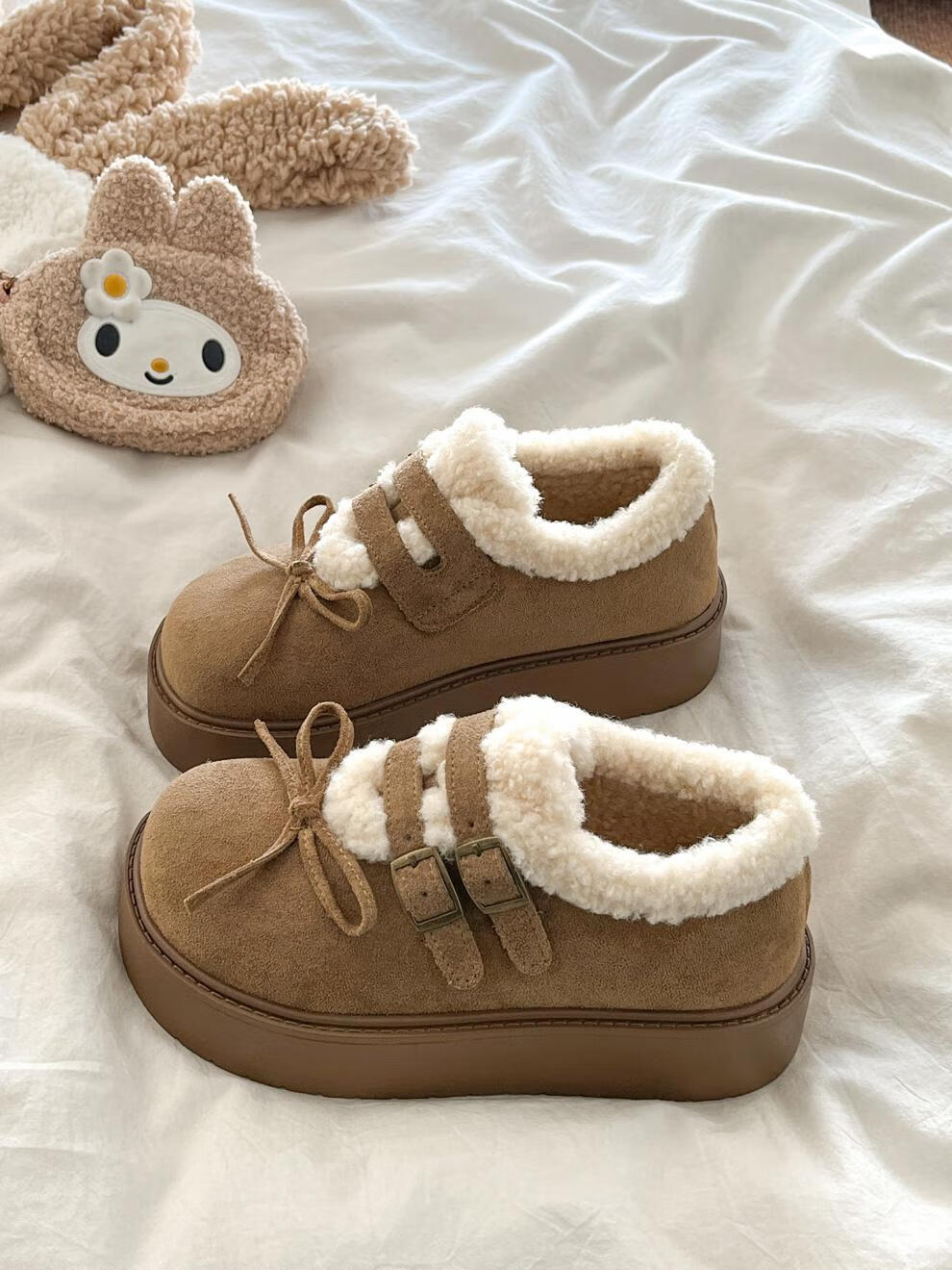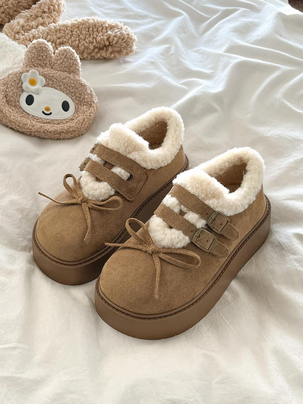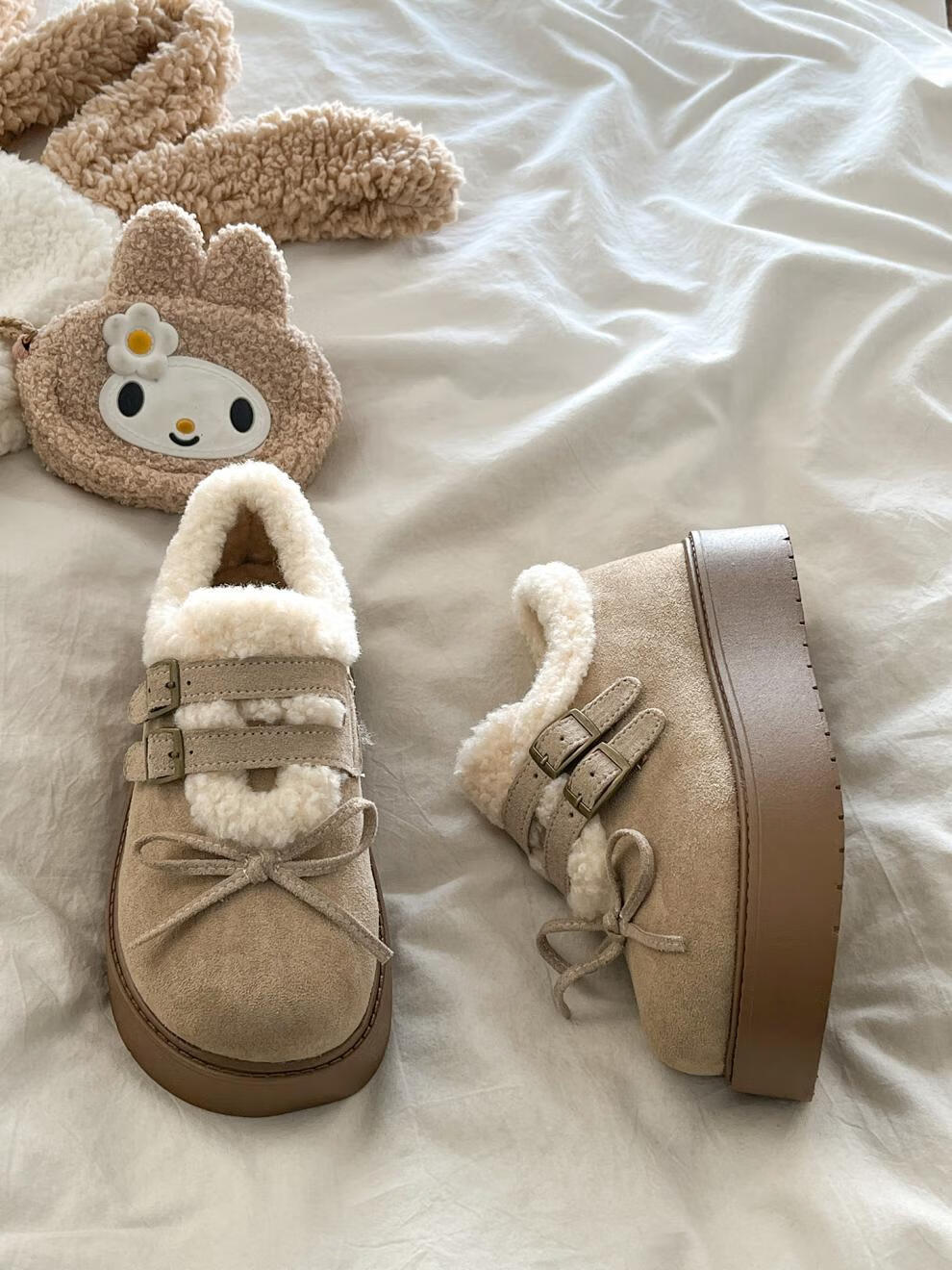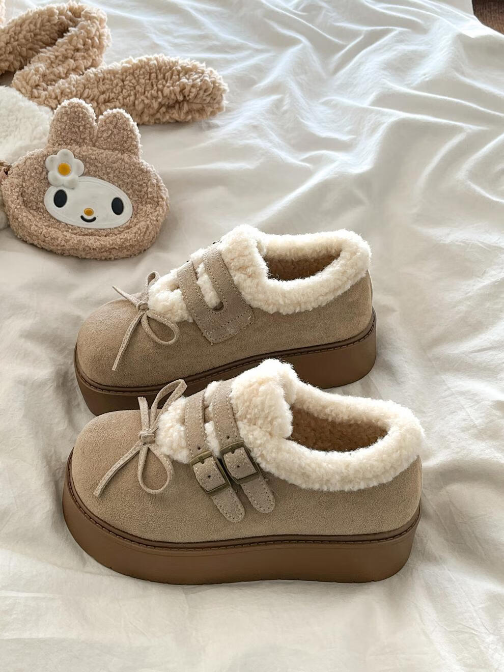 稻草人(MEXICAN)厚底加绒保暖全包勃肯鞋女2026冬季新款低帮棉鞋毛毛乐福鞋雪地靴 米色【升级版】 35