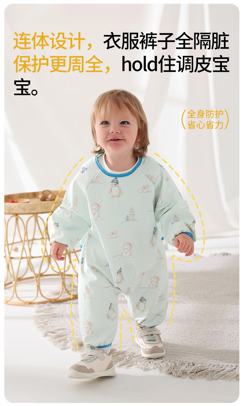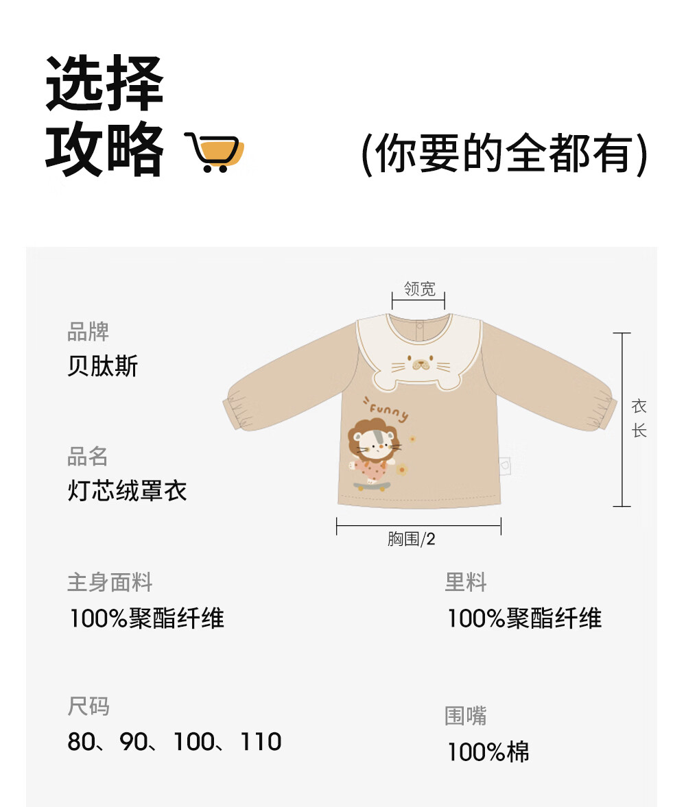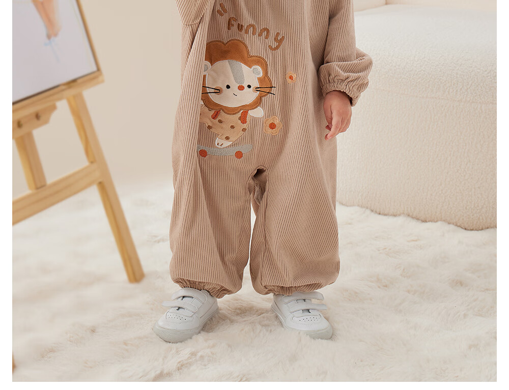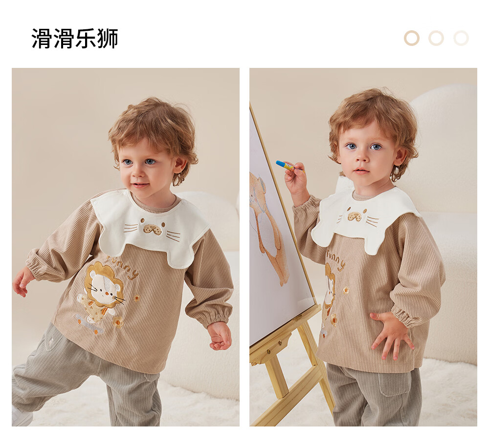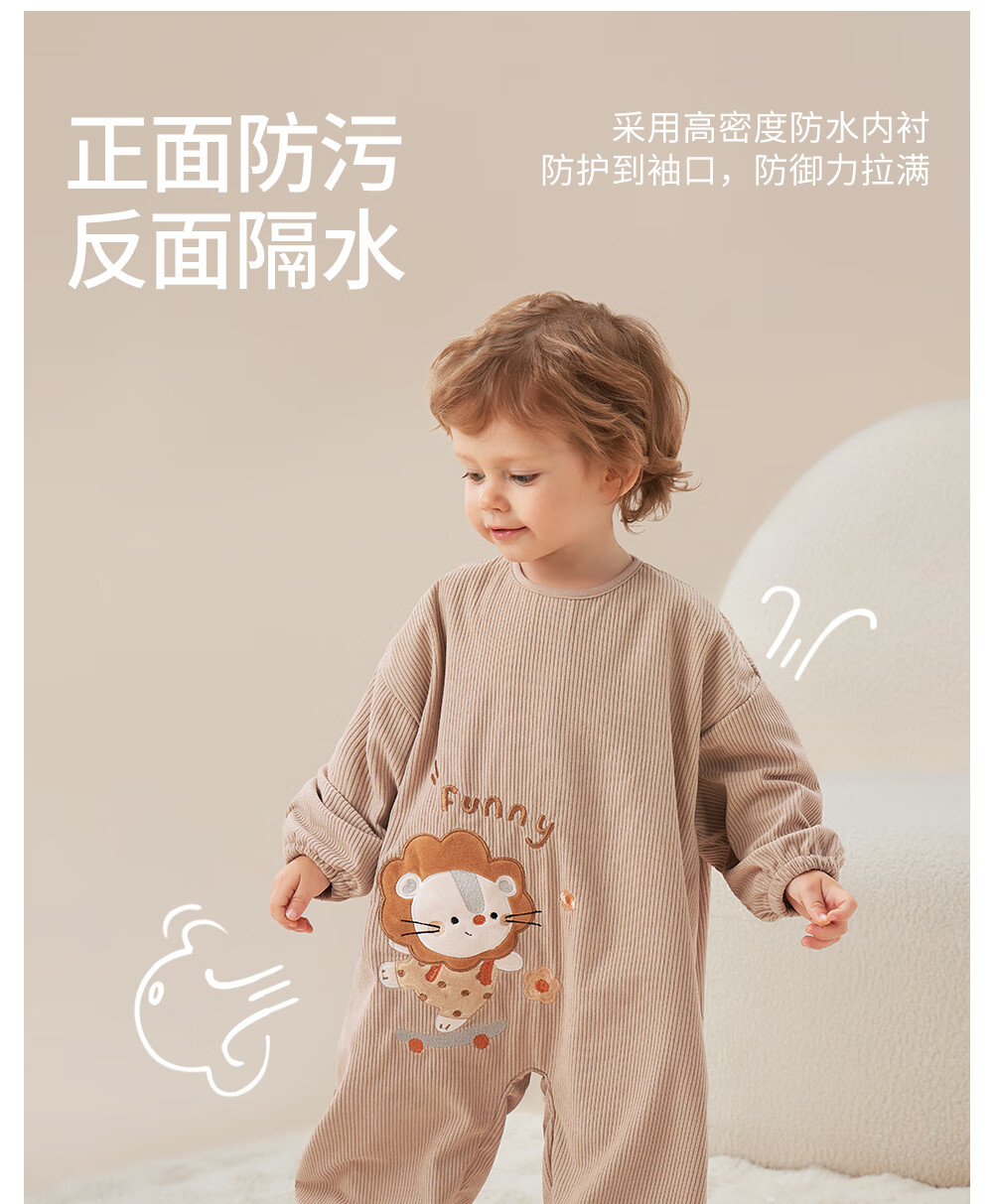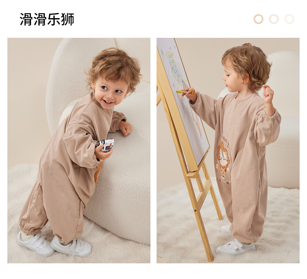 贝肽斯宝宝连体罩衣户外婴儿爬行防水脏爬爬服外穿儿童吃饭围兜辅食神器 滑滑乐狮【灯芯绒保暖御寒】 90码 1.5岁-2.5岁 适合85cm-93cm