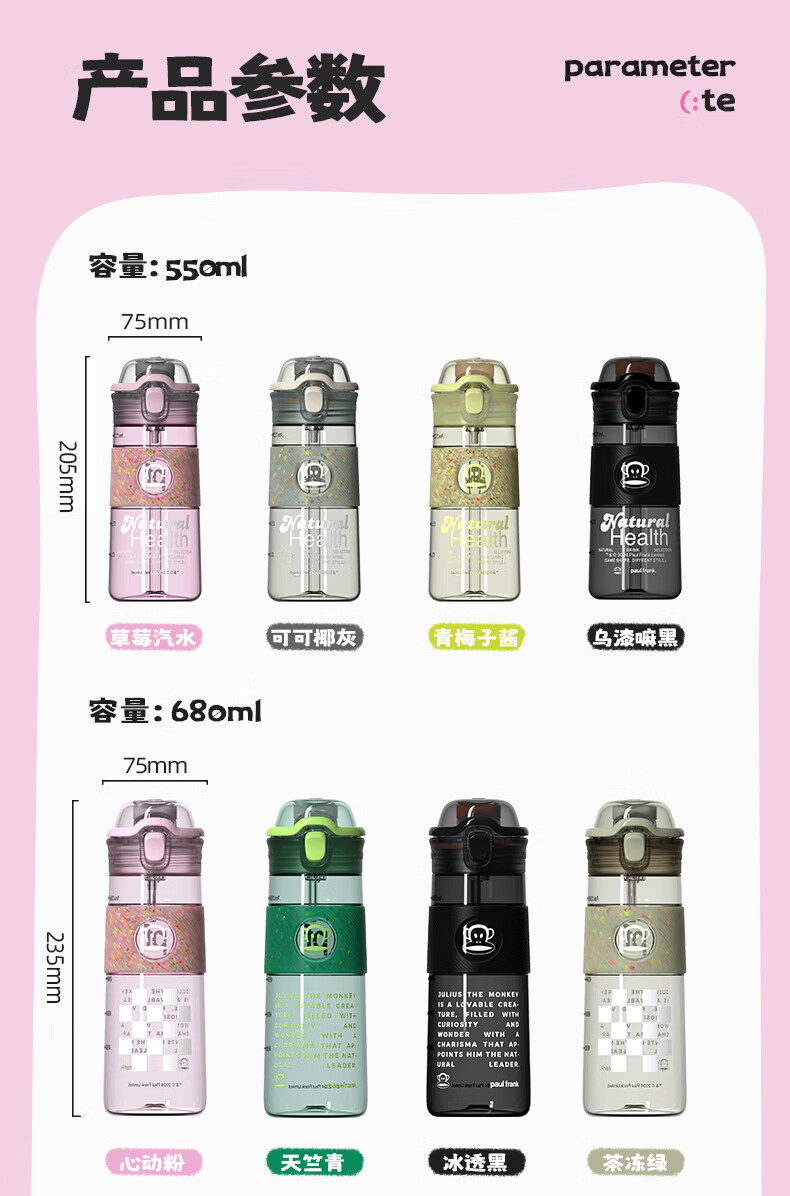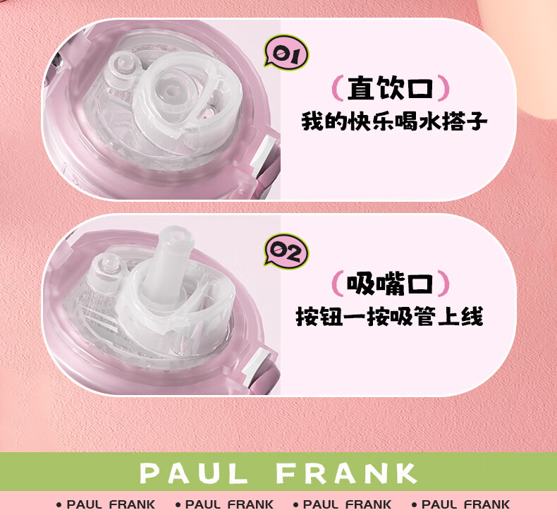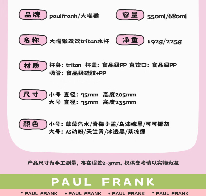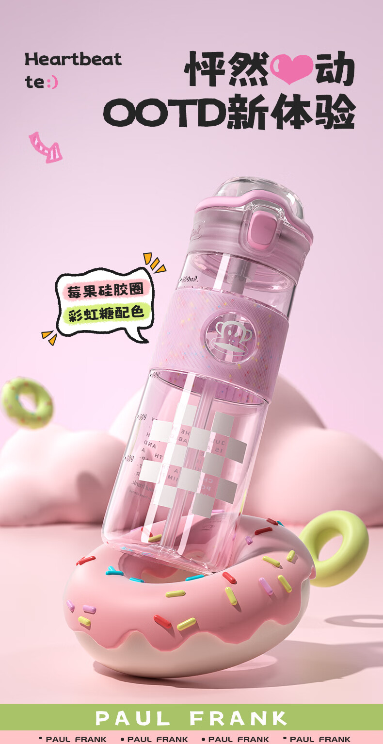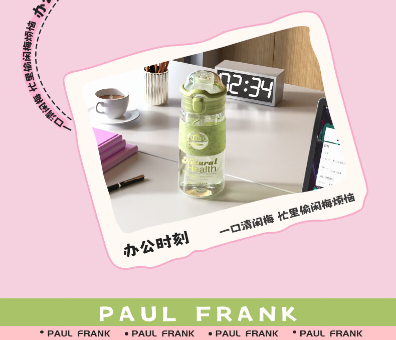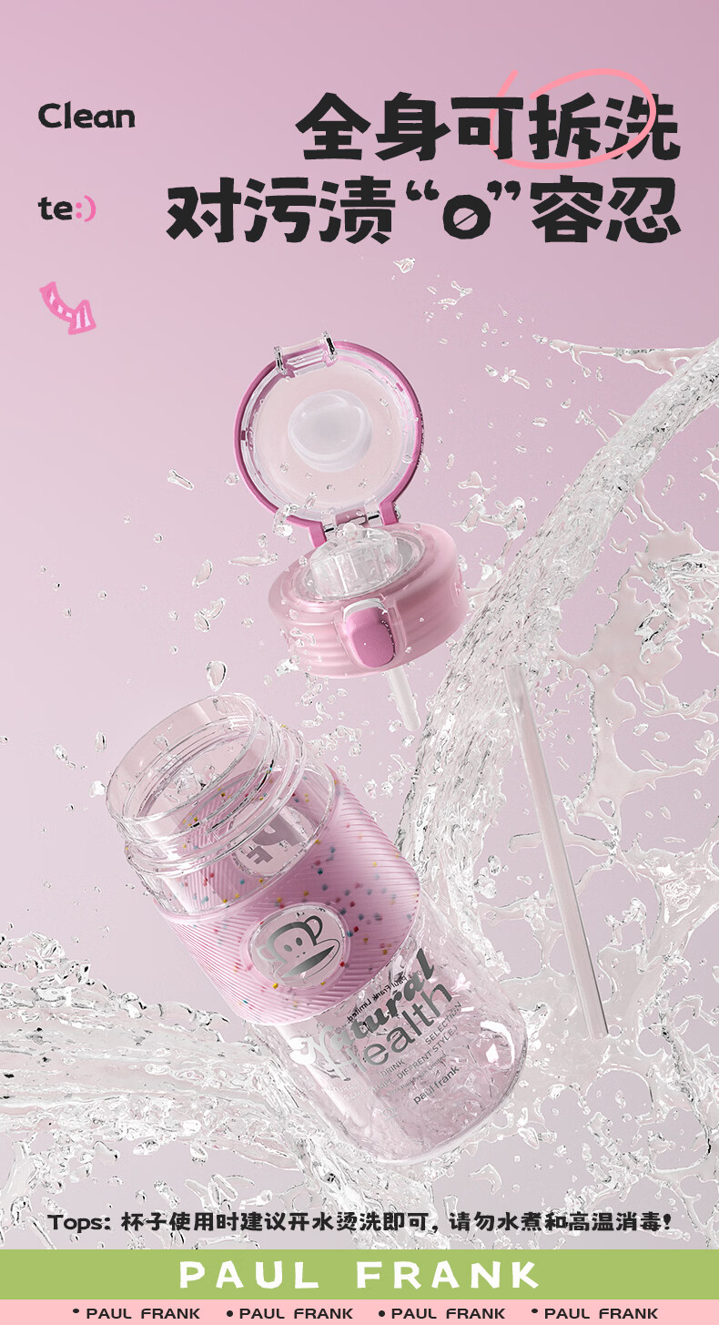 大嘴猴(paul frank)Tritan塑料杯男女生运动水杯大容量学生杯子耐热耐冷高颜值双饮杯 可可椰灰550ml