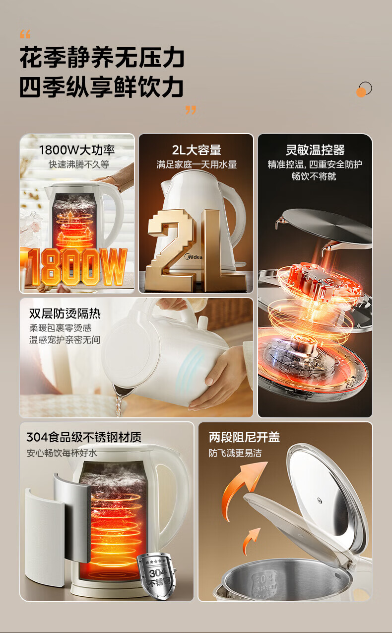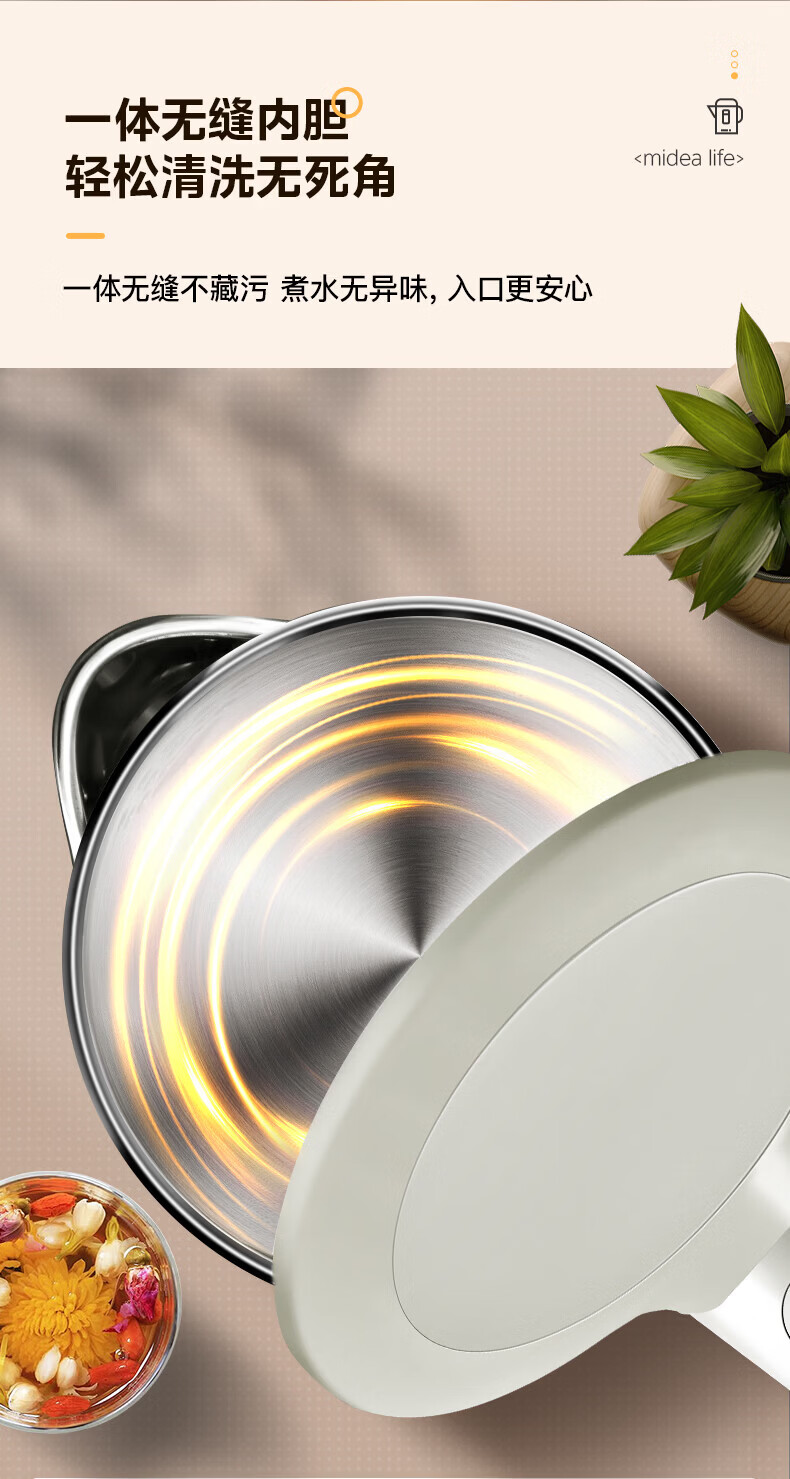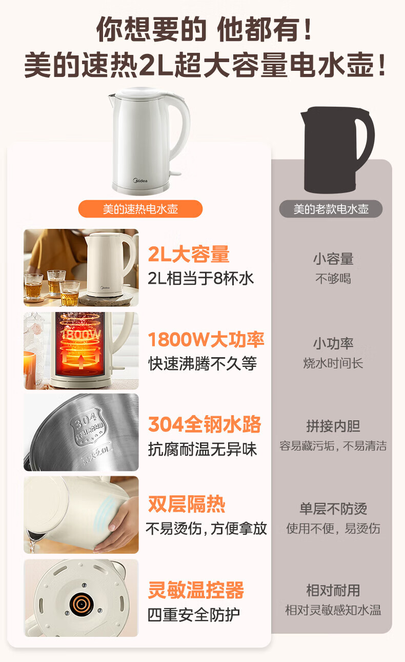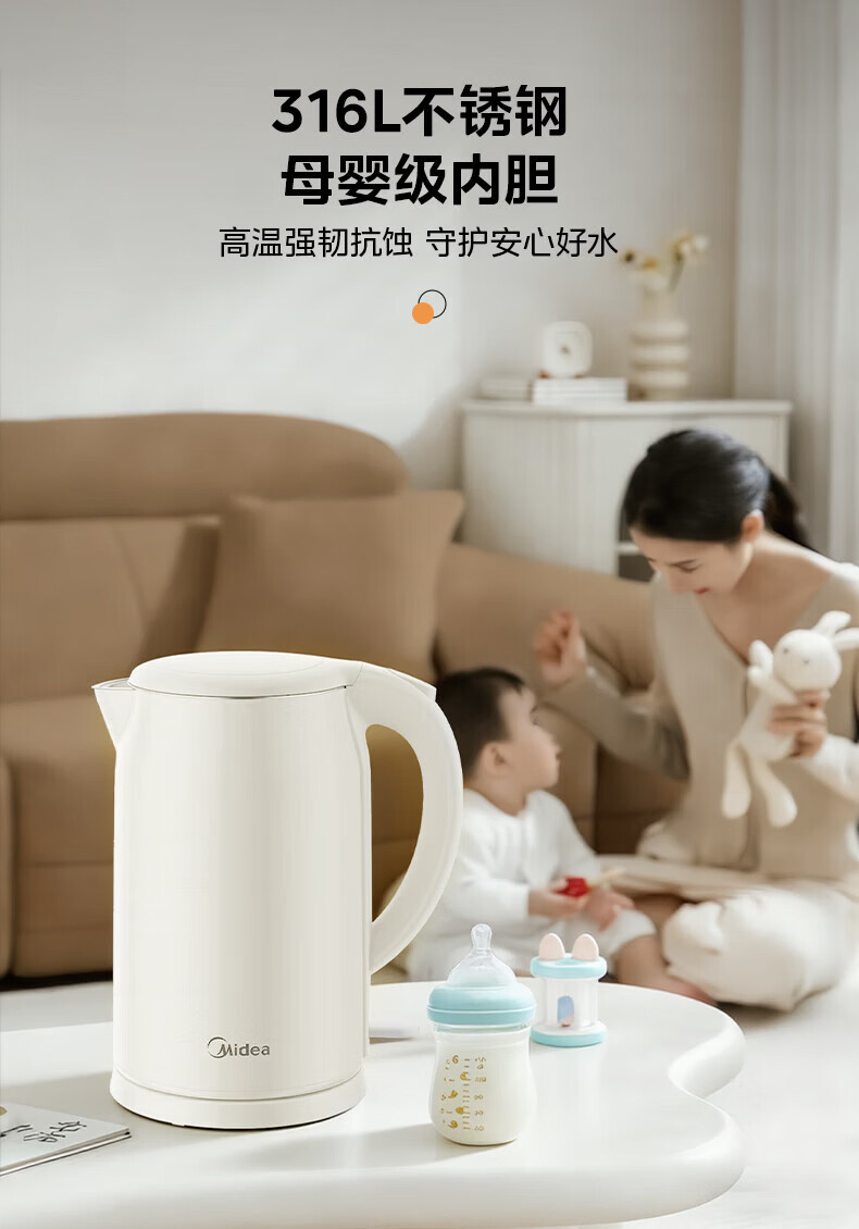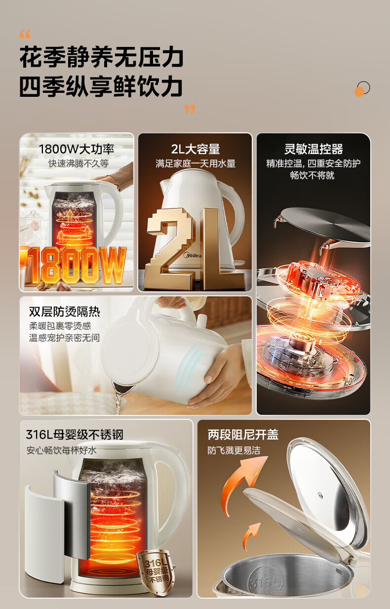 美的(Midea)2L大容量电热水壶 1800W家用快速沸腾电水壶烧水壶 不锈钢无缝内胆双层防烫热水壶 2L 【316L不锈钢】