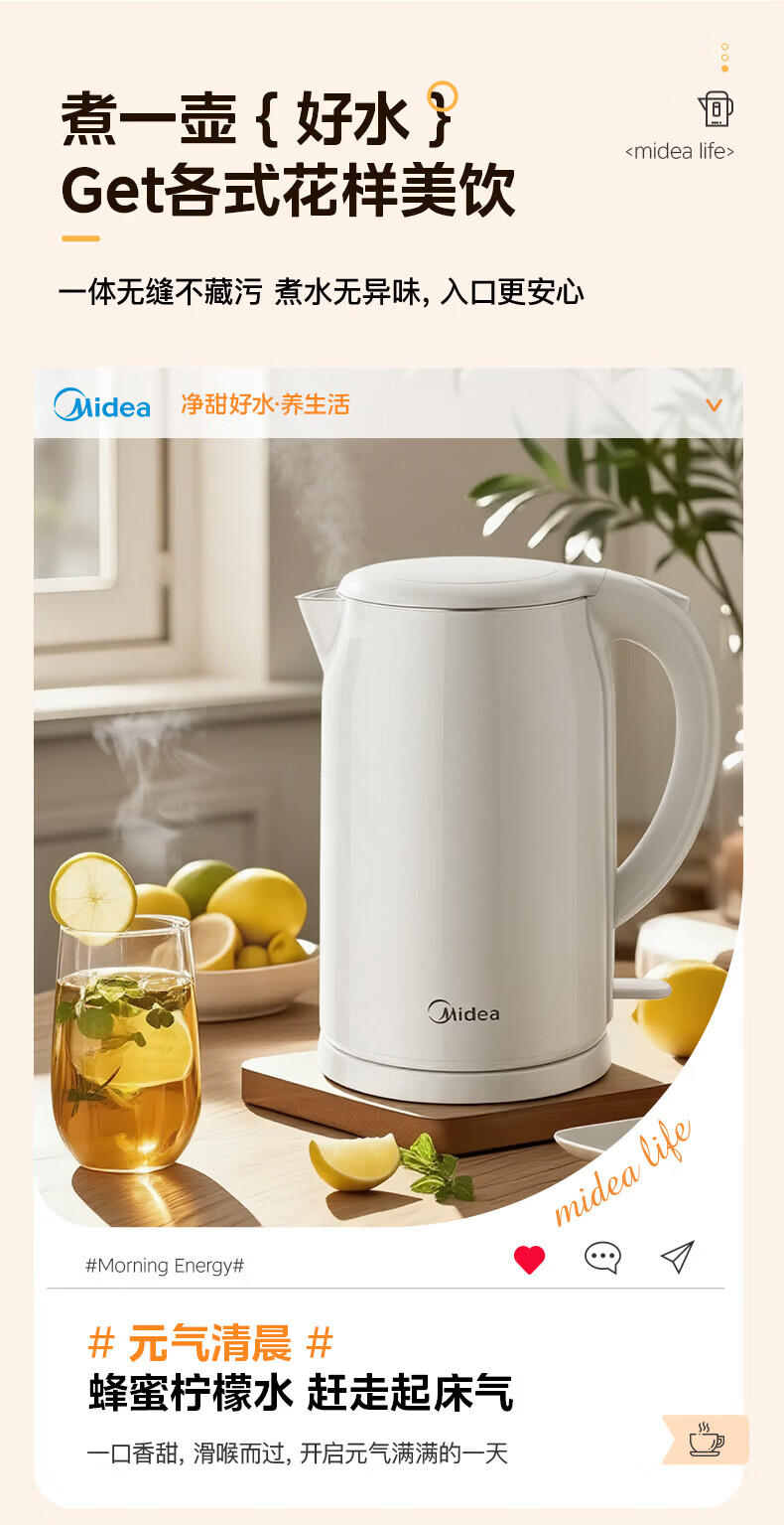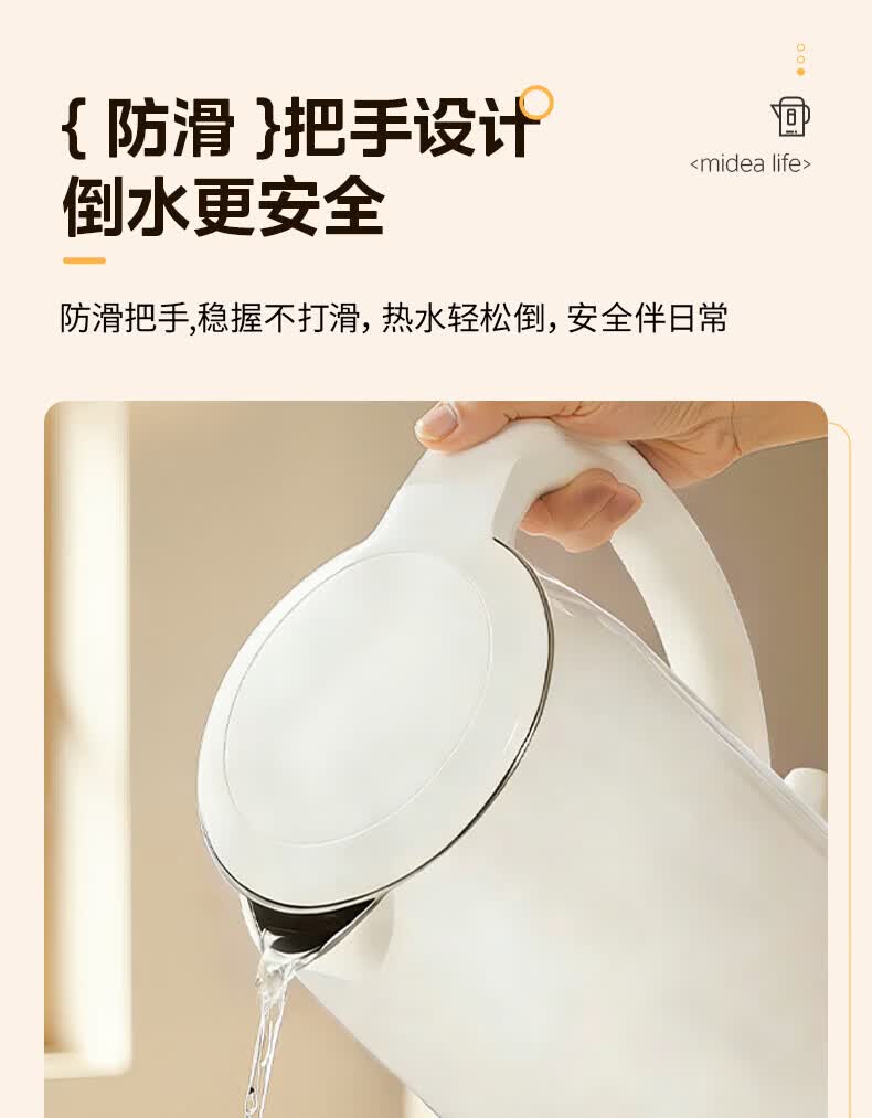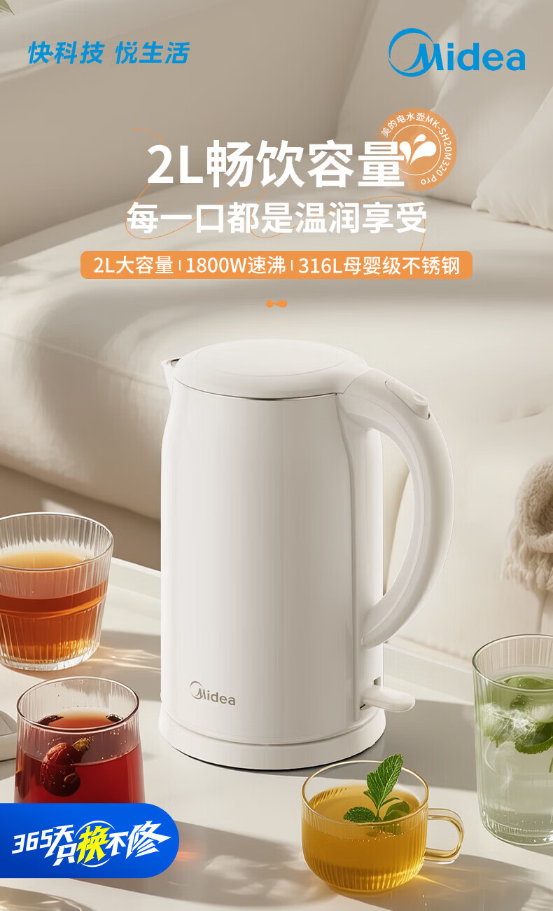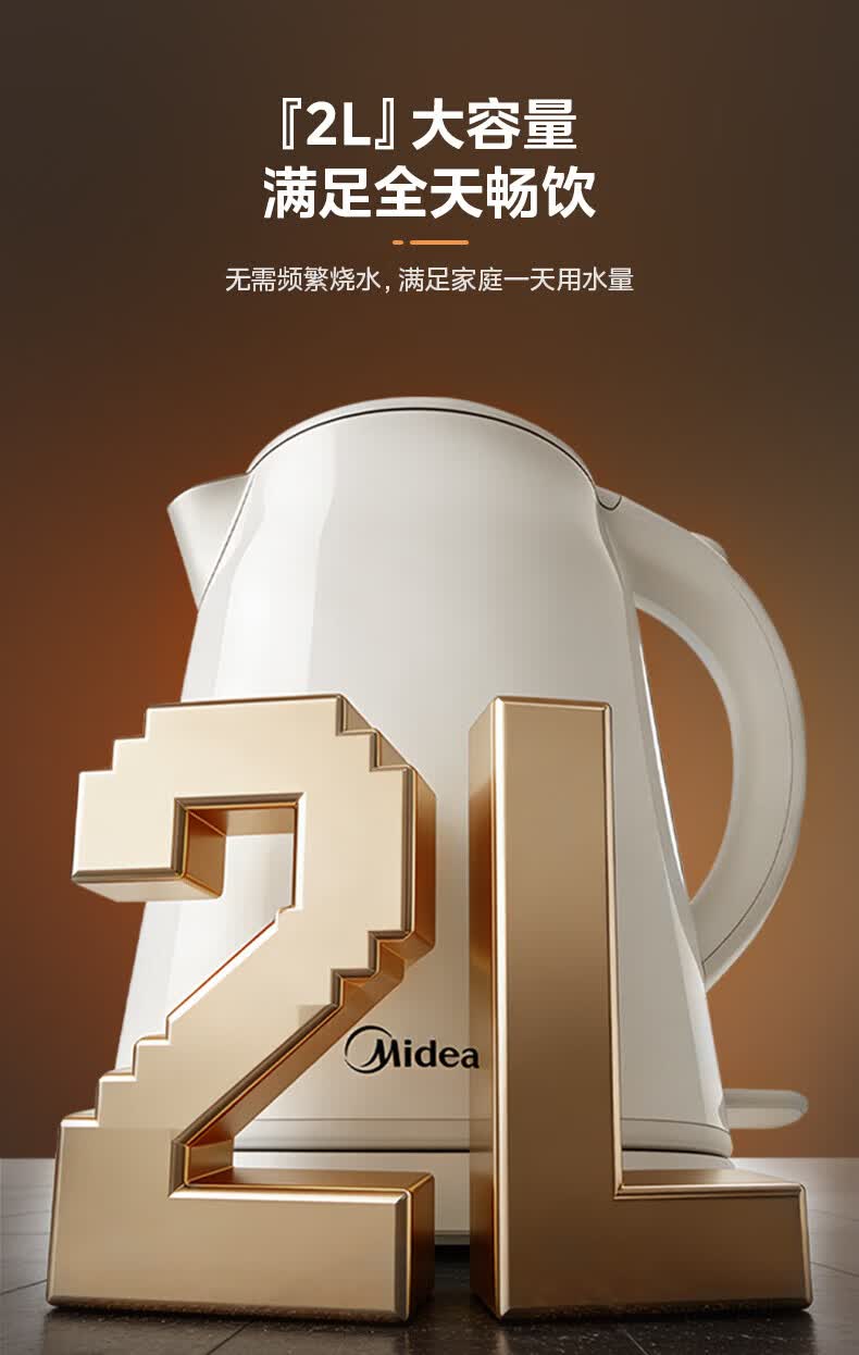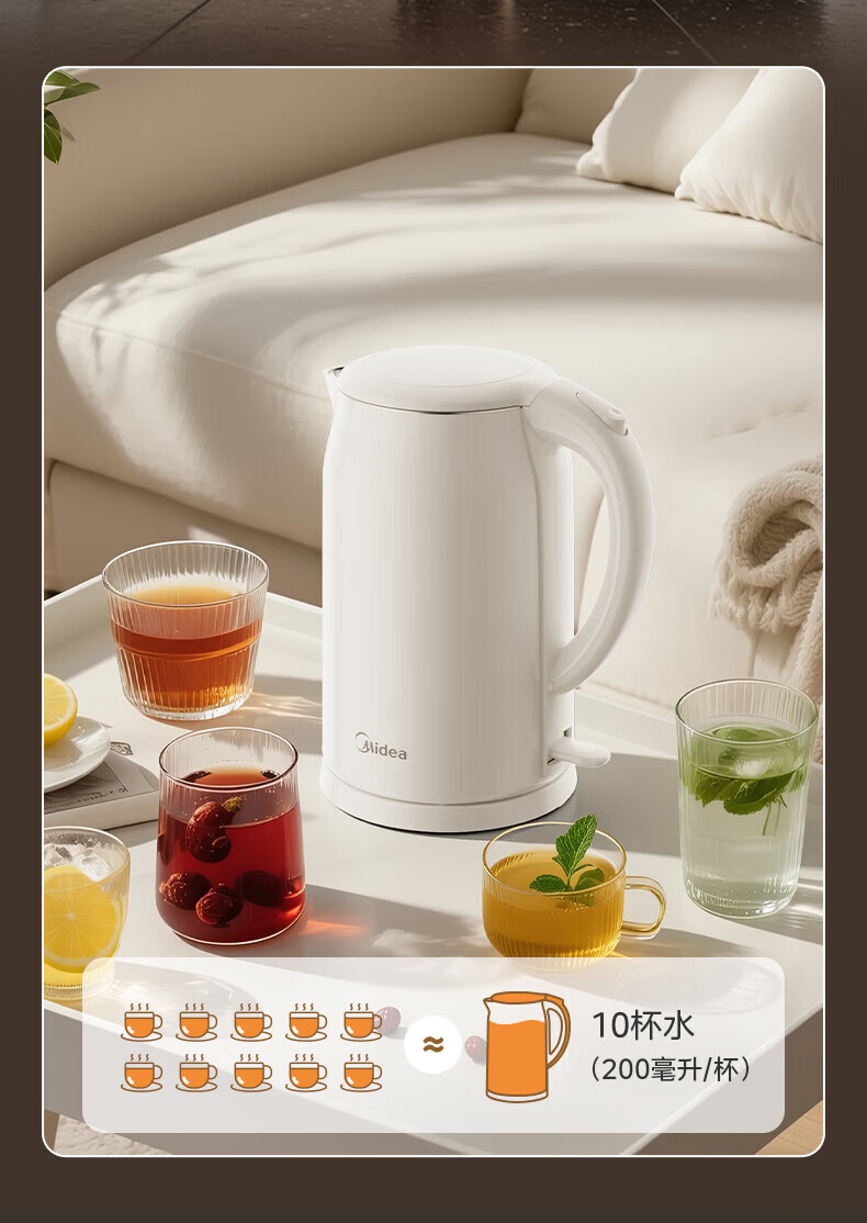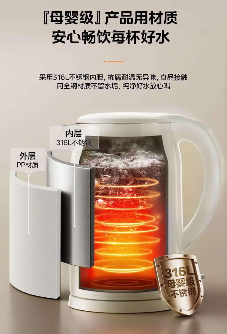 美的(Midea)2L大容量电热水壶 1800W家用快速沸腾电水壶烧水壶 不锈钢无缝内胆双层防烫热水壶 2L 【316L不锈钢】