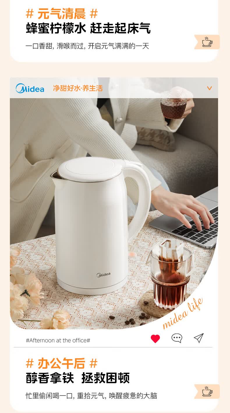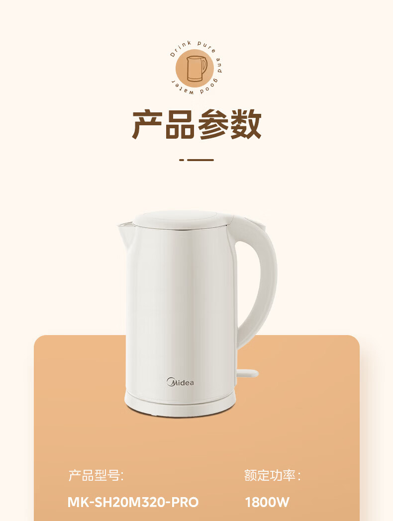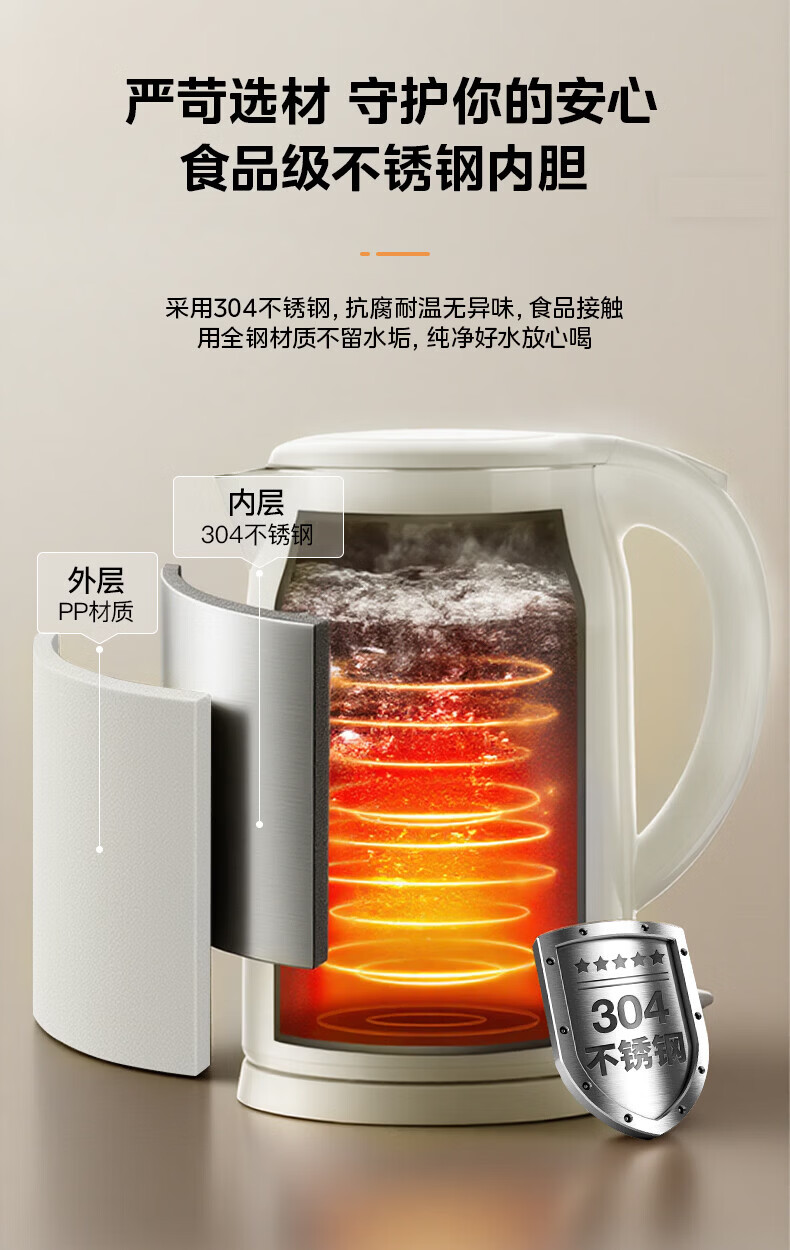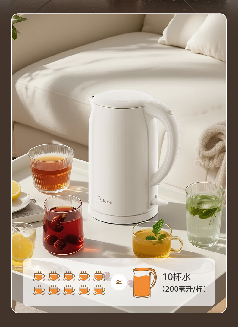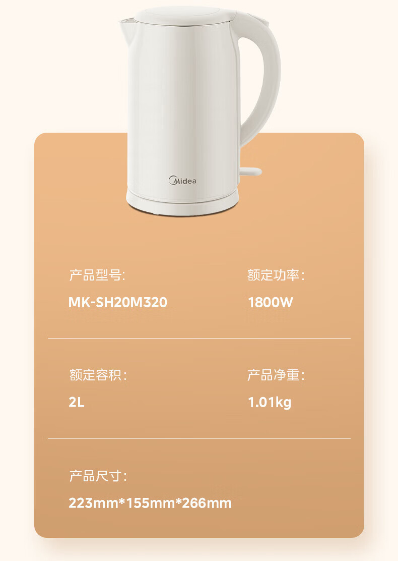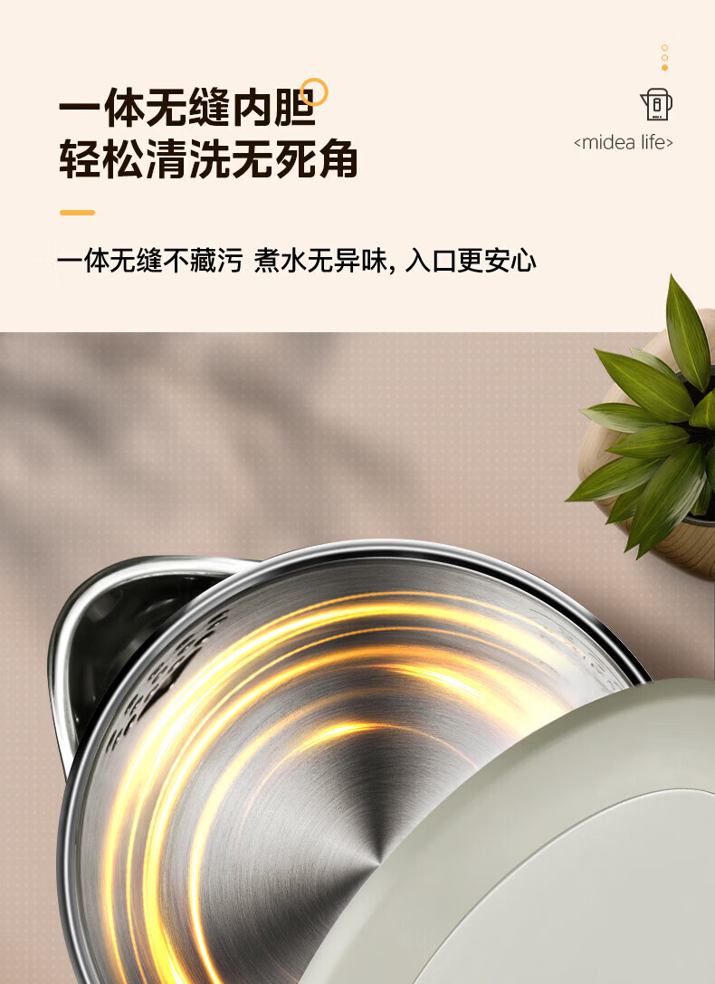 美的(Midea)2L大容量电热水壶 1800W家用快速沸腾电水壶烧水壶 不锈钢无缝内胆双层防烫热水壶 2L 【316L不锈钢】