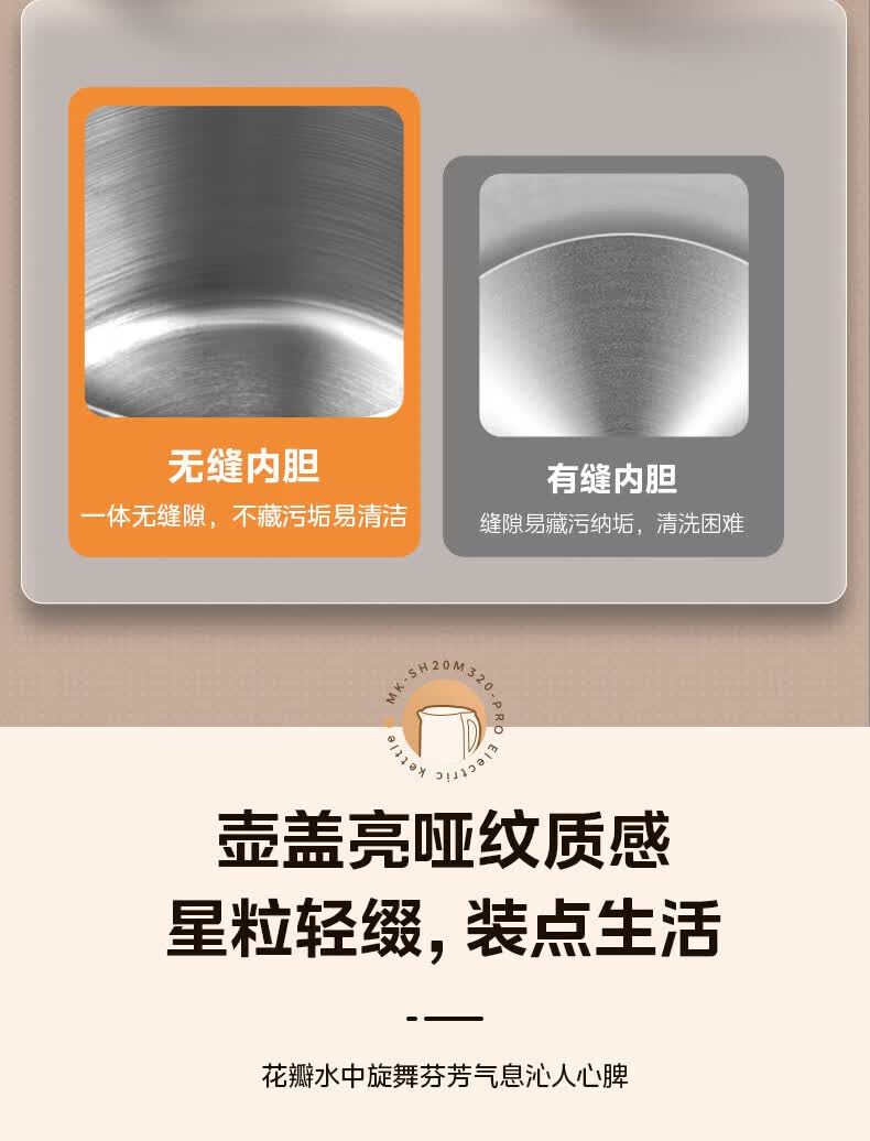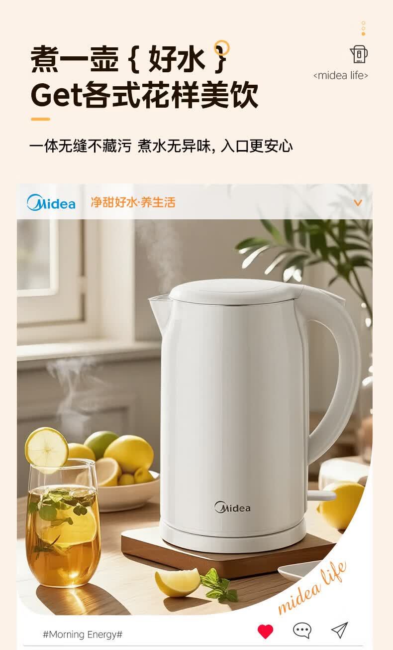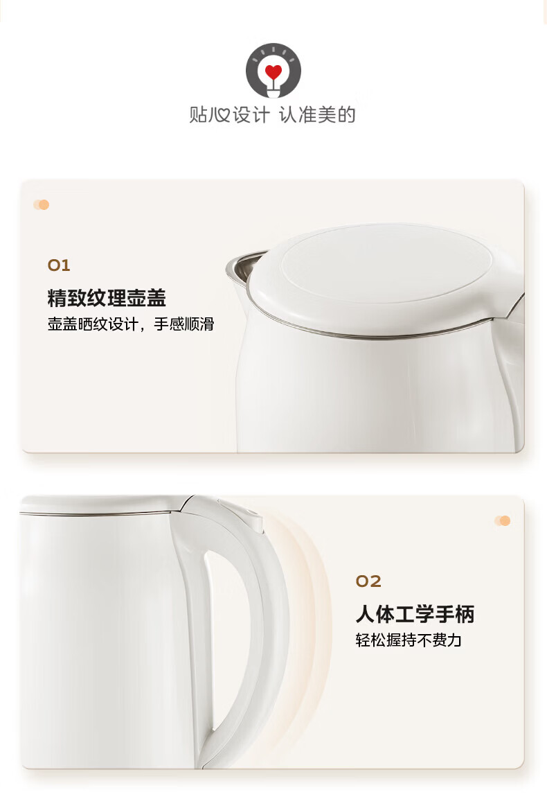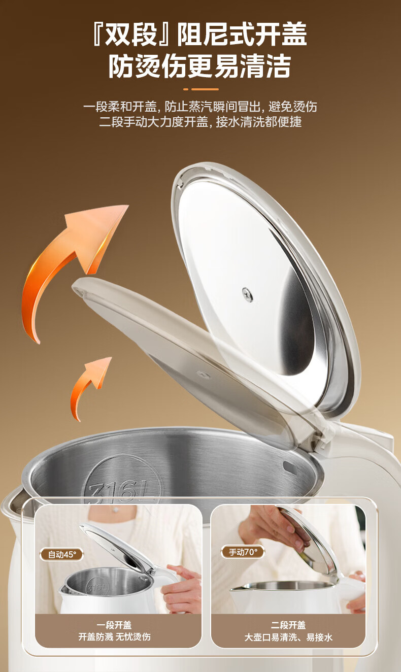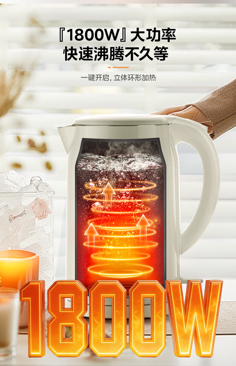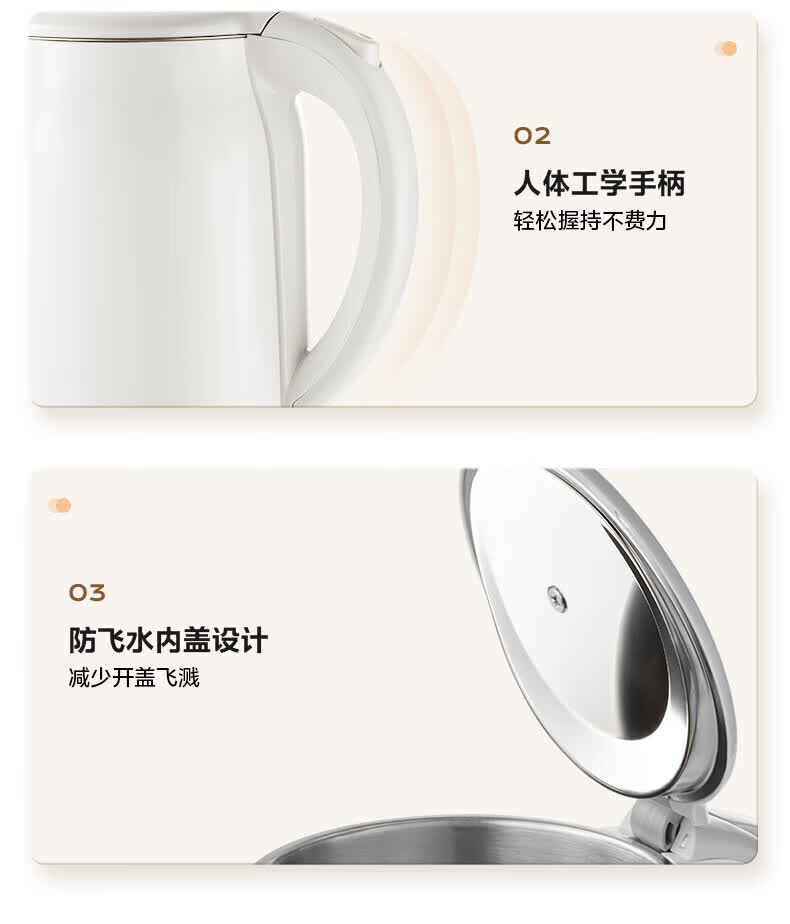 美的(Midea)2L大容量电热水壶 1800W家用快速沸腾电水壶烧水壶 不锈钢无缝内胆双层防烫热水壶 2L 【316L不锈钢】